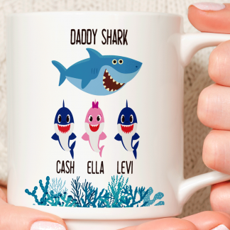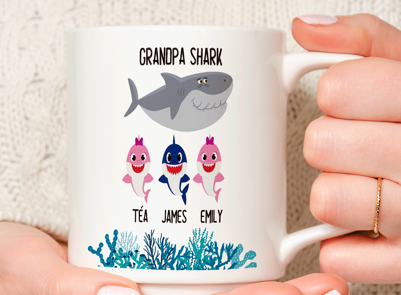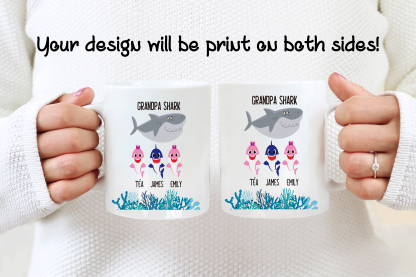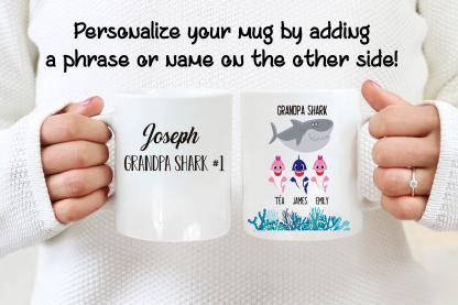 Your customized mug will be print on both sides, and you can choose to put in the back a name, phrase, or both as in the pictures. Please help us by providing us as much information as possible in the personalized text box. Please type the name(s) for each child and the color for each little shark in that box. We will take care of the rest. This grandpa shark mug is your funny gift, so you get to design it as you wish!