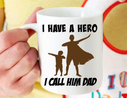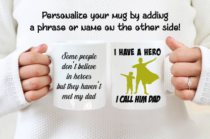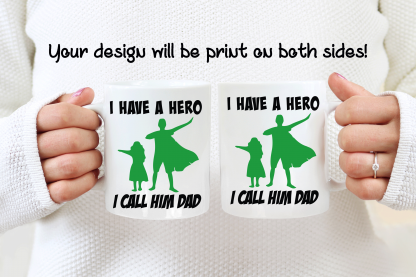 Your I have a hero mug is a custom mug where you choose if a baby girl or baby boy will accompany him. You can also change the color to his favorite one! By default, we will print your design on both sides. It’s a personalized Father’s Day mug where you can add a name or phrase to the mug’s back, as in the pictures! If you do so, please help us by specifying the text with the font number you want. We will take care of the rest!