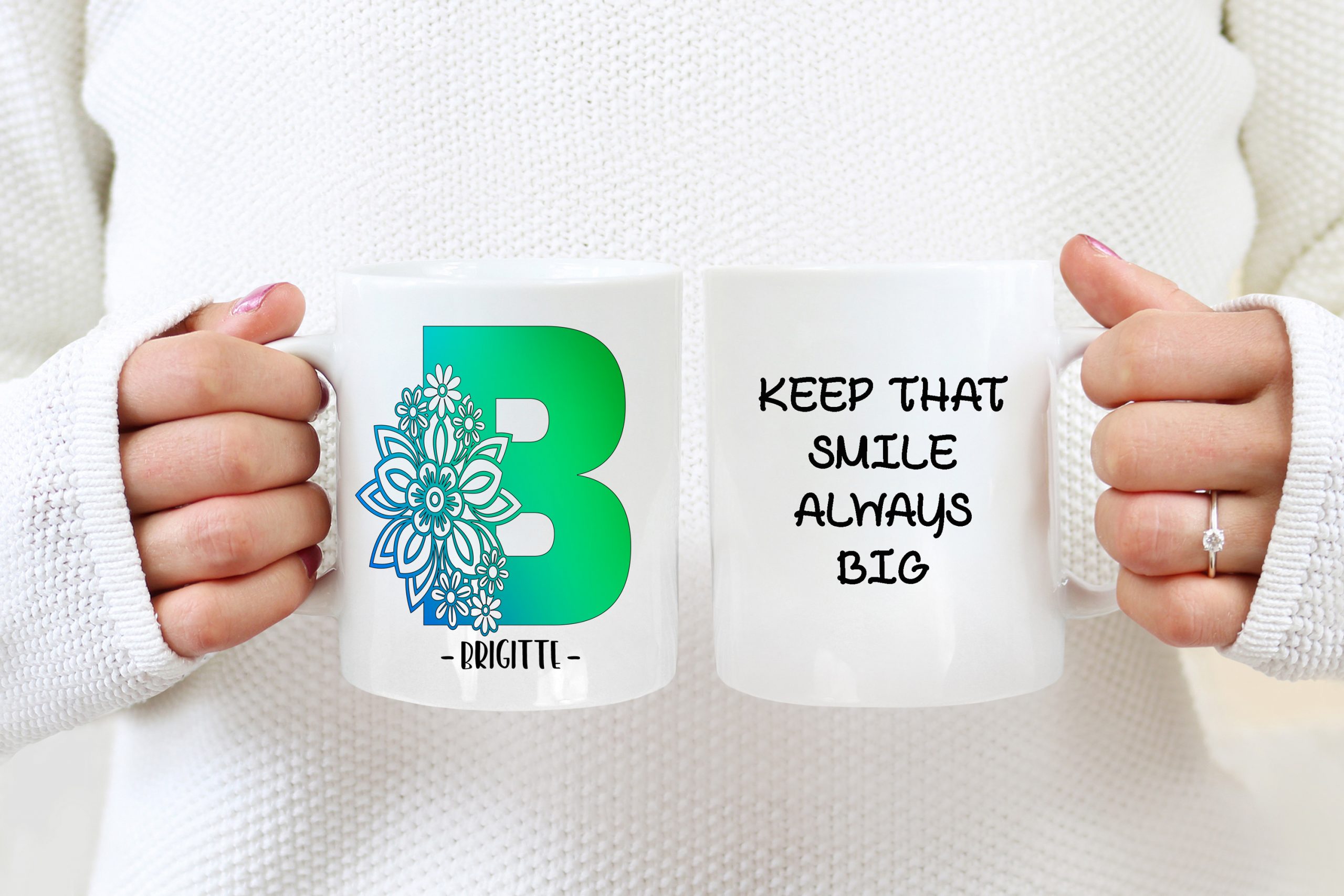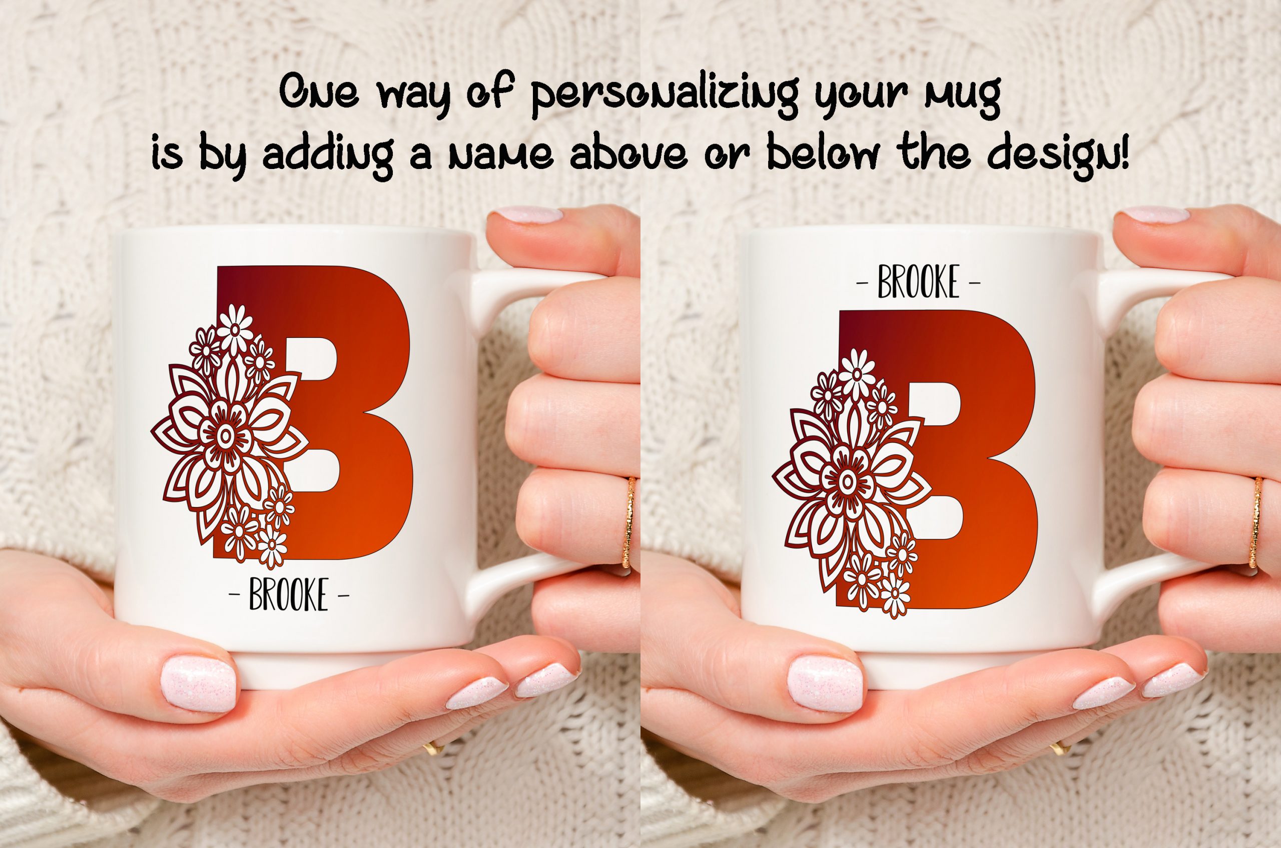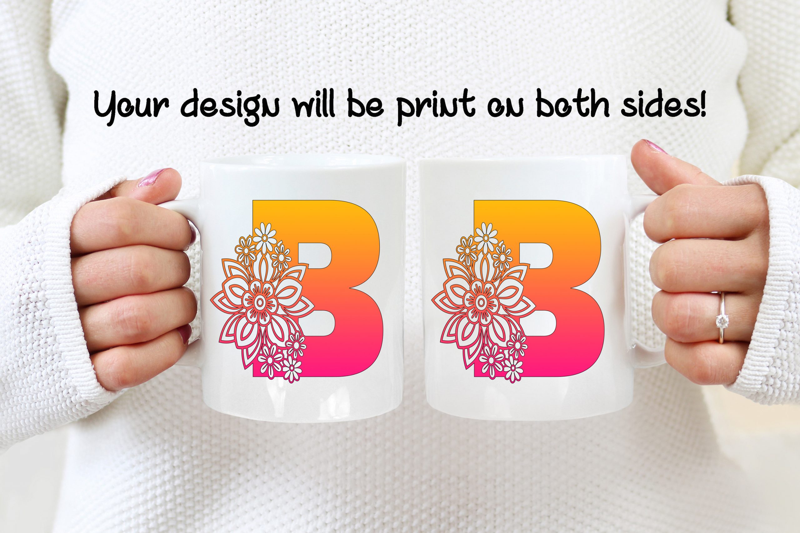 The floral letter alphabet mug is a double side printed customized mug where you can choose any of the 4 B’s letter designs. You can add in the mug’s back a name, phrase, or both. You can also add the name at the bottom or top of the letter B, as in the pictures. It’s your personalized mug, so you get to design your custom mug as you wish! Please help us by providing us as much information as possible in the personalized text box. We will take care of the rest!