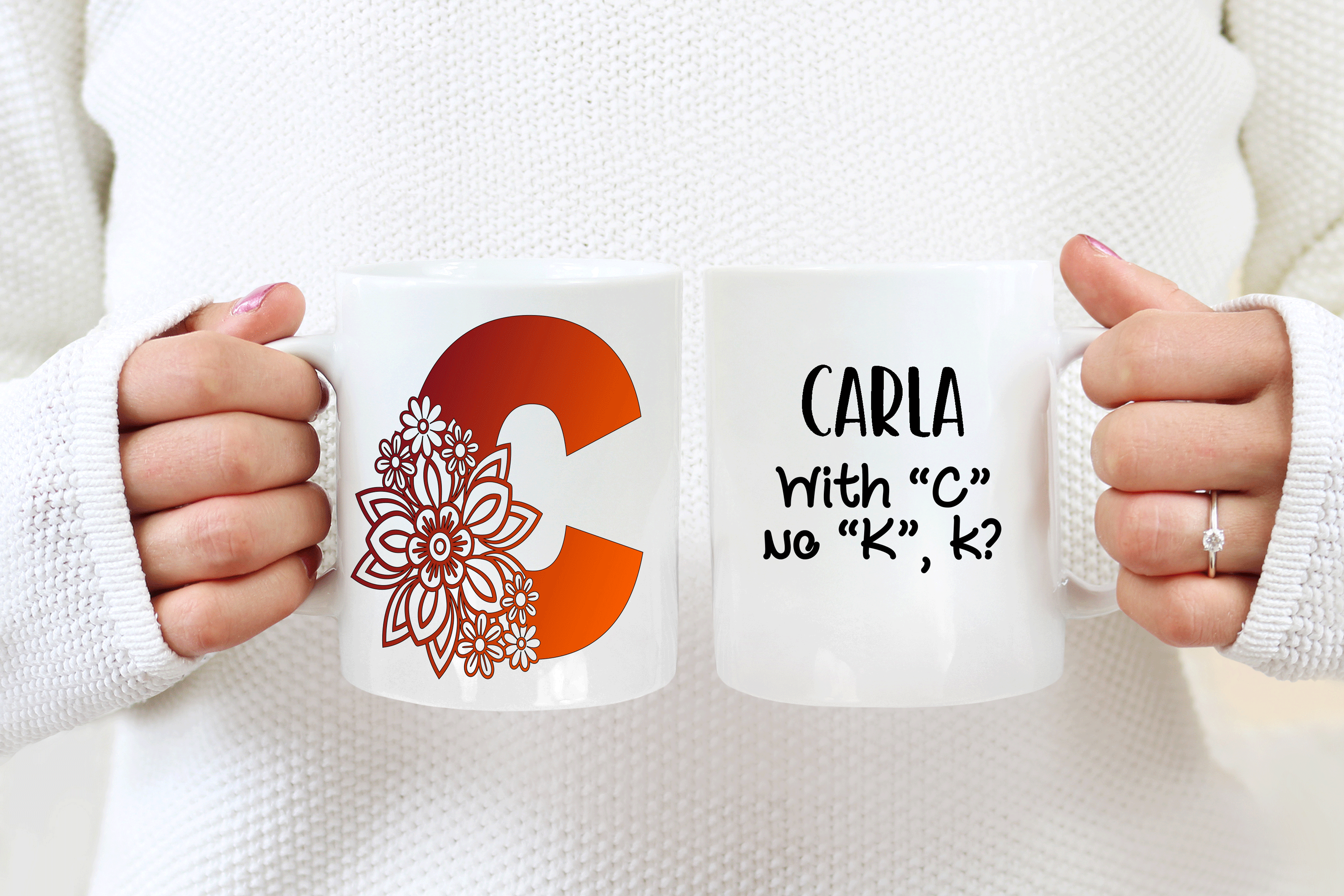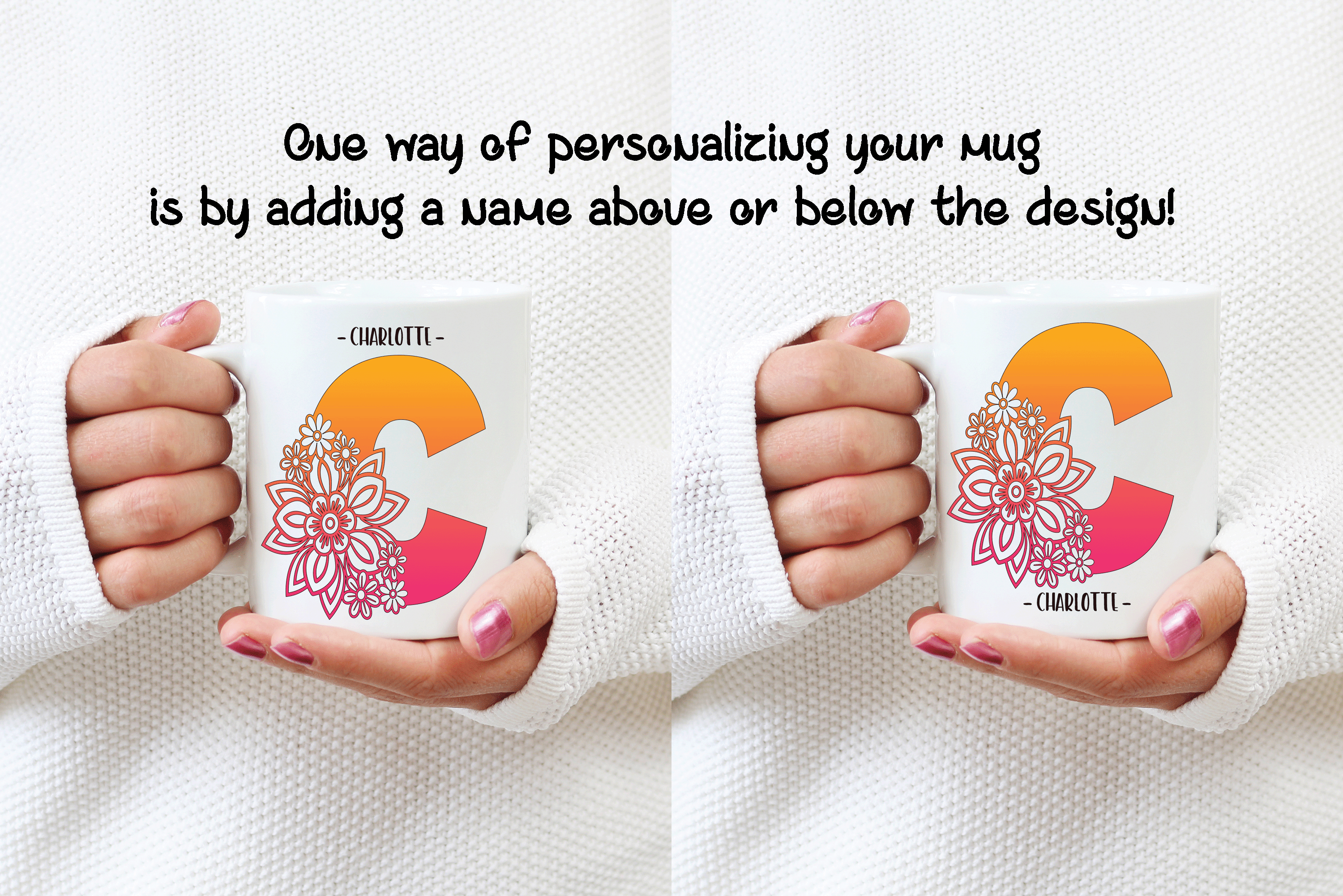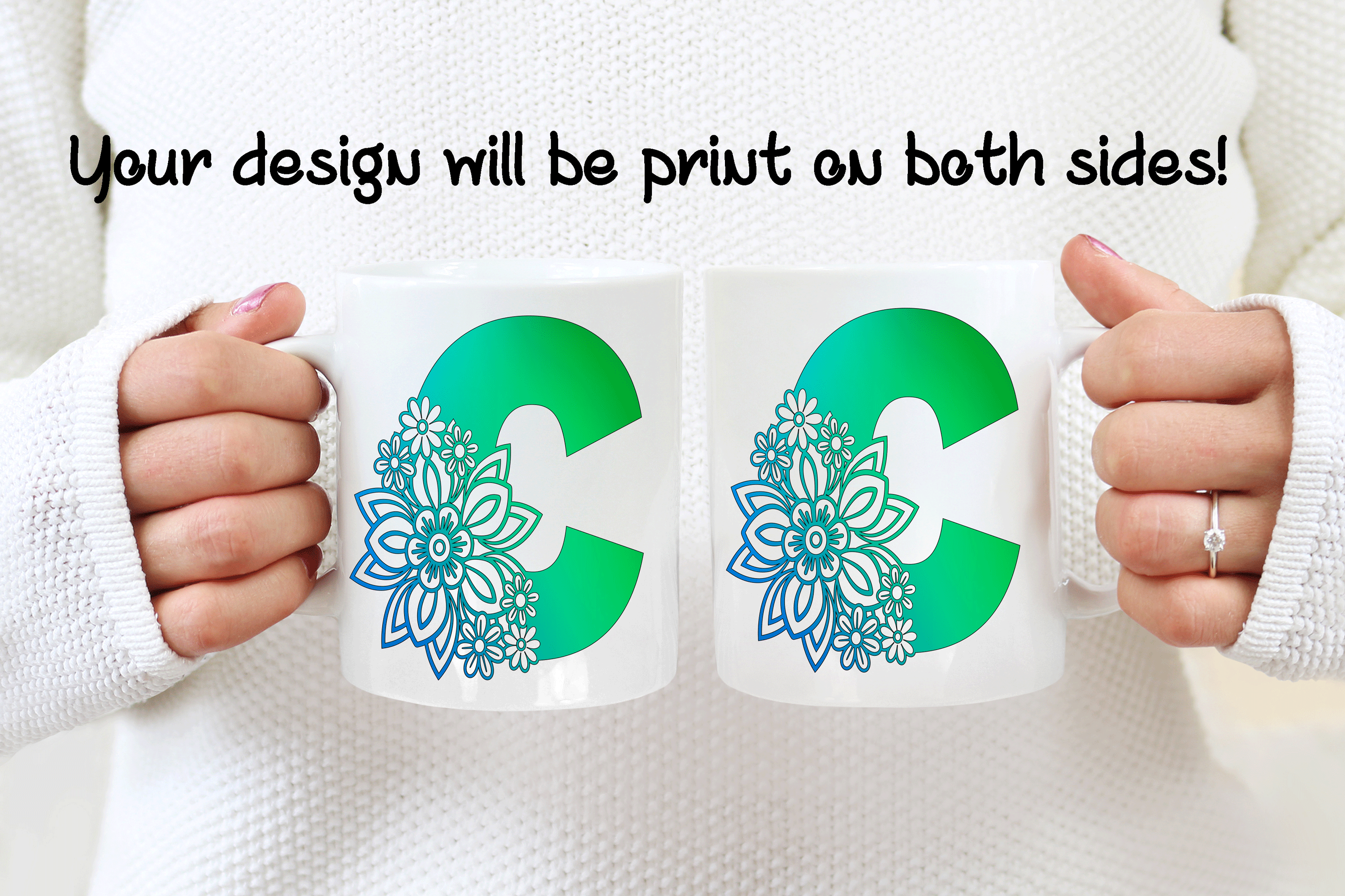 The floral letter alphabet mug is a double side printed customized mug where you can choose any of the 4 C’s letter designs. You can add in the mug’s back a name, phrase, or both. You can also add the name at the bottom or top of the letter C, as in the pictures. It’s your personalized mug, so you get to design your custom mug as you wish! Please help us by providing us as much information as possible in the personalized text box. We will take care of the rest!