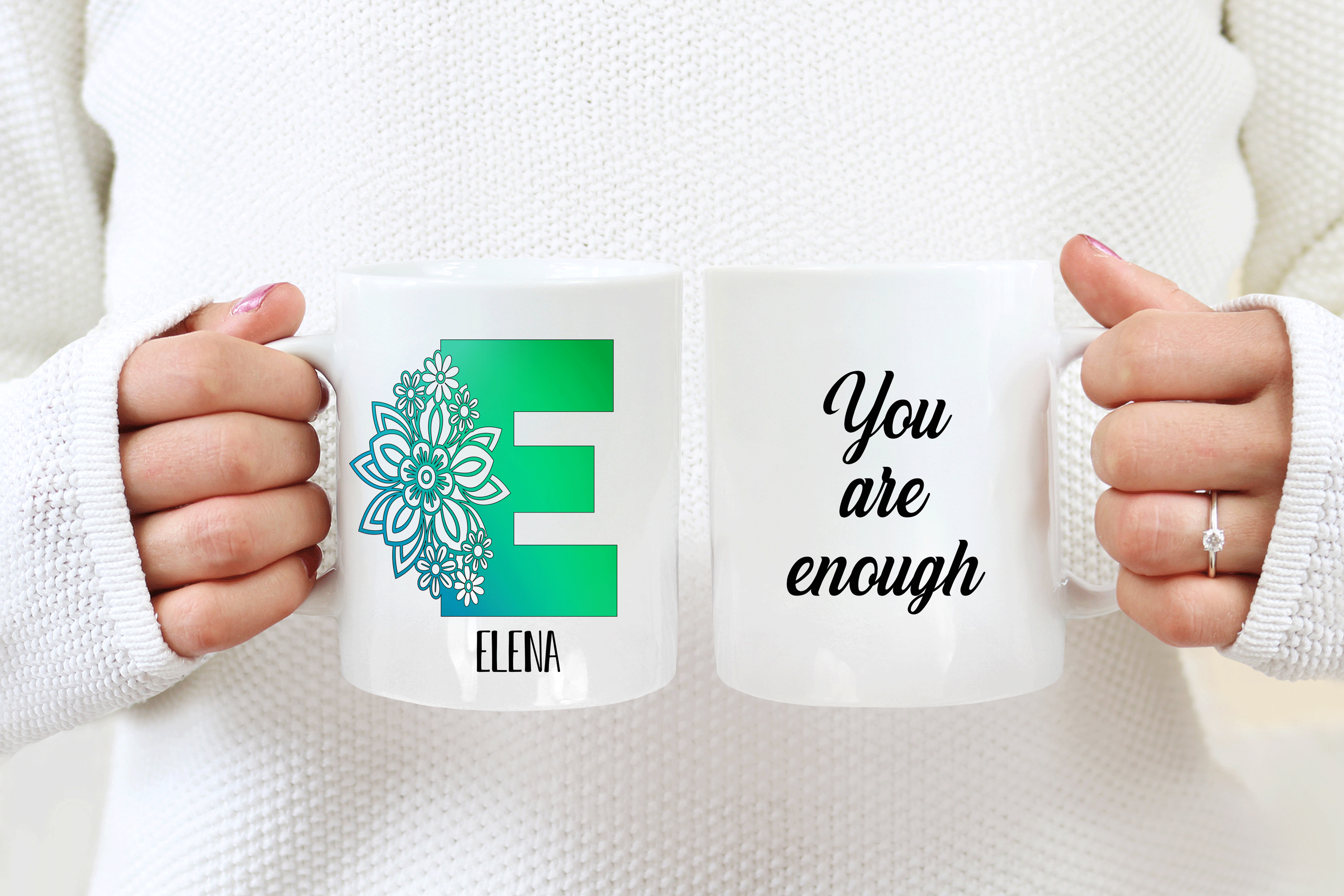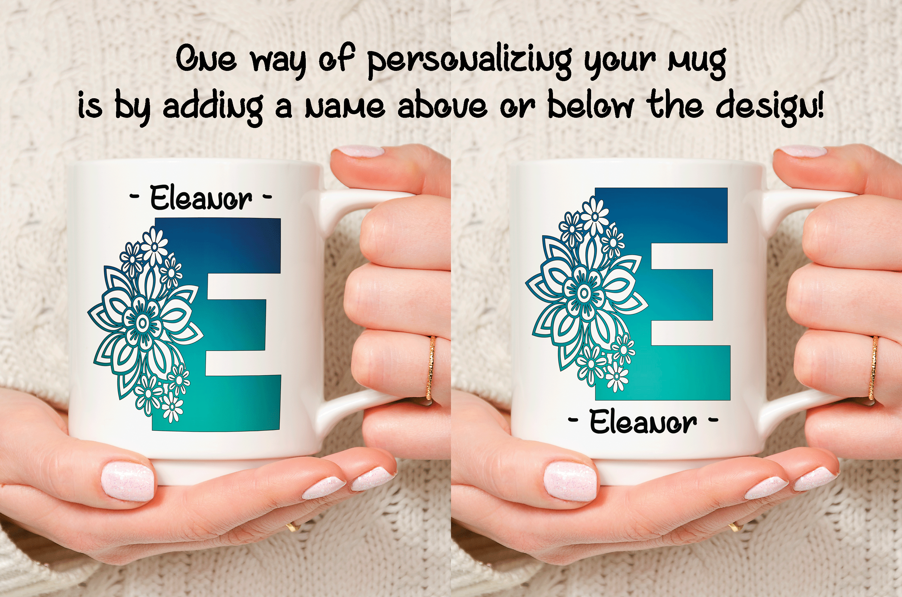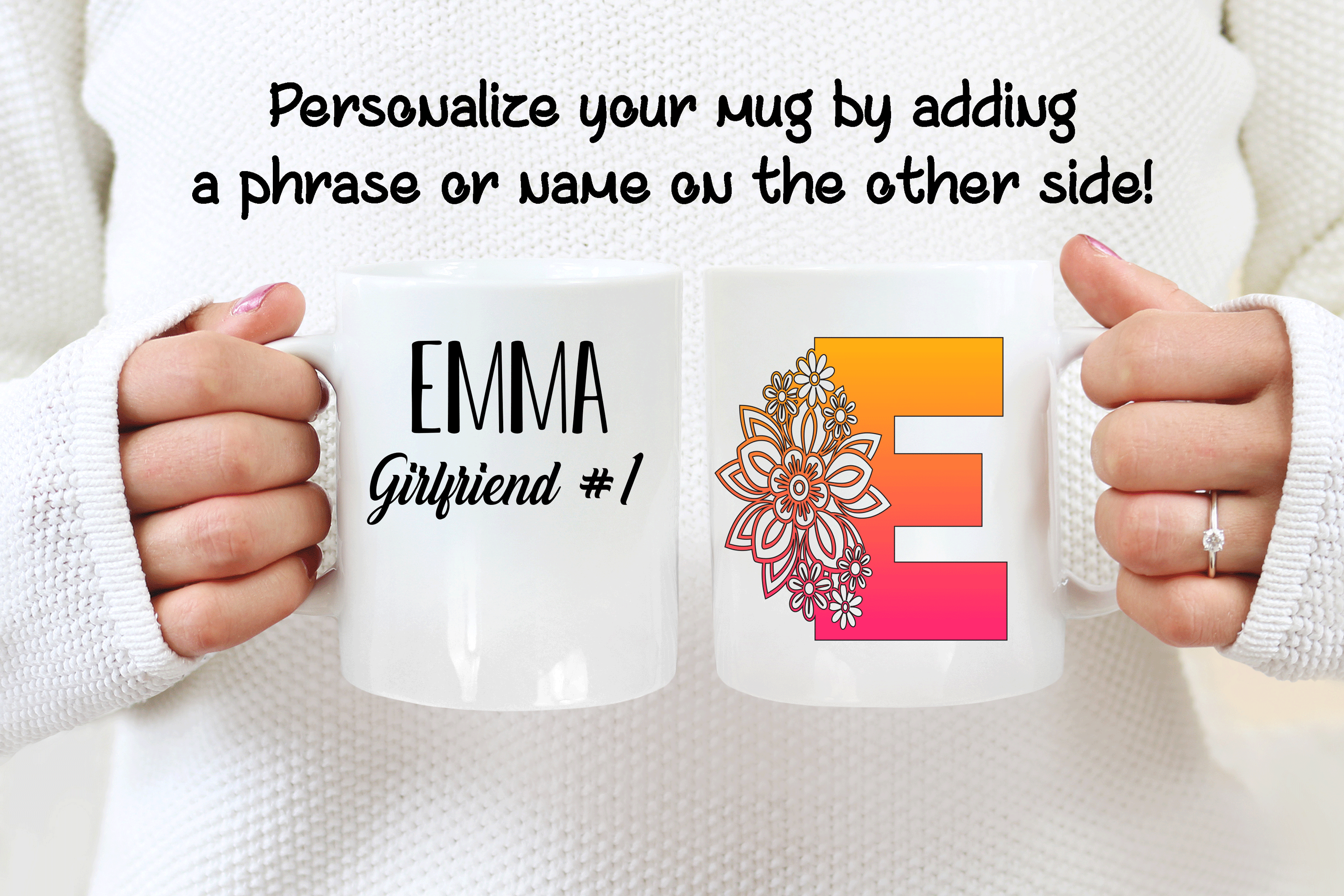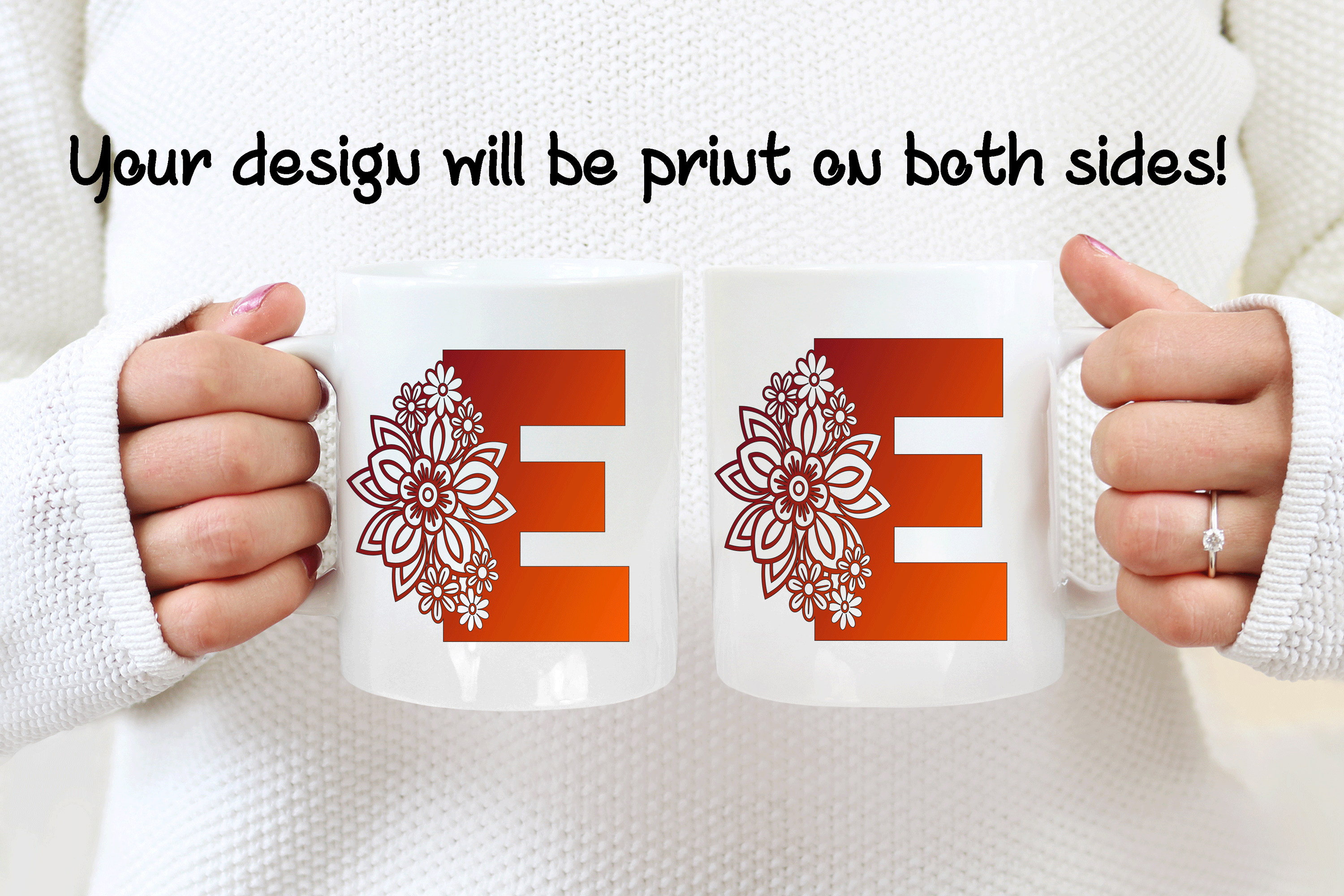 The floral letter alphabet mug is a double side printed customized mug where you can choose any of the 4 E’s letter designs. You can add in the mug’s back a name, phrase, or both. You can also add the name at the bottom or top of the letter E, as in the pictures. It’s your personalized mug, so you get to design your custom mug as you wish! Please help us by providing us as much information as possible in the personalized text box. We will take care of the rest!