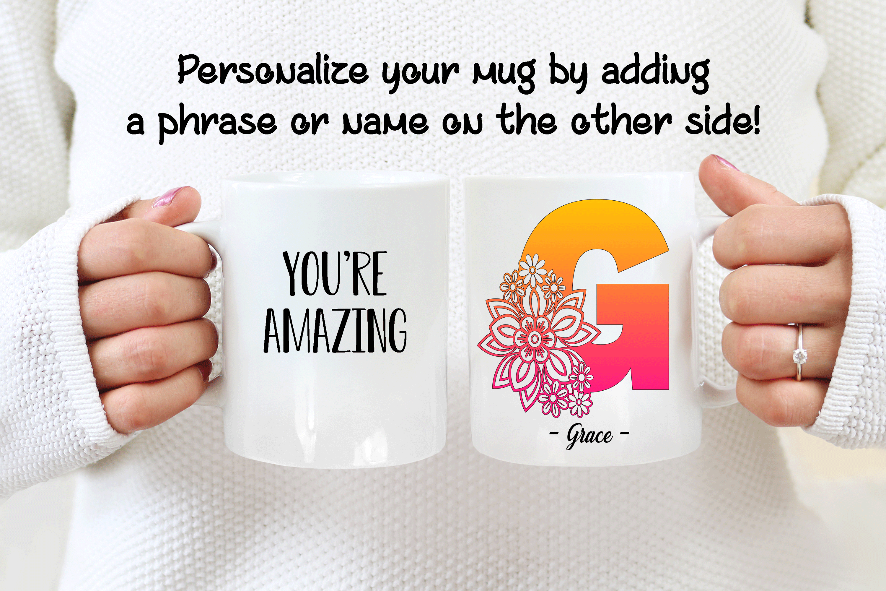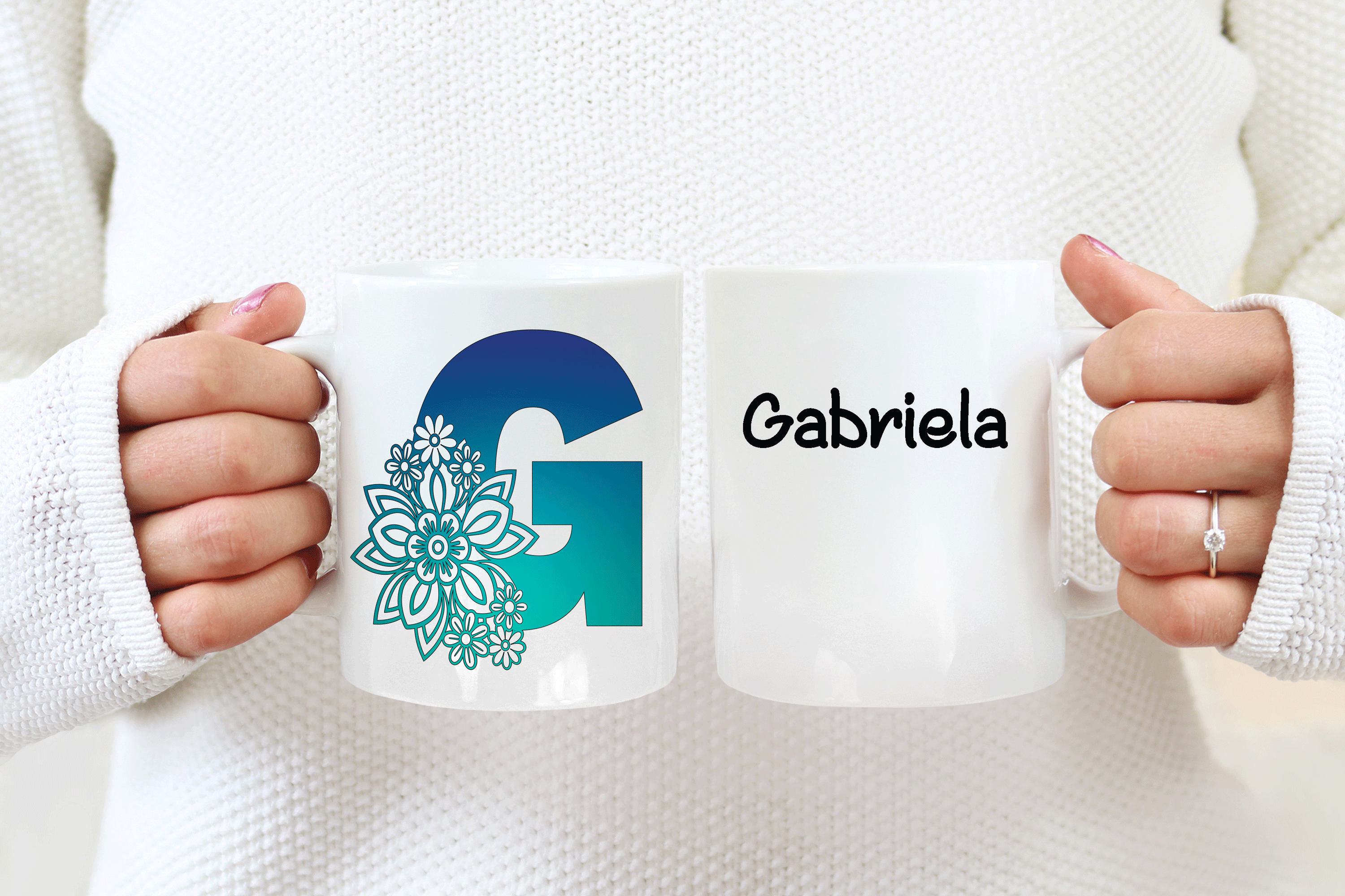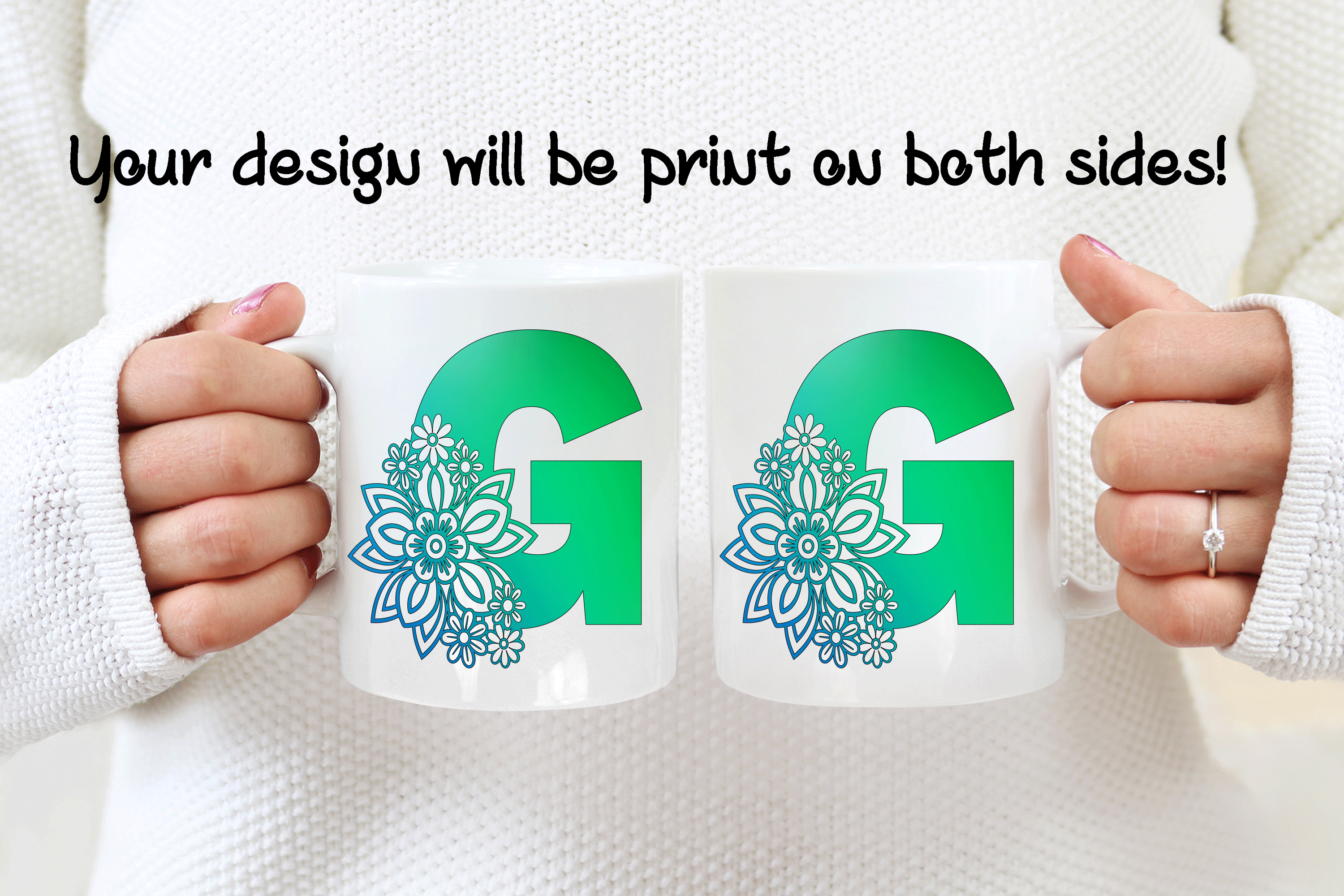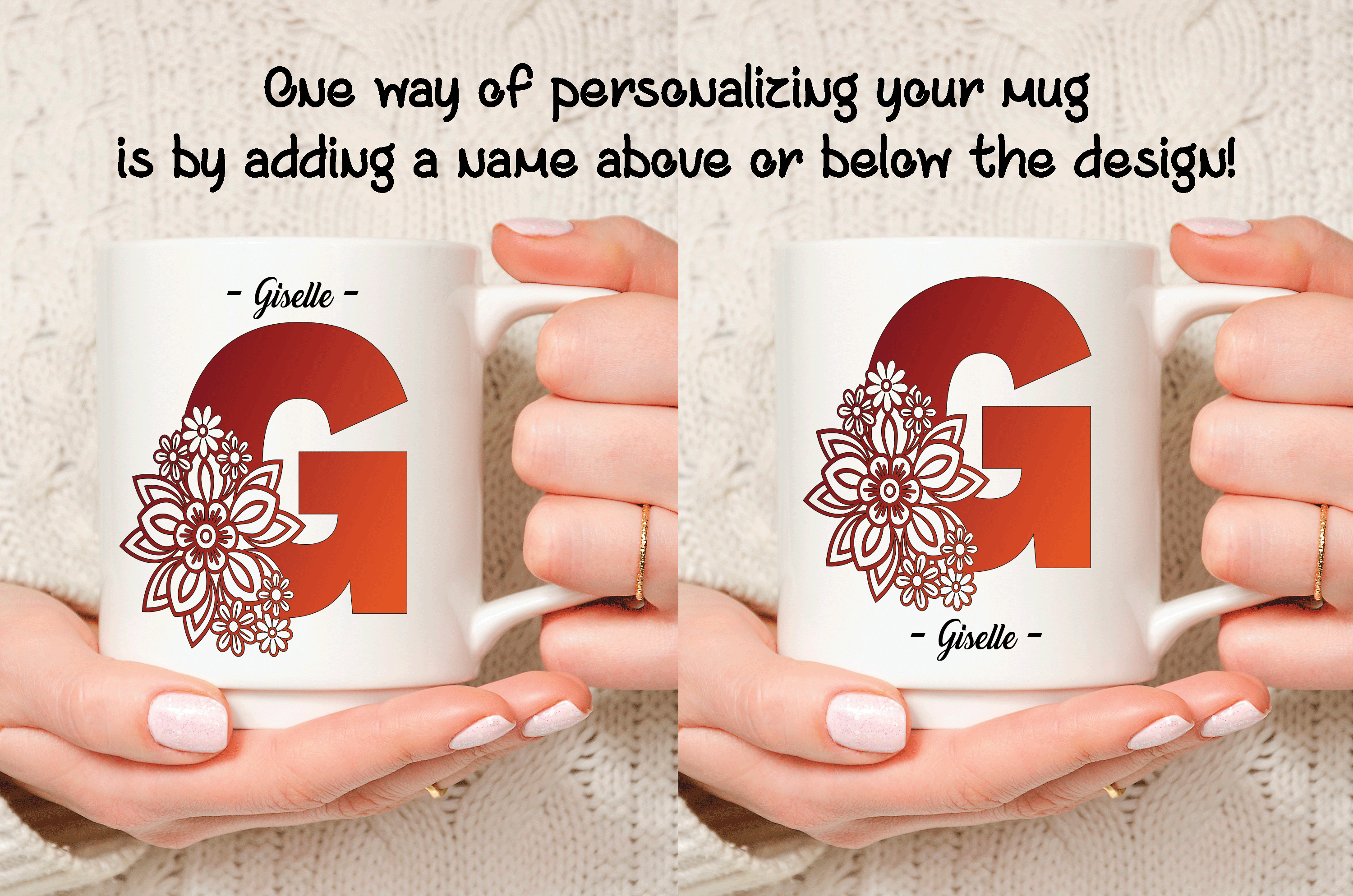 | The floral letter alphabet mug is a double side printed customized mug where you can choose any of the 4 G’s letter designs. You can add in the mug’s back a name, phrase, or both. You can also add the name at the bottom or top of the letter G, as in the pictures. It’s your personalized mug, so you get to design your custom mug as you wish! Please help us by providing us as much information as possible in the personalized text box. We will take care of the rest!