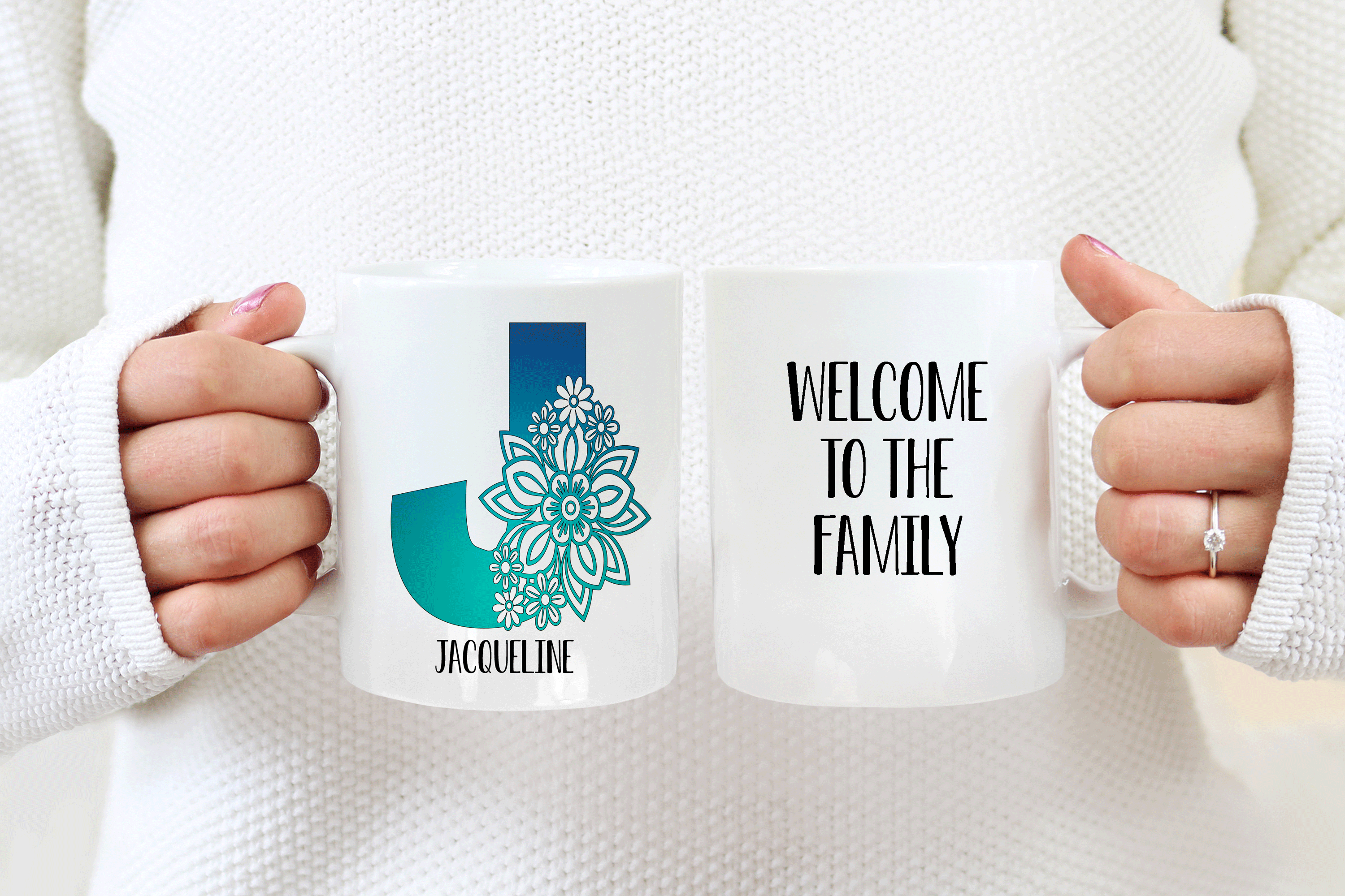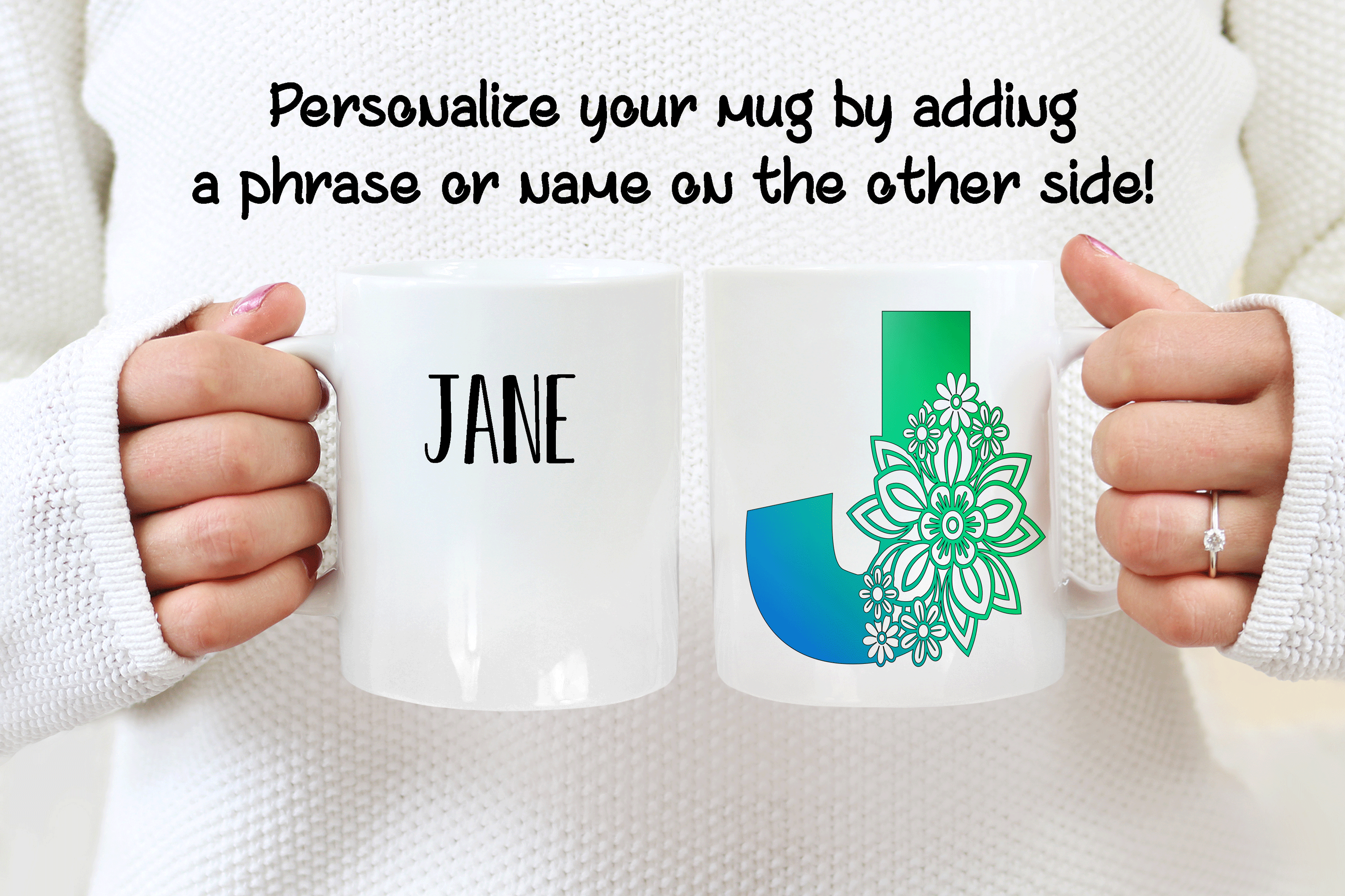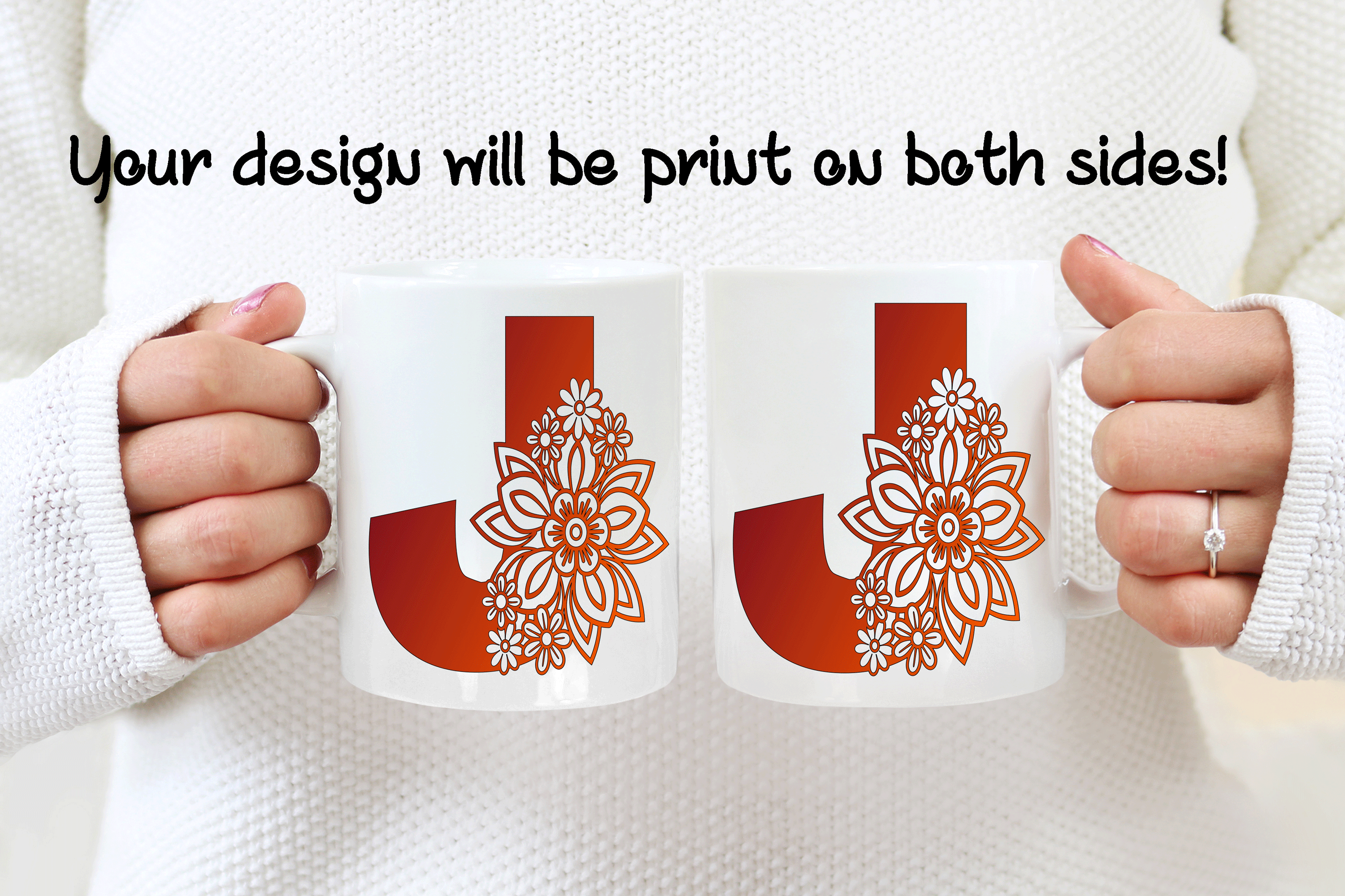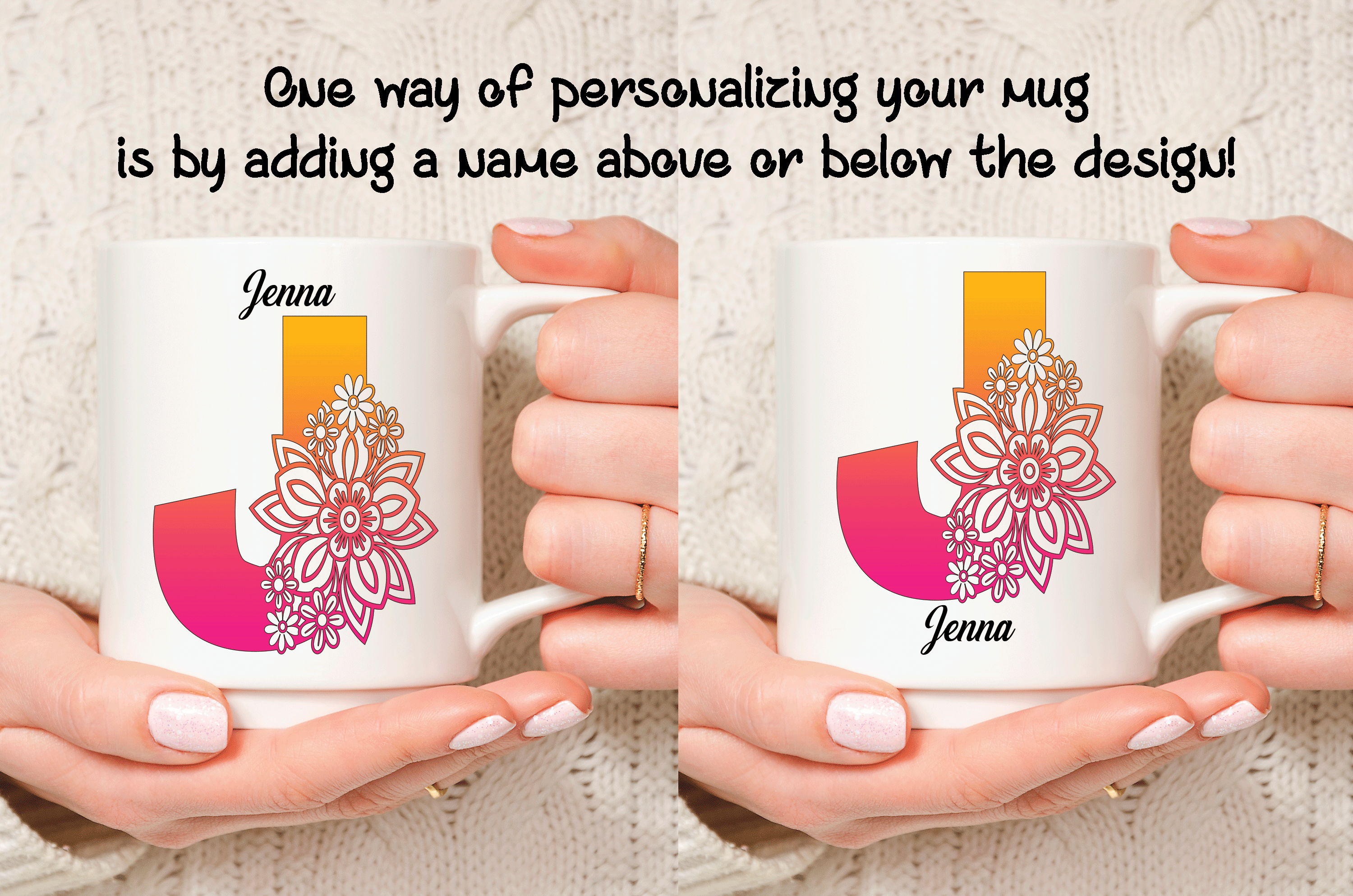 The floral letter alphabet mug is a double side printed customized mug where you can choose any of the 4 J’s letter designs. You can add in the mug’s back a name, phrase, or both. You can also add the name at the bottom or top of the letter J, as in the pictures. It’s your personalized mug, so you get to design your custom mug as you wish! Please help us by providing us as much information as possible in the personalized text box. We will take care of the rest!