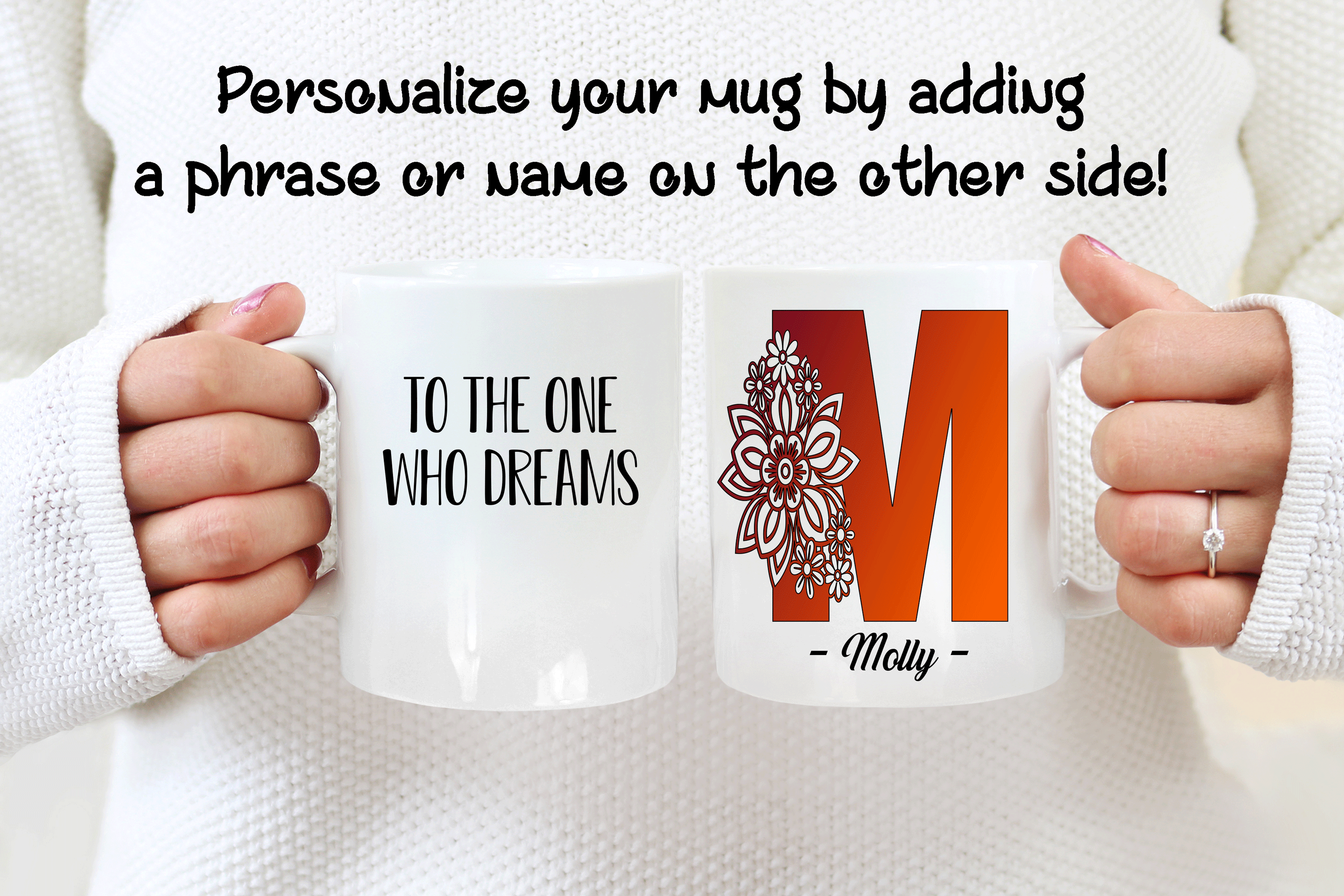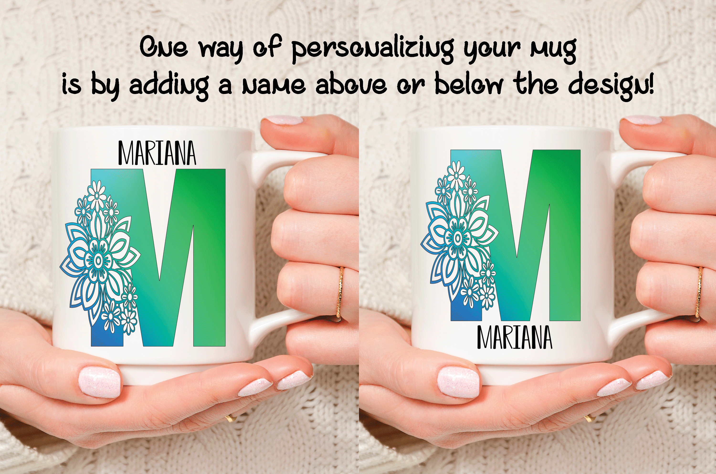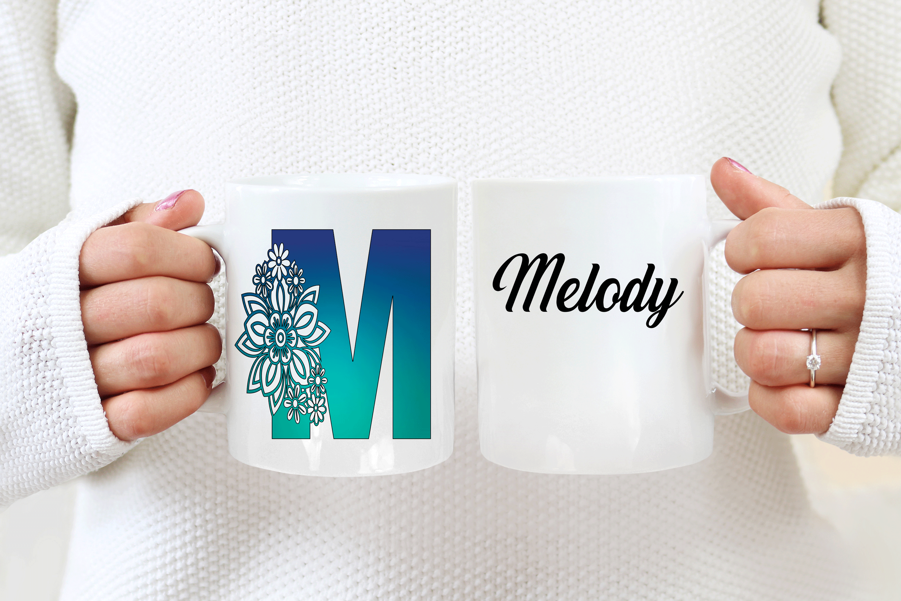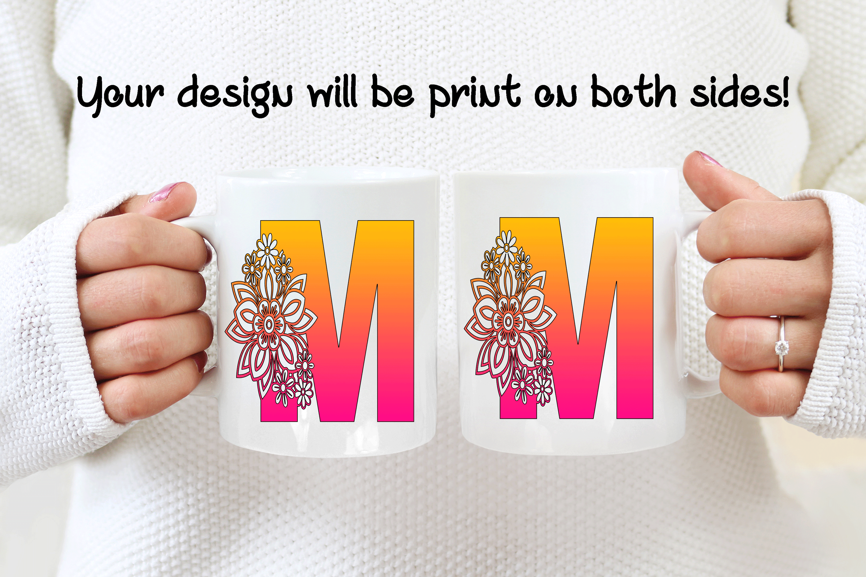 The floral letter alphabet mug is a double side printed customized mug where you can choose any of the 4 M’s letter designs. You can add in the mug’s back a name, phrase, or both. You can also add the name at the bottom or top of the letter M, as in the pictures. It’s your personalized mug, so you get to design your custom mug as you wish! Please help us by providing us as much information as possible in the personalized text box. We will take care of the rest!