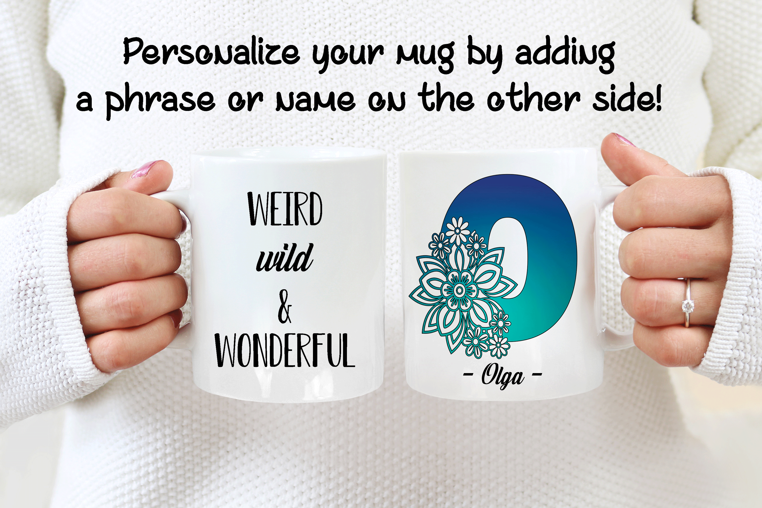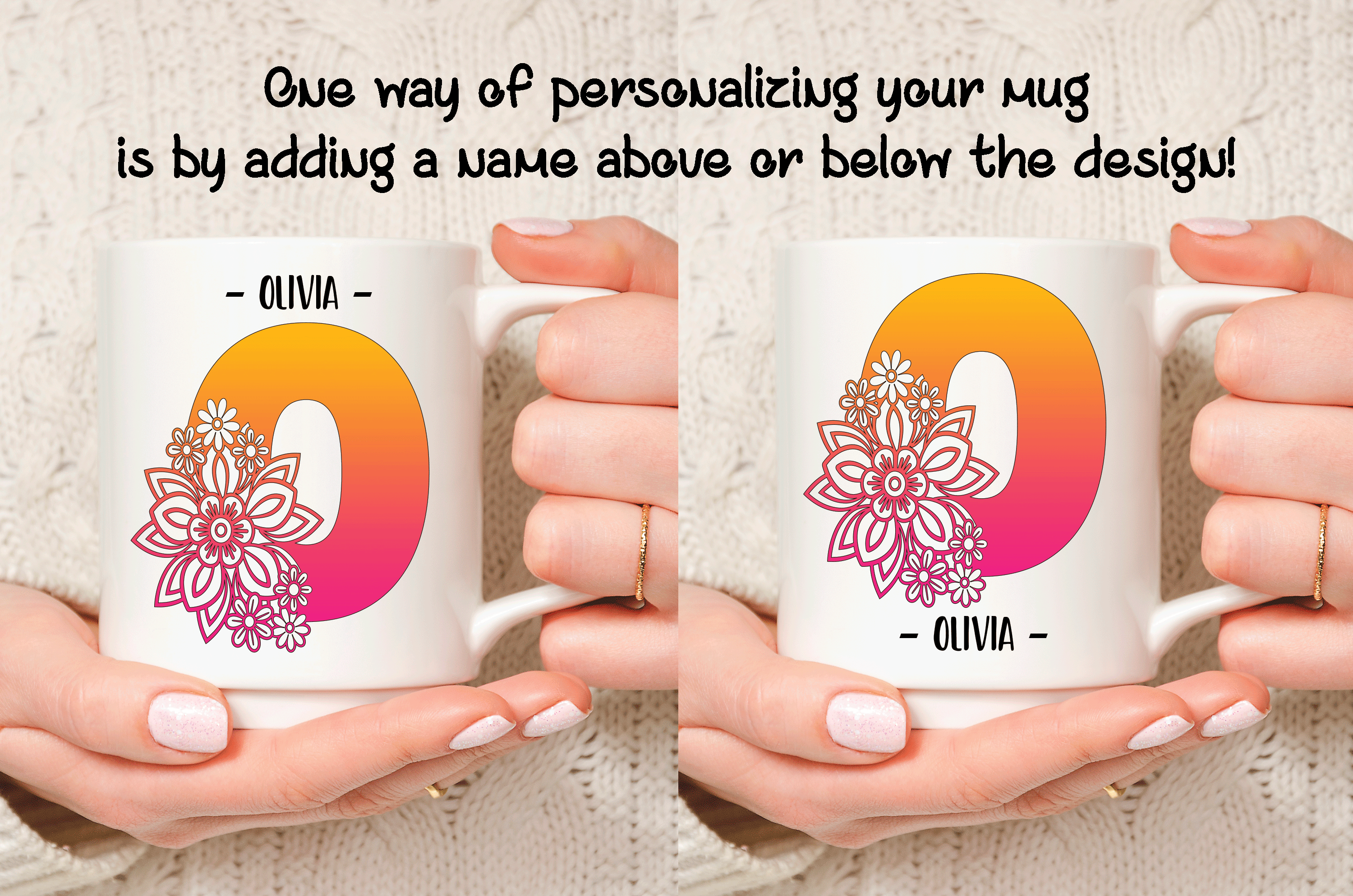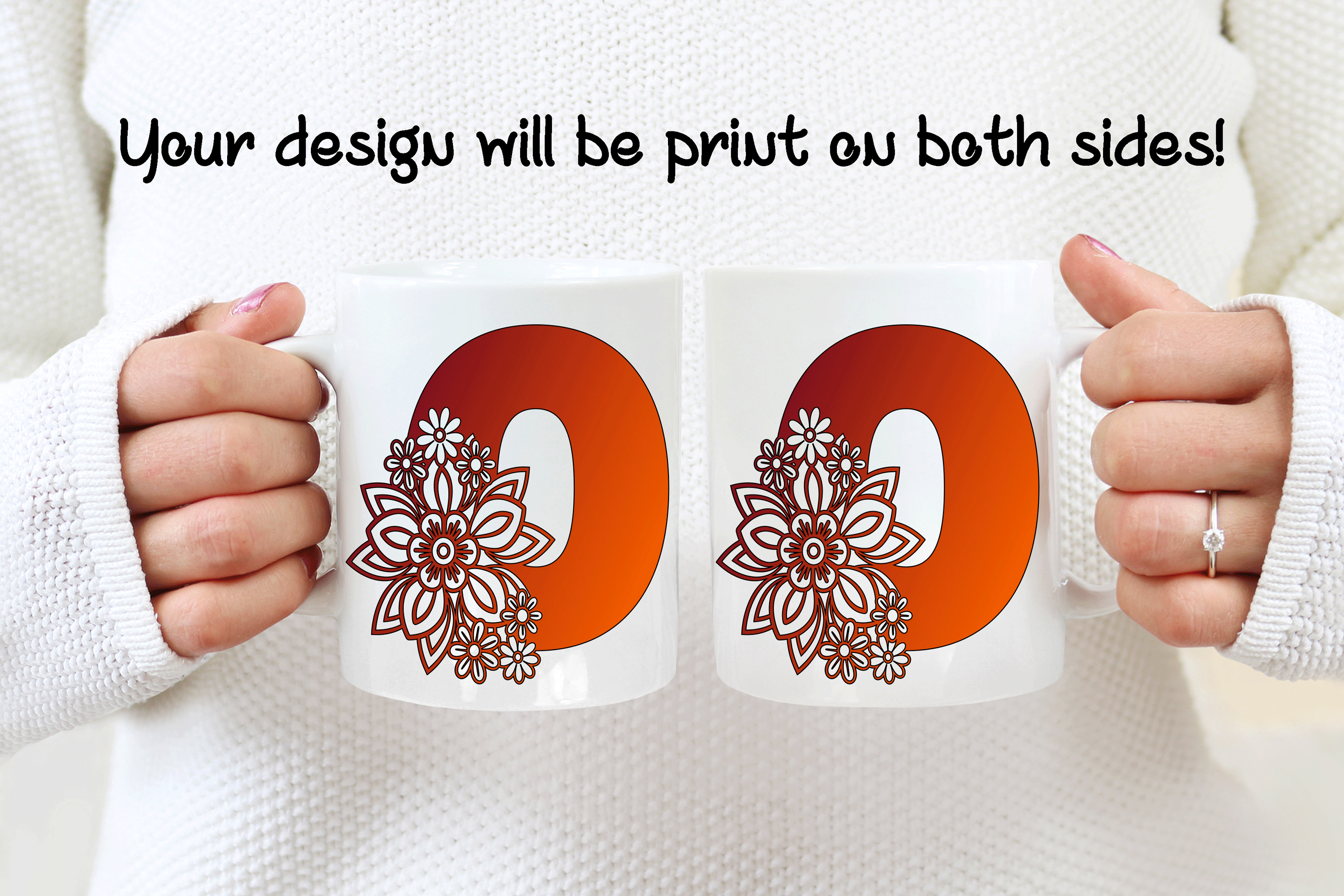The floral letter alphabet mug is a double side printed customized mug where you can choose any of the 4 O’s letter designs. You can add in the mug’s back a name, phrase, or both. You can also add the name at the bottom or top of the letter O, as in the pictures. It’s your personalized mug, so you get to design your custom mug as you wish! Please help us by providing us as much information as possible in the personalized text box. We will take care of the rest!