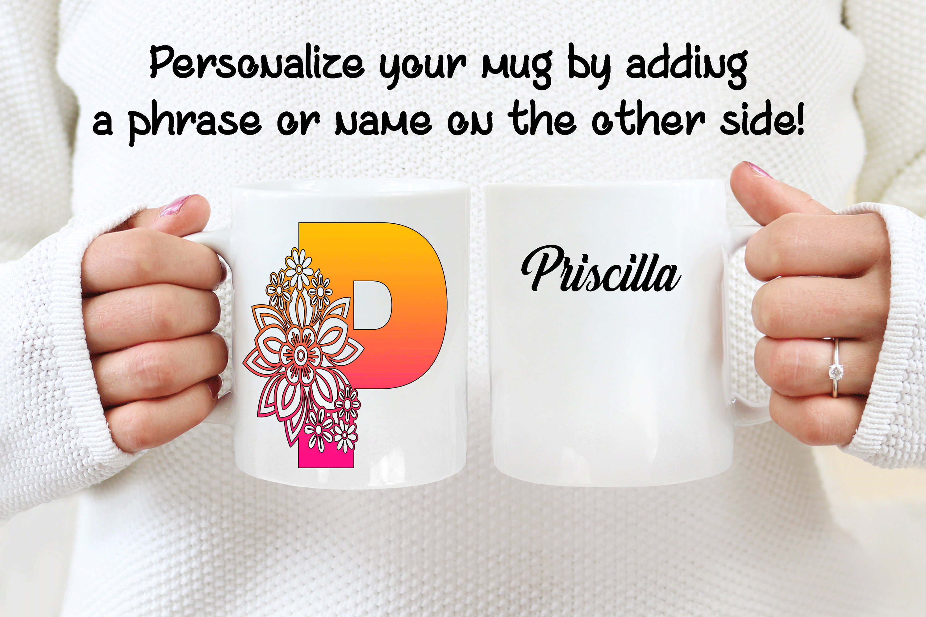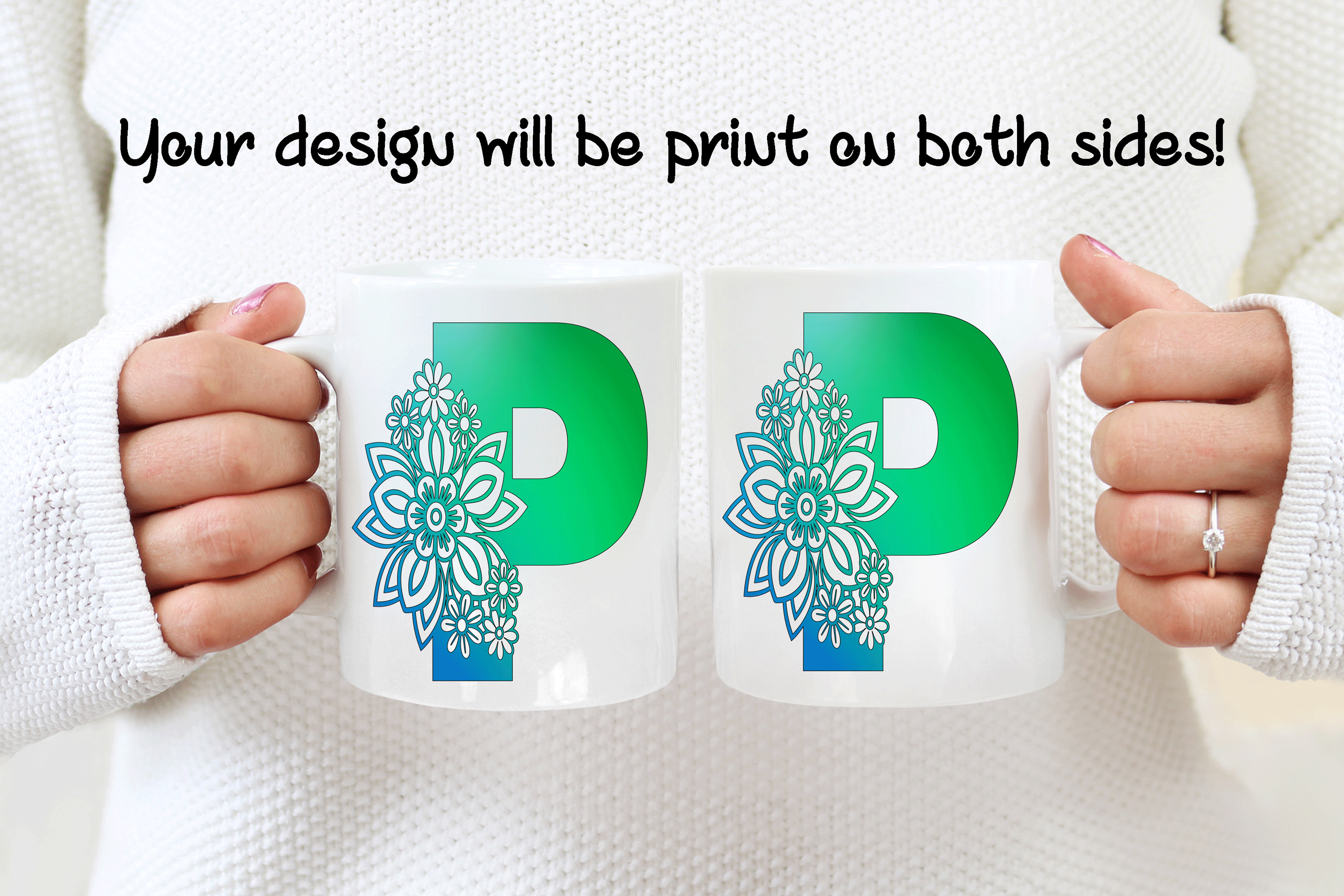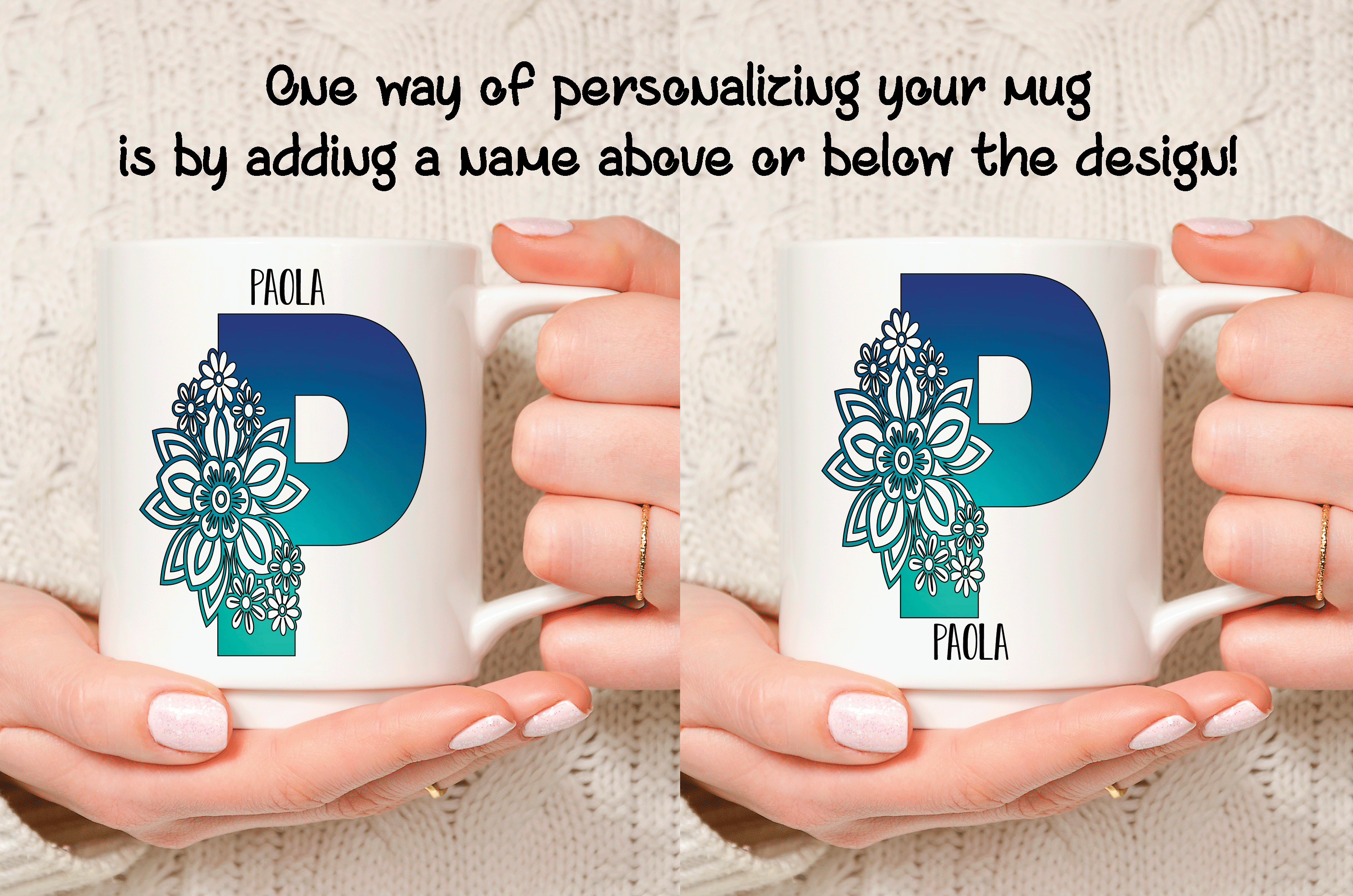 The floral letter alphabet mug is a double side printed customized mug where you can choose any of the 4 P’s letter designs. You can add in the mug’s back a name, phrase, or both. You can also add the name at the bottom or top of the letter P, as in the pictures. It’s your personalized mug, so you get to design your custom mug as you wish! Please help us by providing us as much information as possible in the personalized text box. We will take care of the rest!