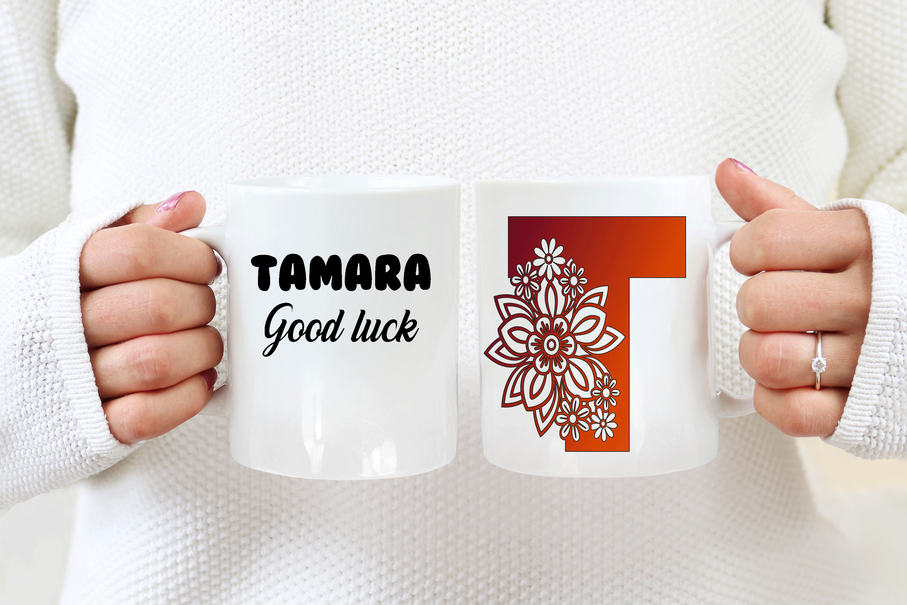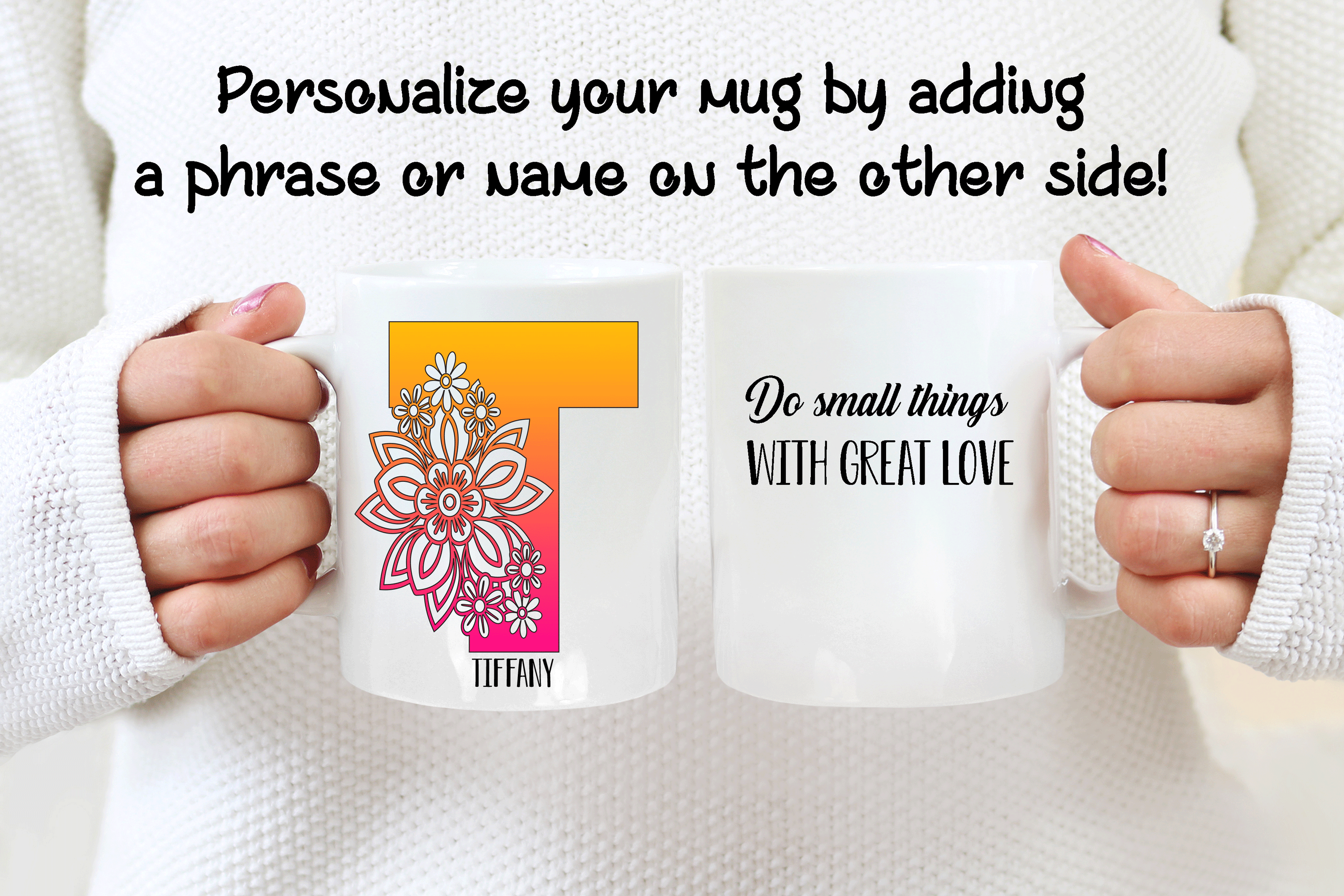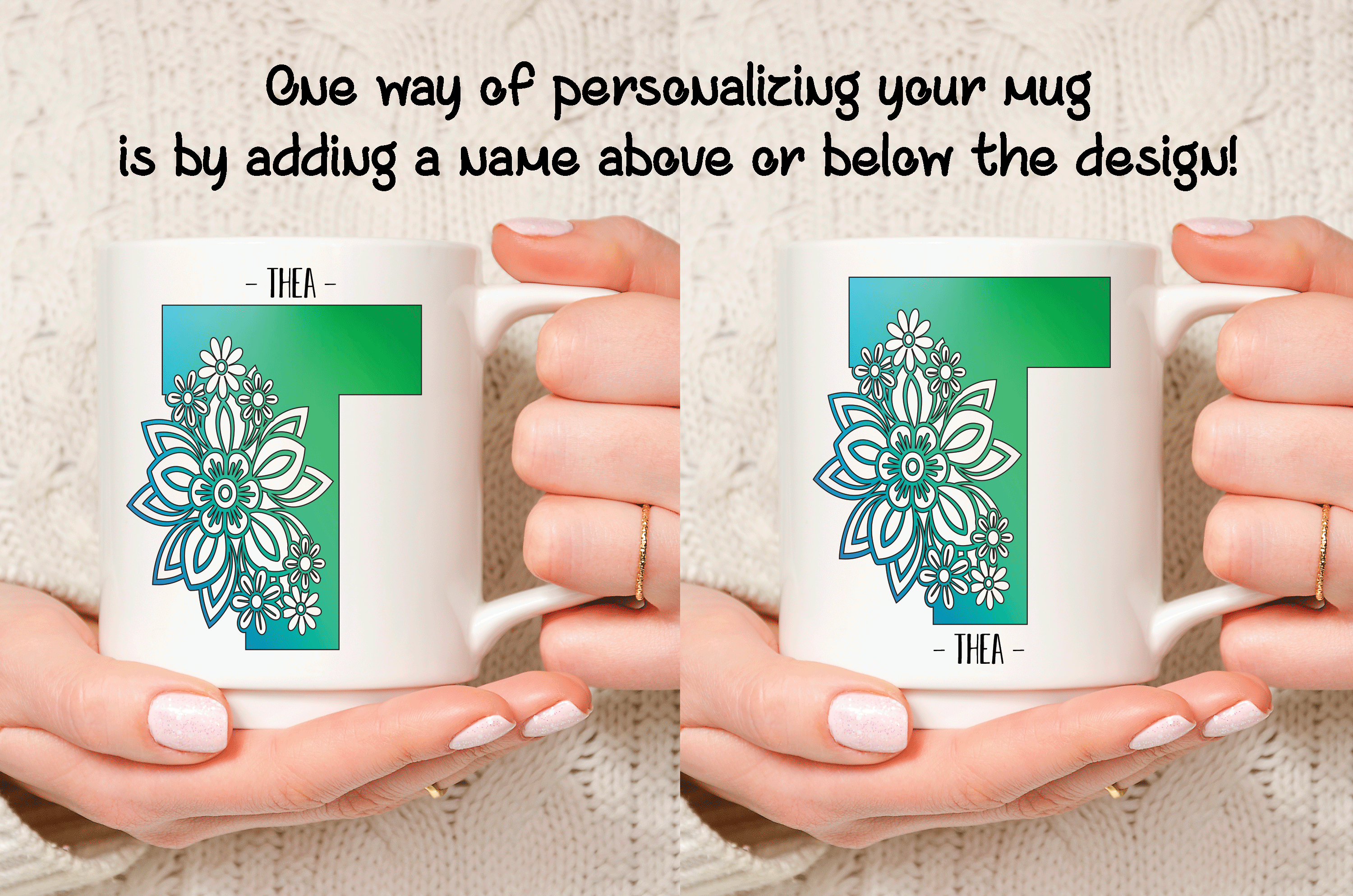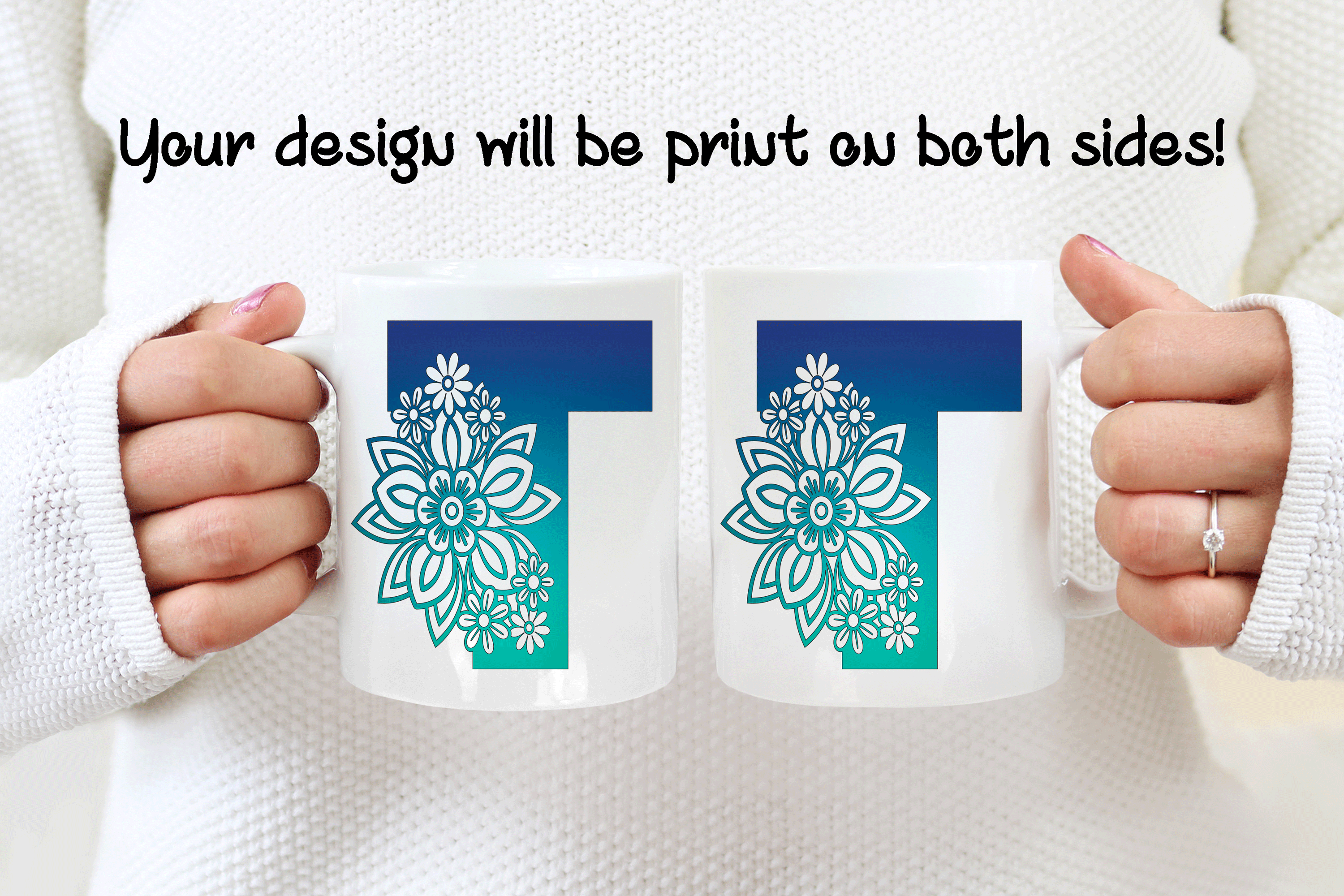 The floral letter alphabet mug is a double side printed customized mug where you can choose any of the 4 T’s letter designs. You can add in the mug’s back a name, phrase, or both. You can also add the name at the bottom or top of the letter T, as in the pictures. It’s your personalized mug, so you get to design your custom mug as you wish! Please help us by providing us as much information as possible in the personalized text box. We will take care of the rest!