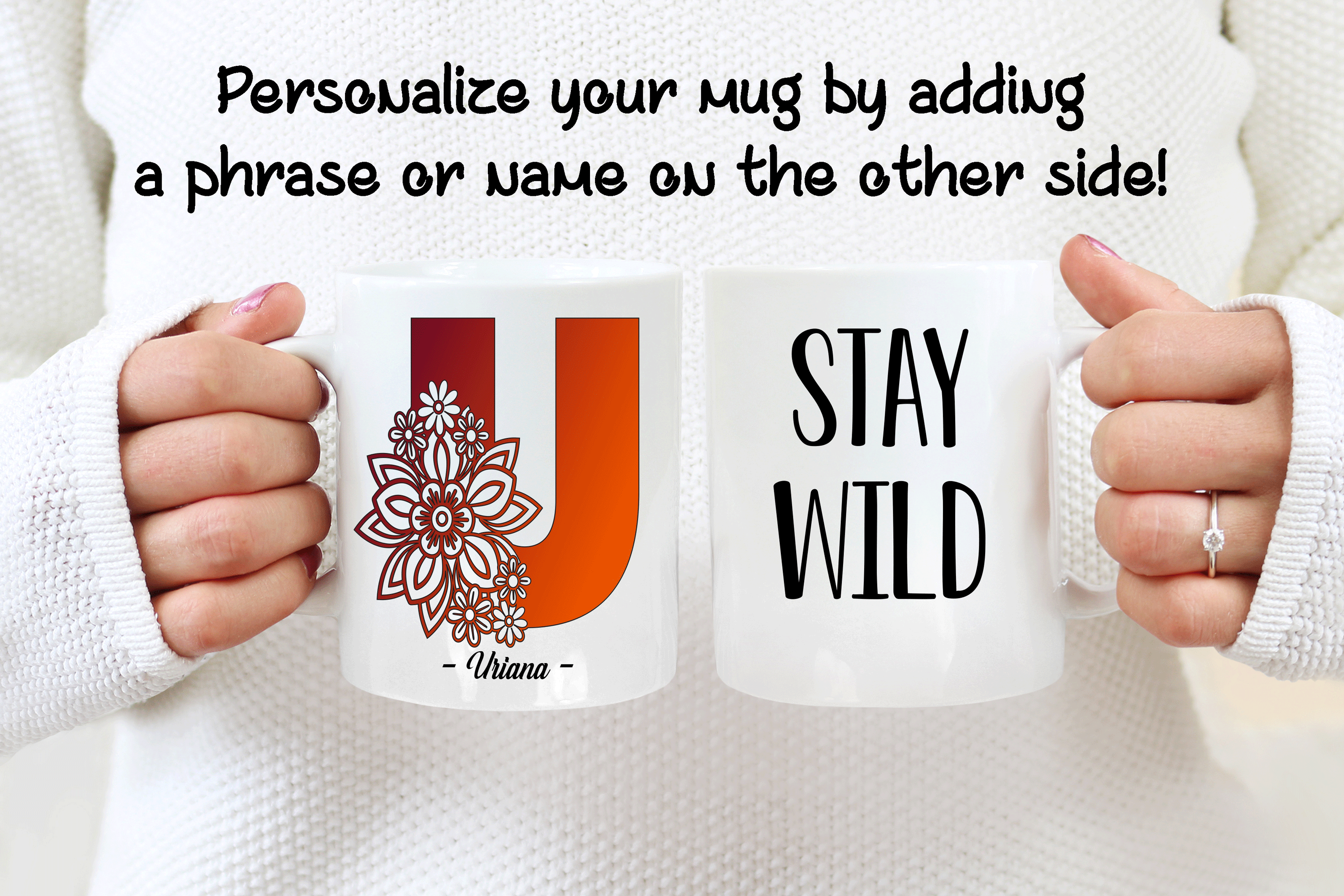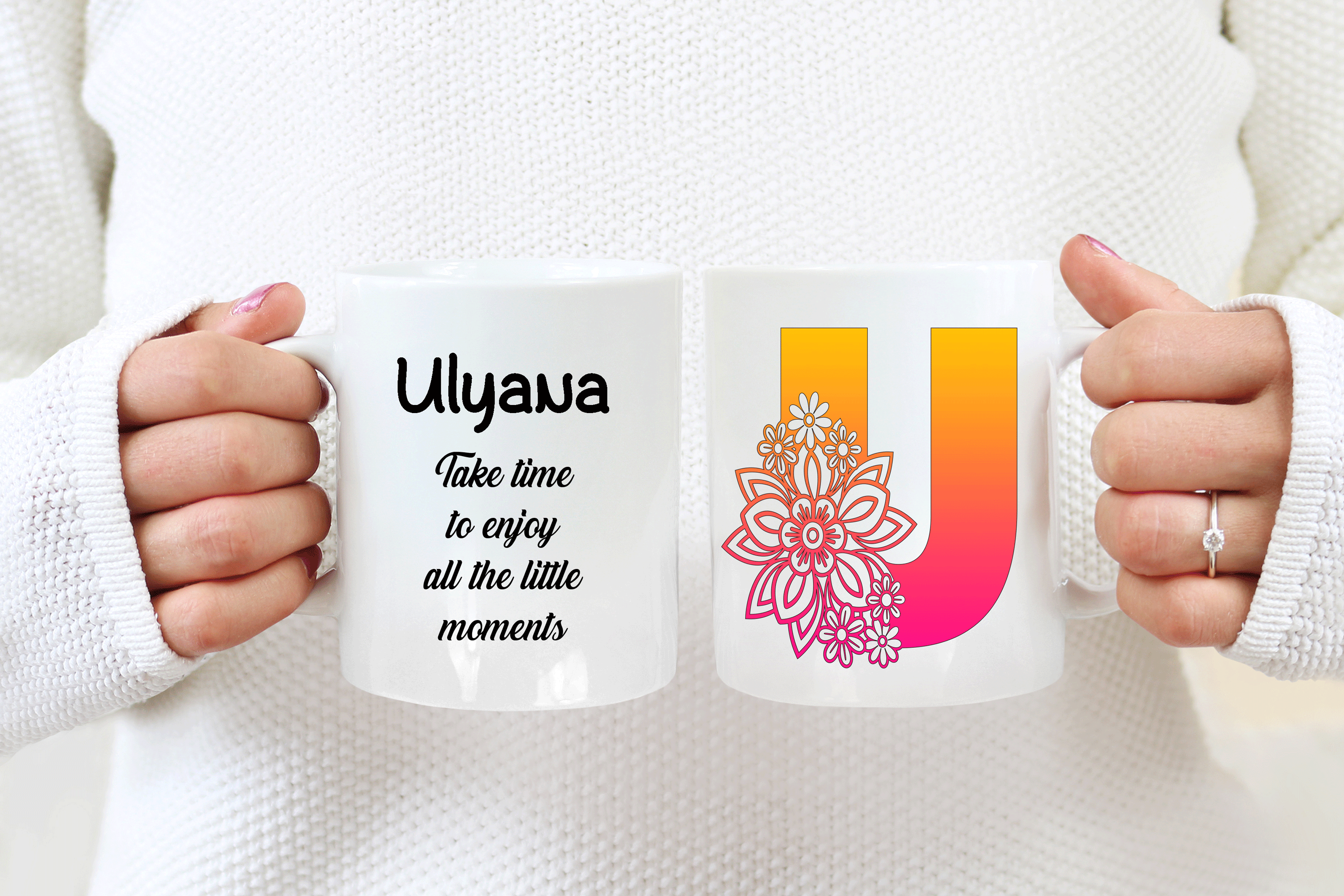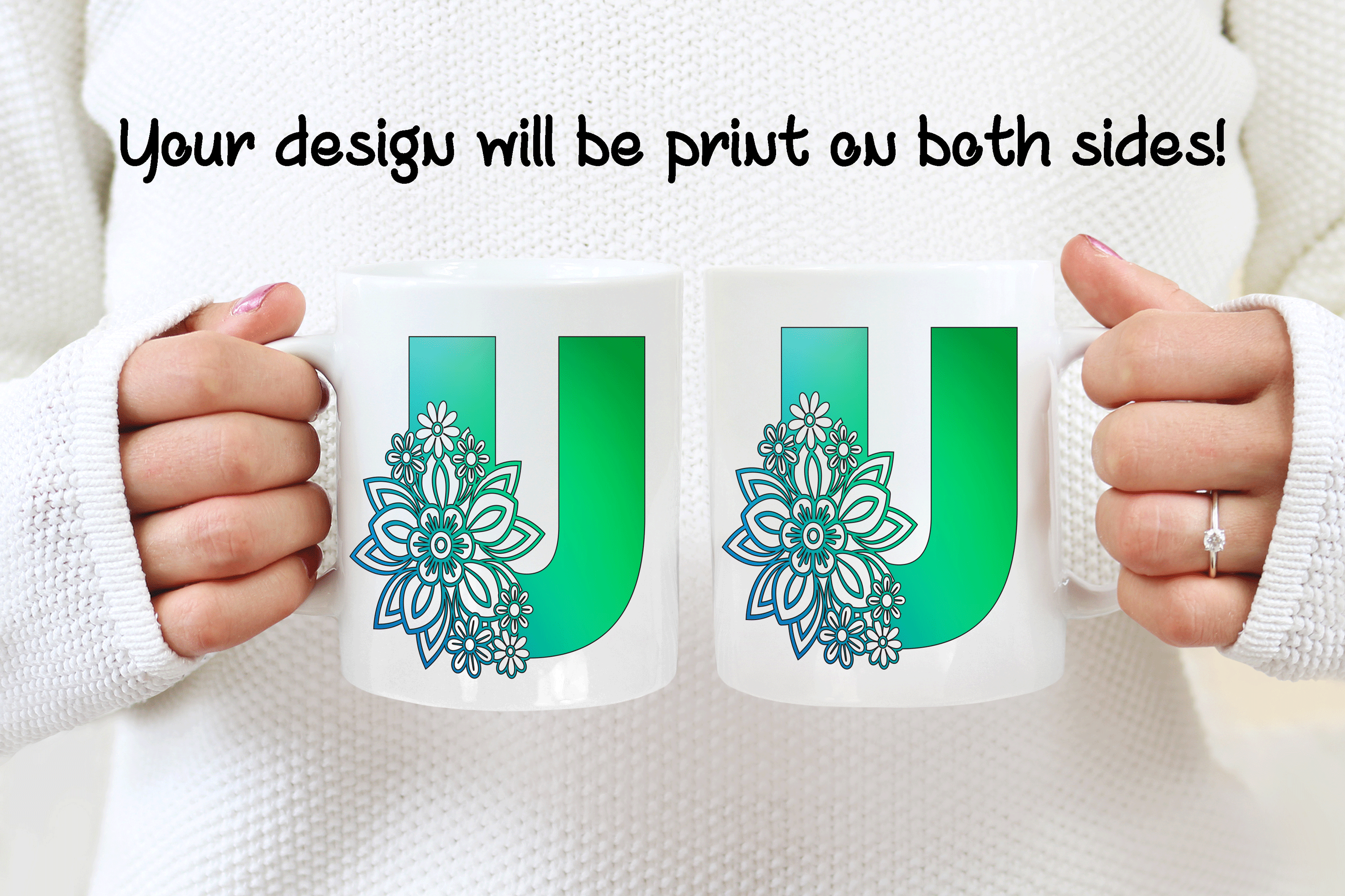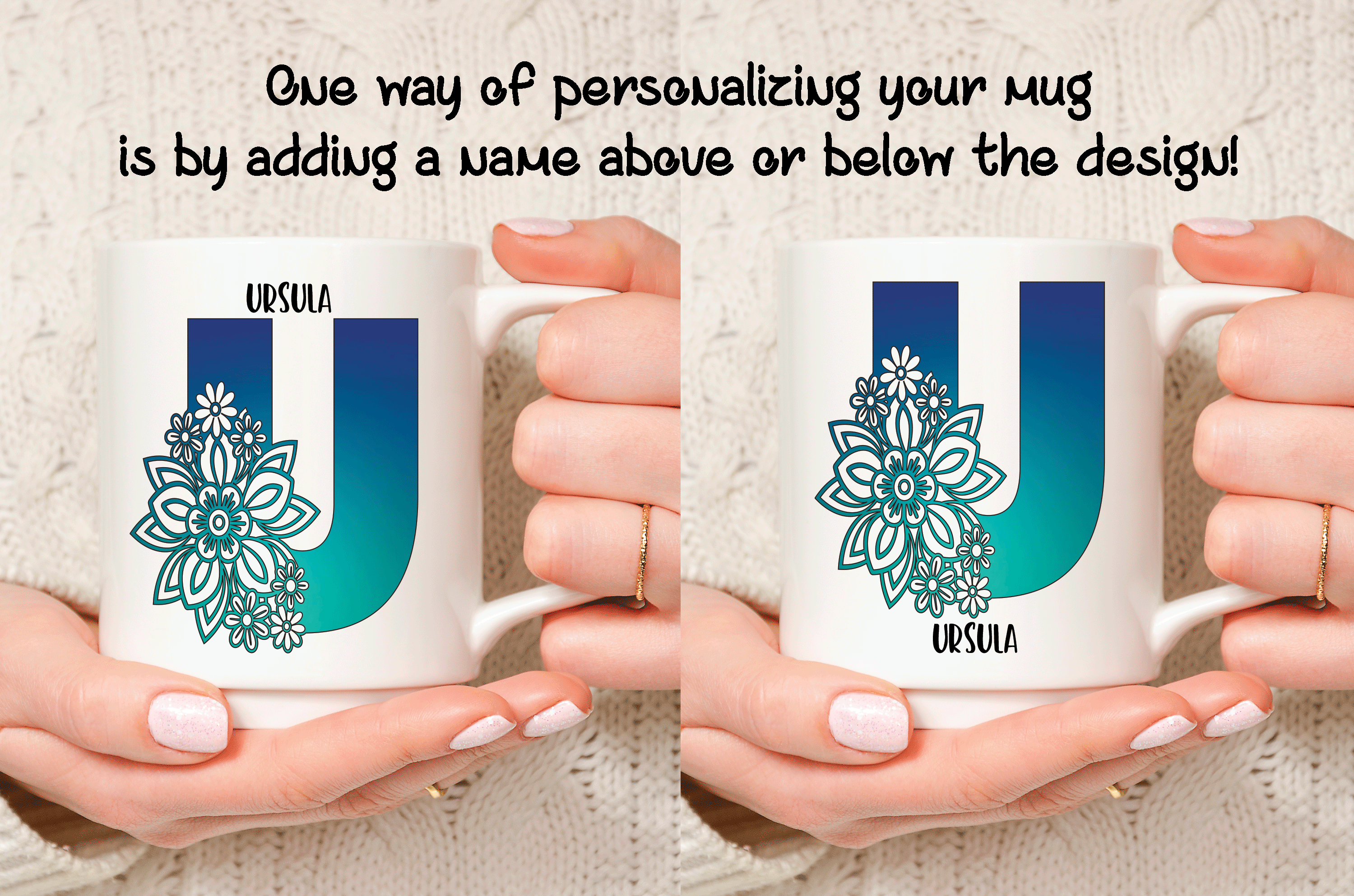 The floral letter alphabet mug is a double side printed customized mug where you can choose any of the 4 U’s letter designs. You can add in the mug’s back a name, phrase, or both. You can also add the name at the bottom or top of the letter U, as in the pictures. It’s your personalized mug, so you get to design your custom mug as you wish! Please help us by providing us as much information as possible in the personalized text box. We will take care of the rest!