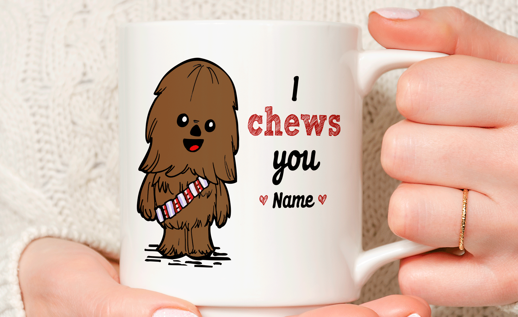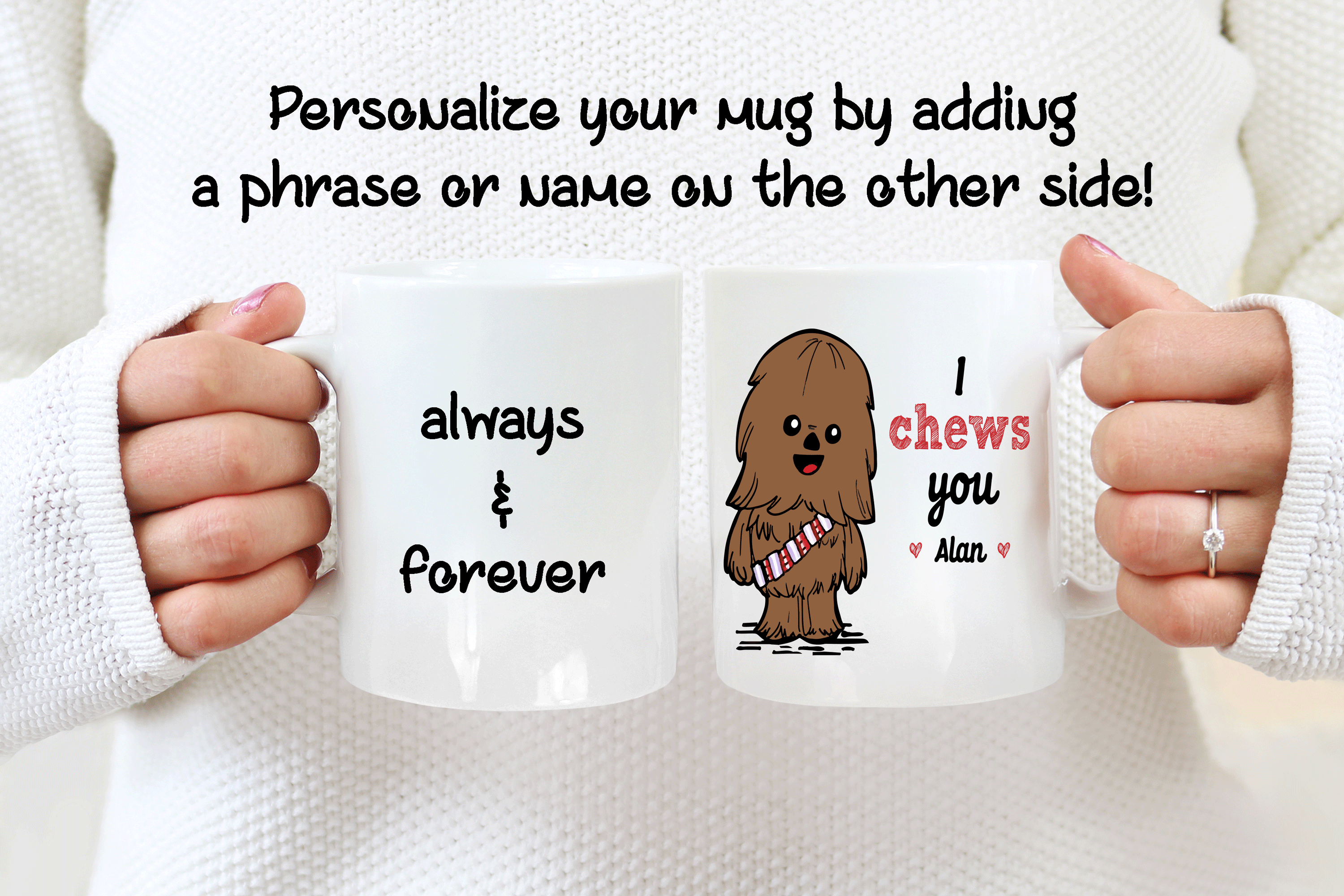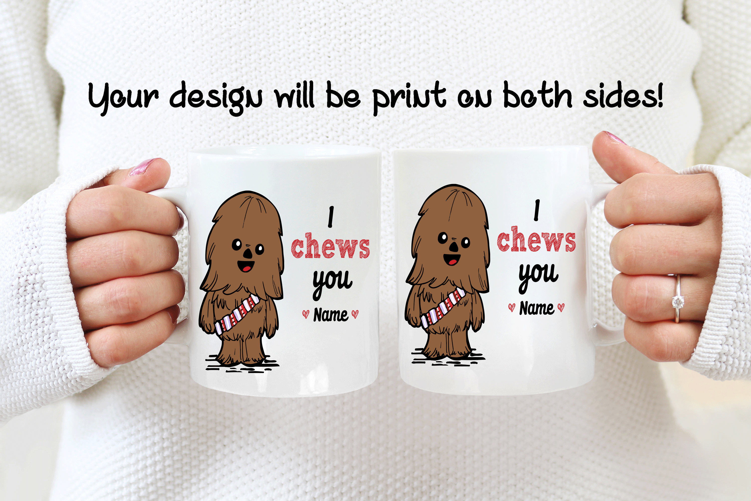 This I choose you gift is a personalized mug where you can add the name of your loved one on the front. Please add the name you want on the personalized text box. By default, we will double print the design. You can add a phrase on the mug’s back, as in the pictures, if you want! If you do so, please help us by specifying the text with the font number you want. We will take care of the rest!