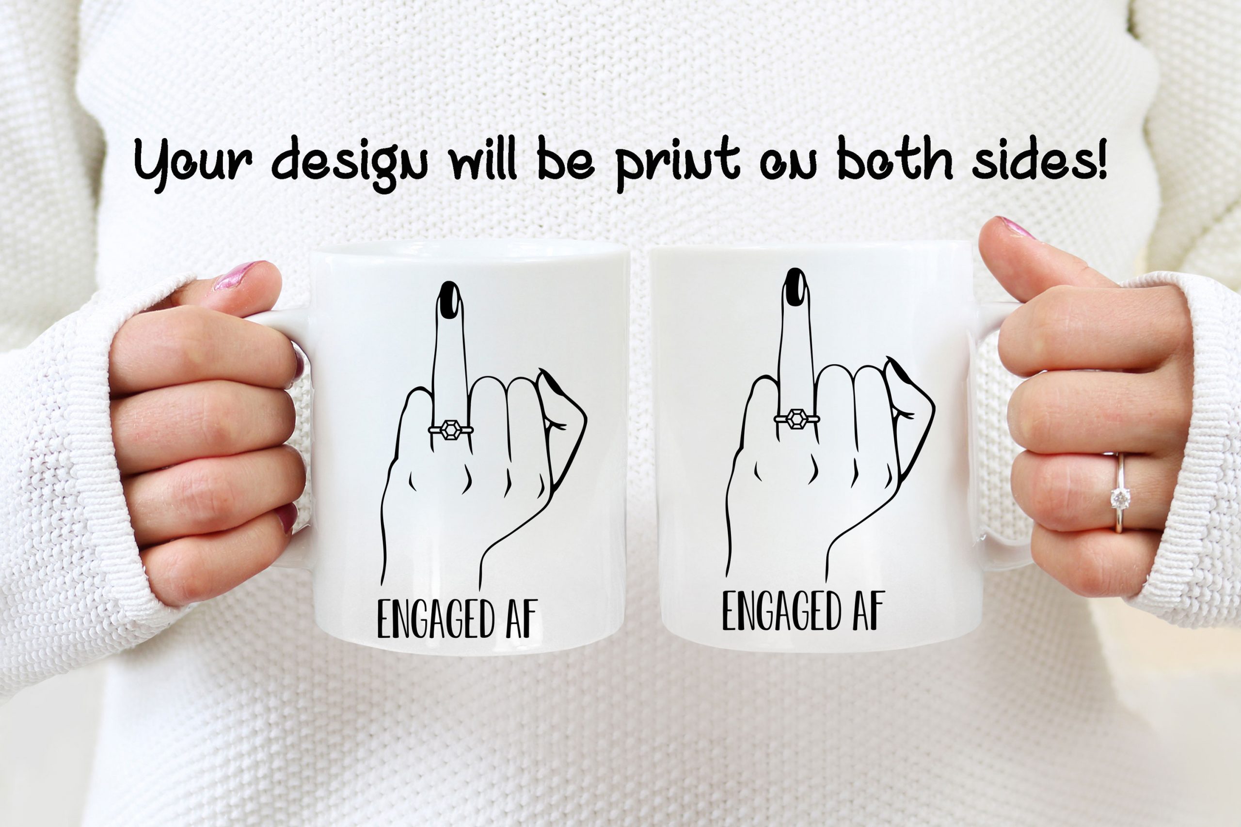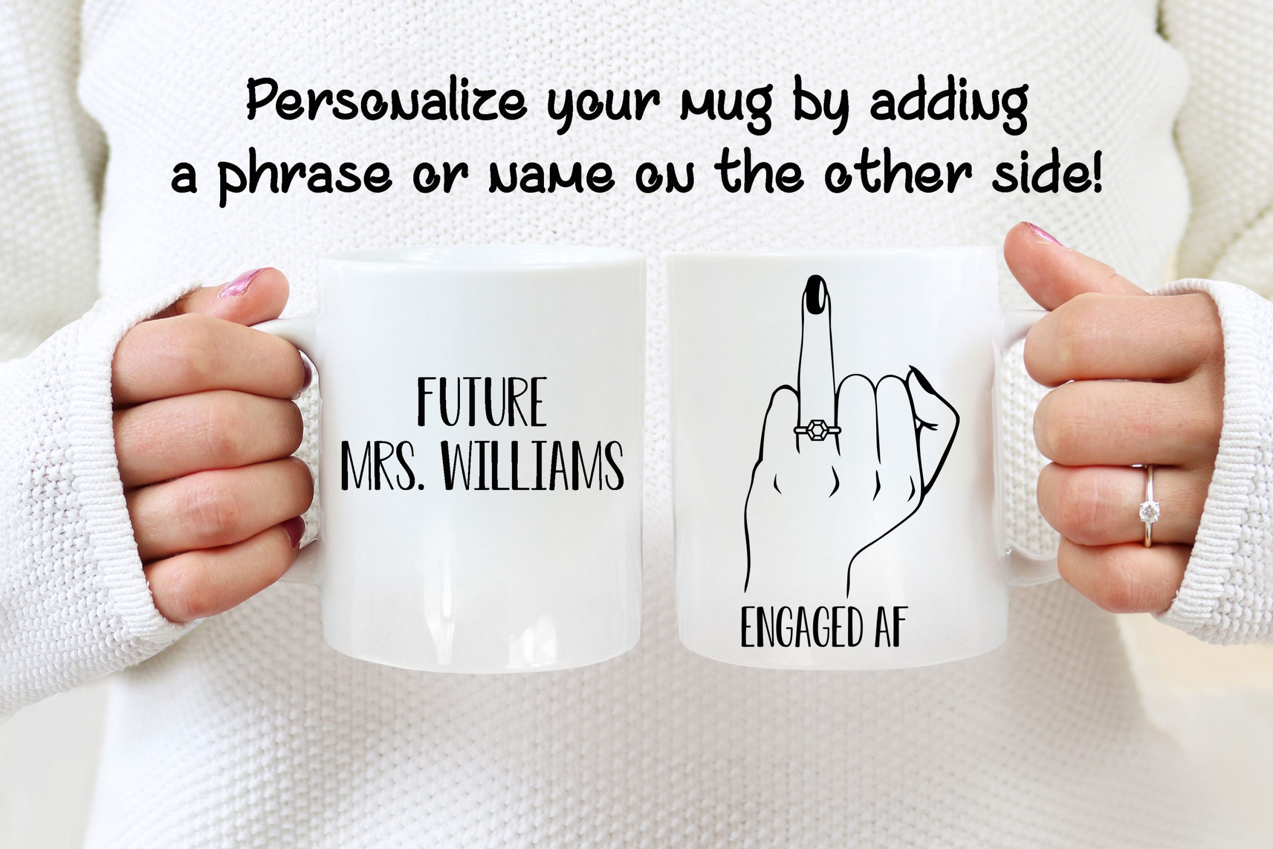 This Bridal Shower Gift is a personalized mug where you can add a name or phrase to the mug’s back, as in the pictures! If you do so, please help us by specifying the text with the font number you want. We will take care of the rest! If you don’t request any personalization, we will print the principal design on both sides.