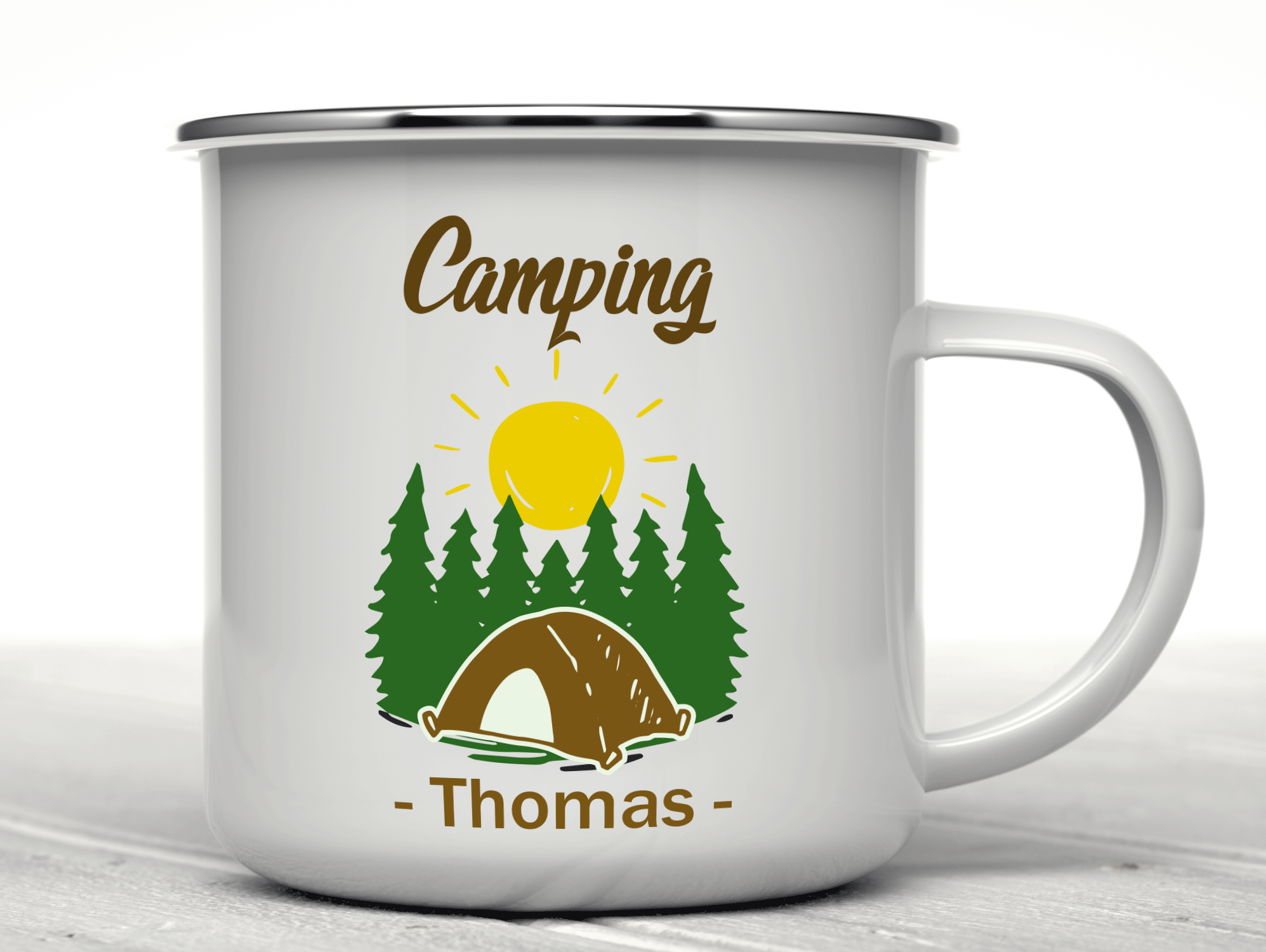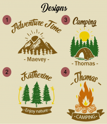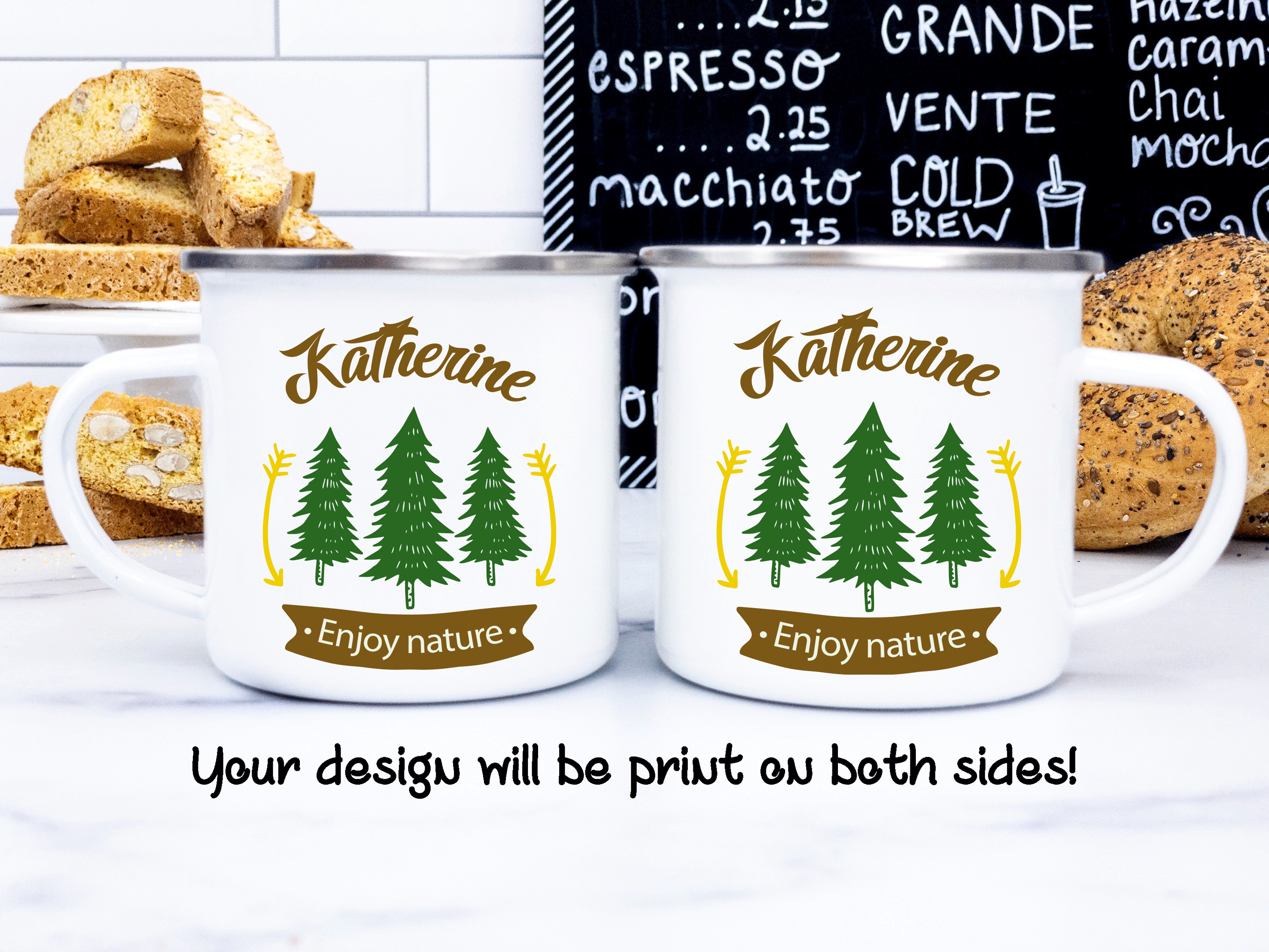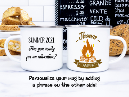 The custom campfire mug will be print on both sides, and you can choose to put in the back a phrase as in the pictures. Please help us by providing us as much information as possible in the personalized text box, including the name you want for the mug’s design, and we will take care of the rest. This campers mug is your personalized mug, so you get to design your gift for camper as you wish!