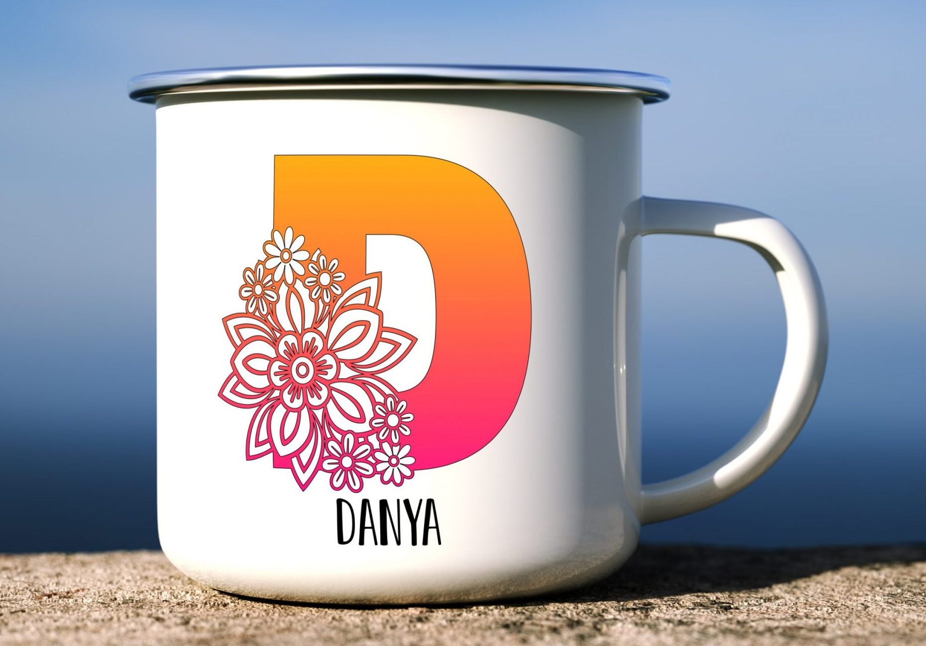 Floral Alphabet D, Customizable Mug, Enamel Mug