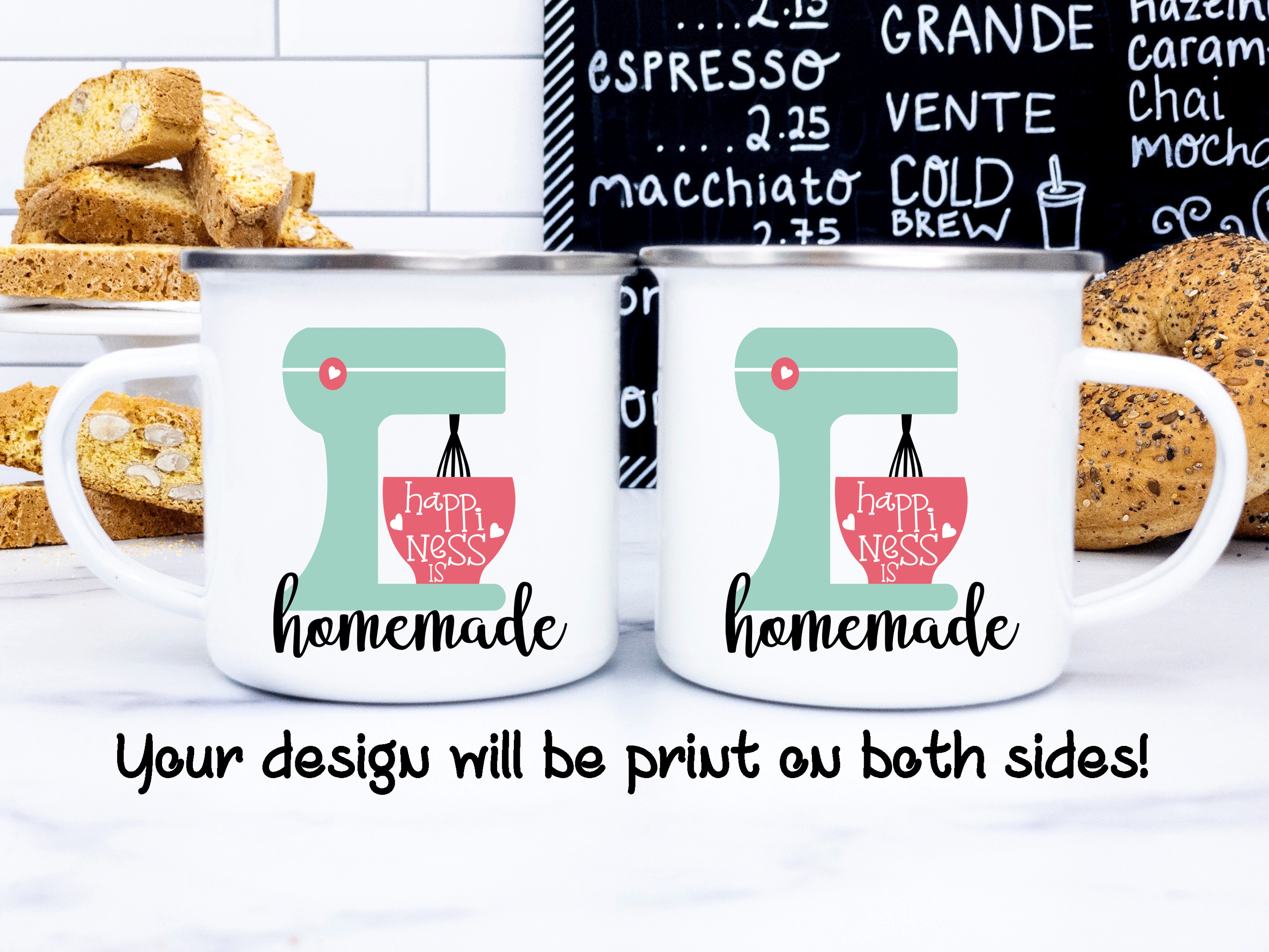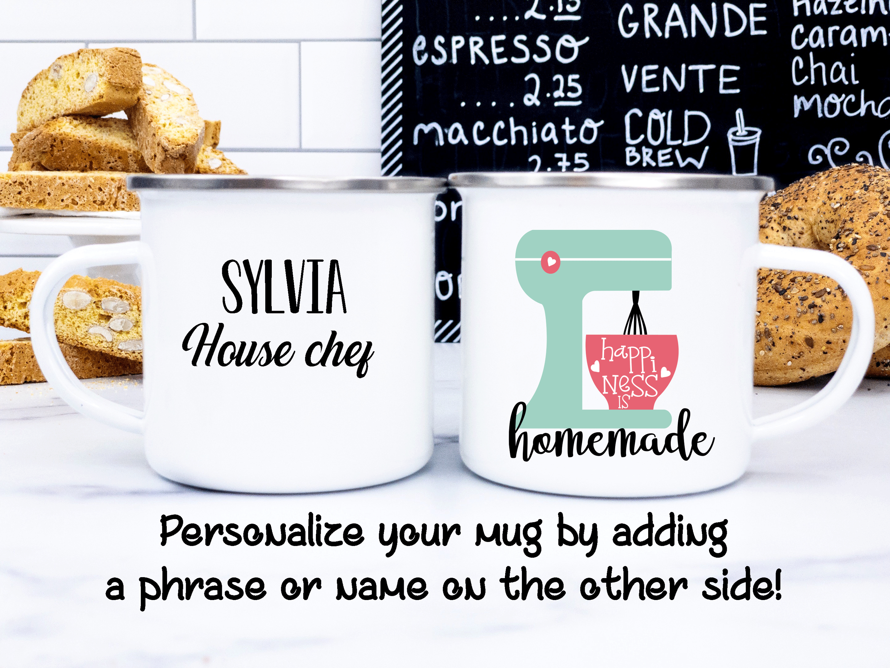 We will print your custom culinary mug on both sides, and you can choose to put in the back a name, phrase, or both as in the pictures. You can also add a name at the bottom or above the design if you want! Please help us by providing us as much information as possible in the personalized text box, and we will take care of the rest. It’s your personalized mug, so you get to design your chef’s gift as you wish!