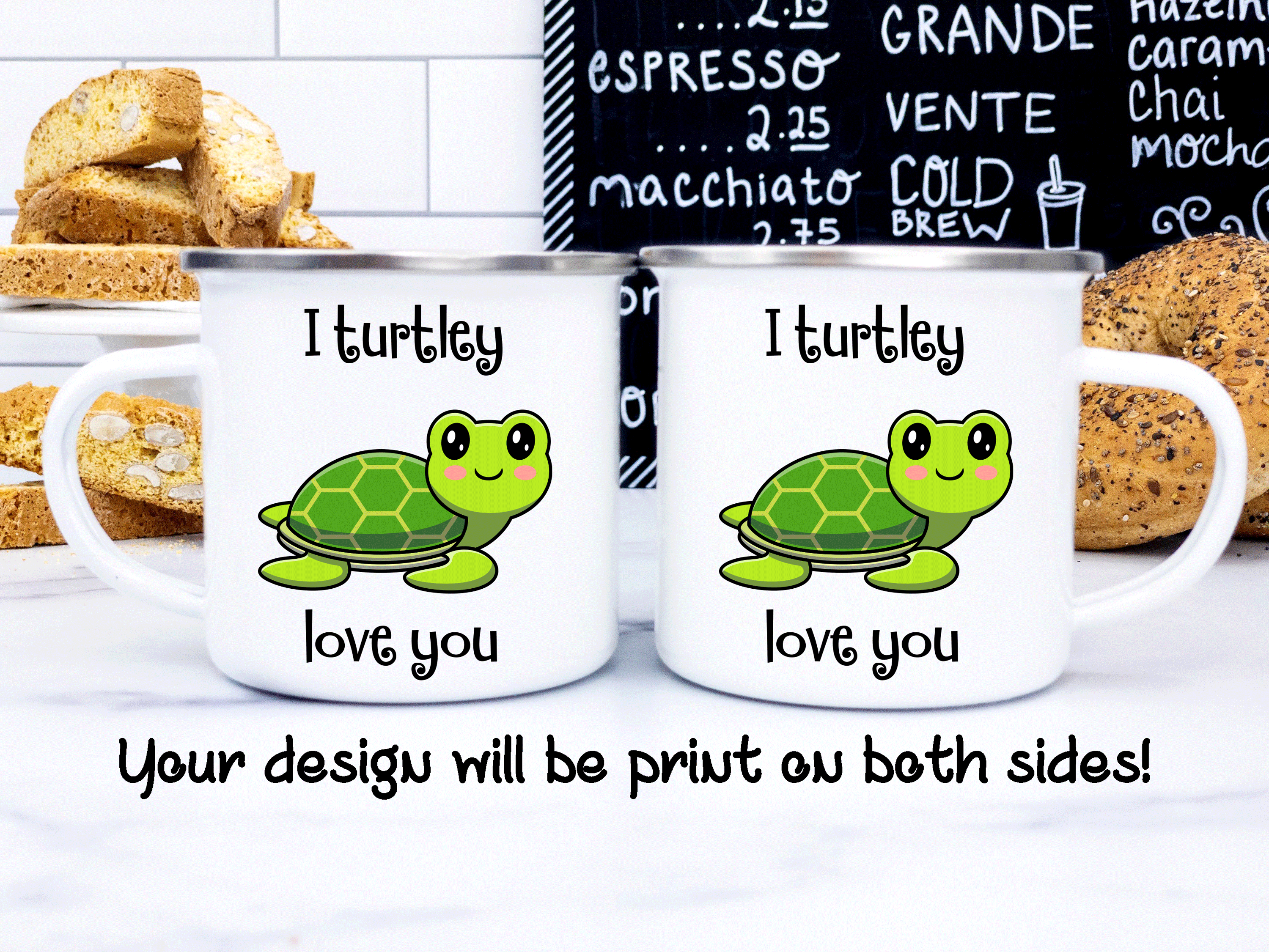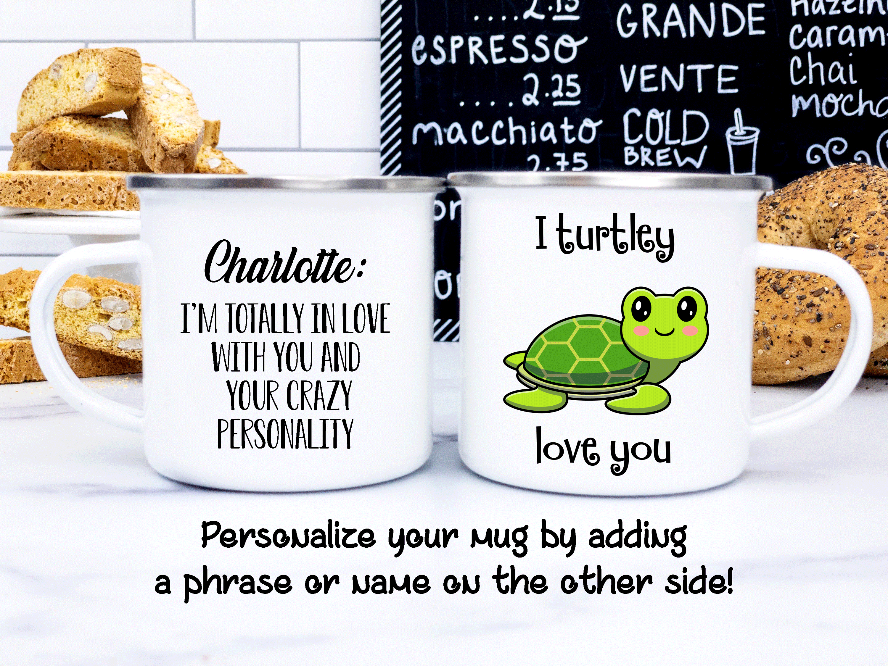 By default, we will print your customized turtle mug on both sides. You can choose to put in the mug’s back a name, phrase, or both (as in the pictures). And if you want to do so, please provide us with as much information as possible in the personalized text box; we will take care of the rest. It’s your personalized mug, so you get to design your custom mug as you wish!