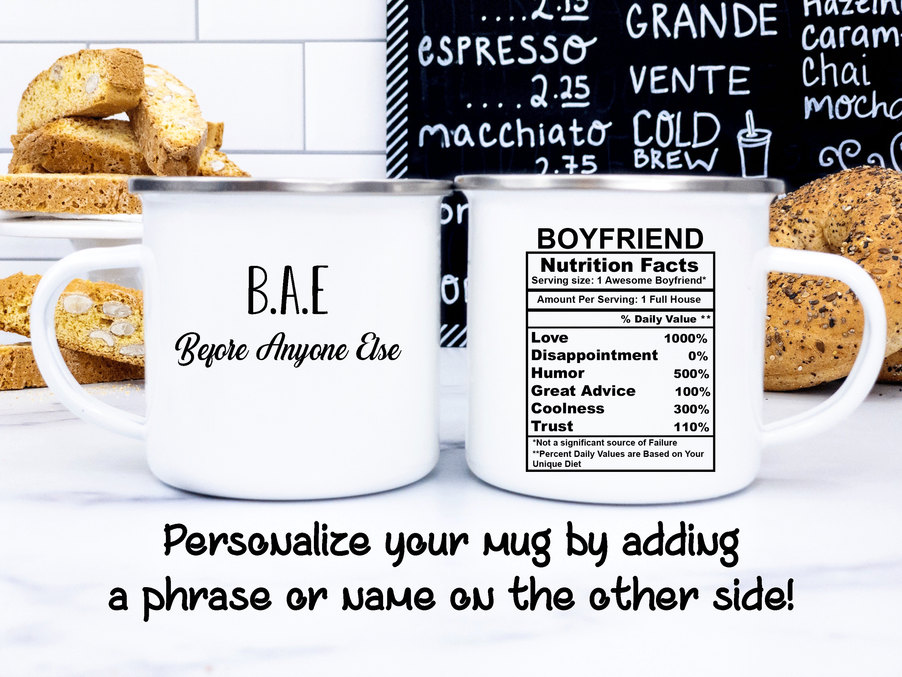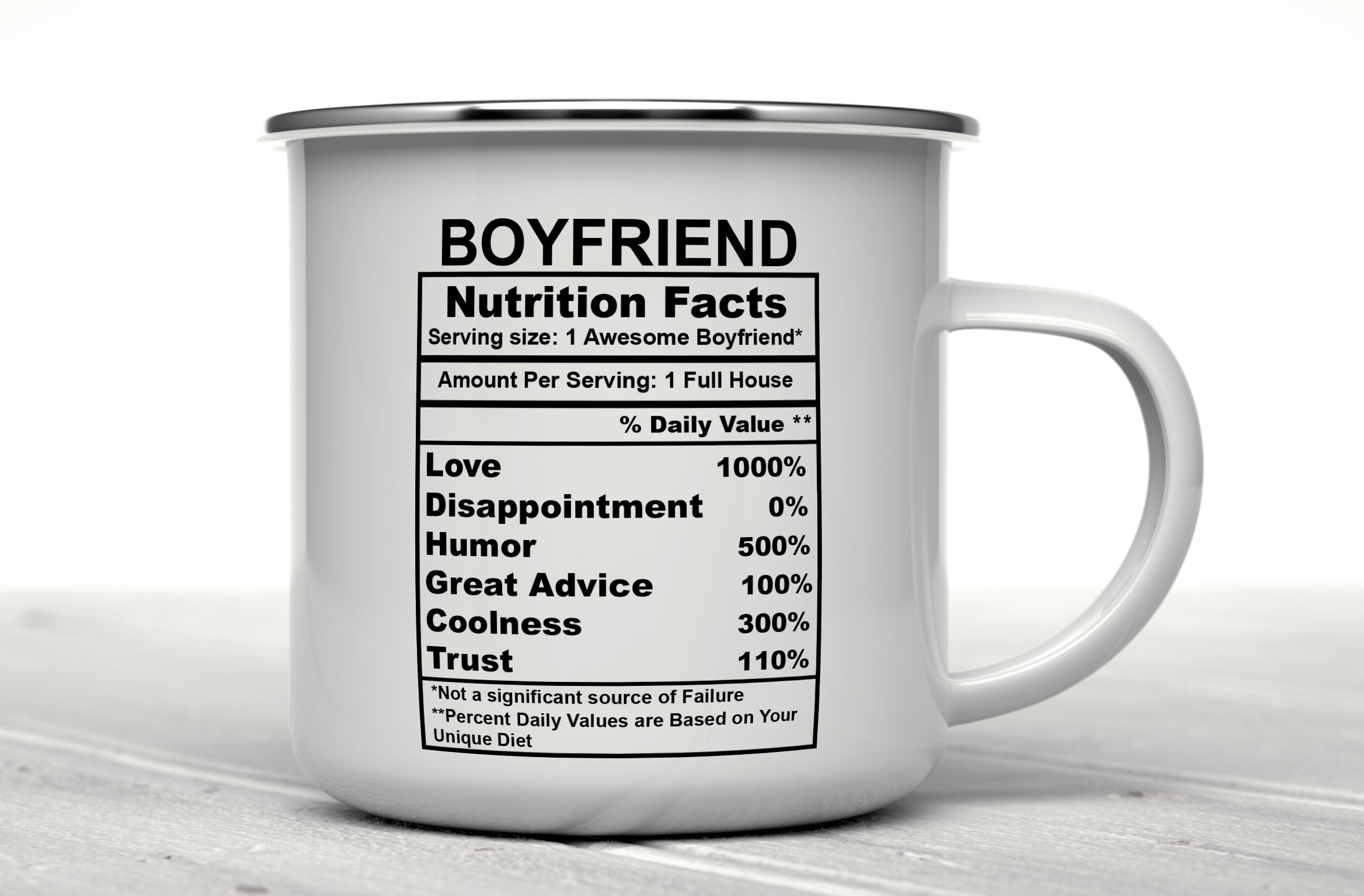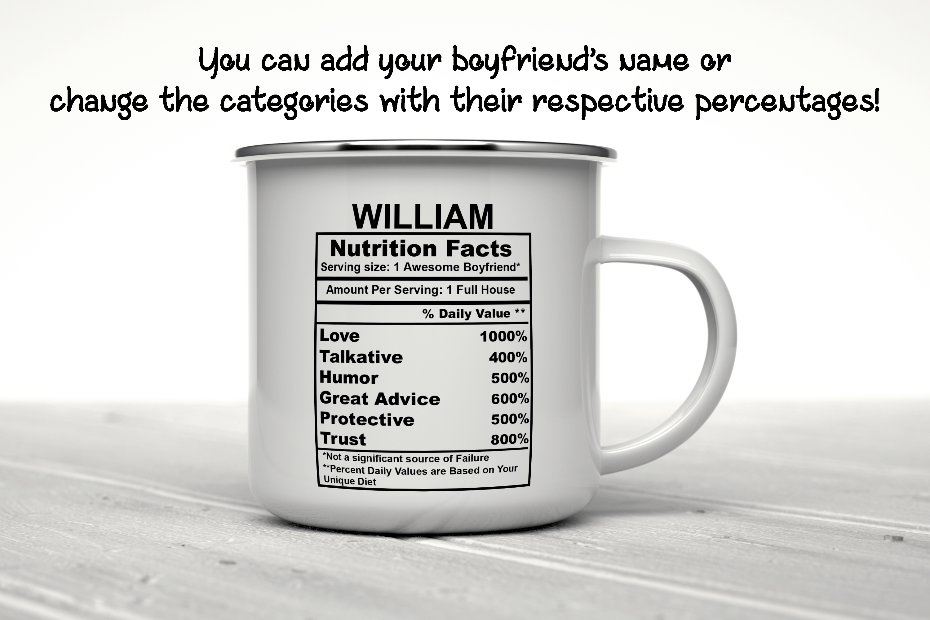 We will print your gift for boyfriend mug on both sides, and you can choose to put in the back a name, phrase, or both. And if you would like to do it, please specify the text and the typography number you want. By default, we will print the mug design on the main picture. If you choose to add a name or change the categories and their percentages, please provide us with as much information as possible in the personalized text box, and we will take care of the rest. It’s your perfect gift, so you get to design your gift for him as you wish!