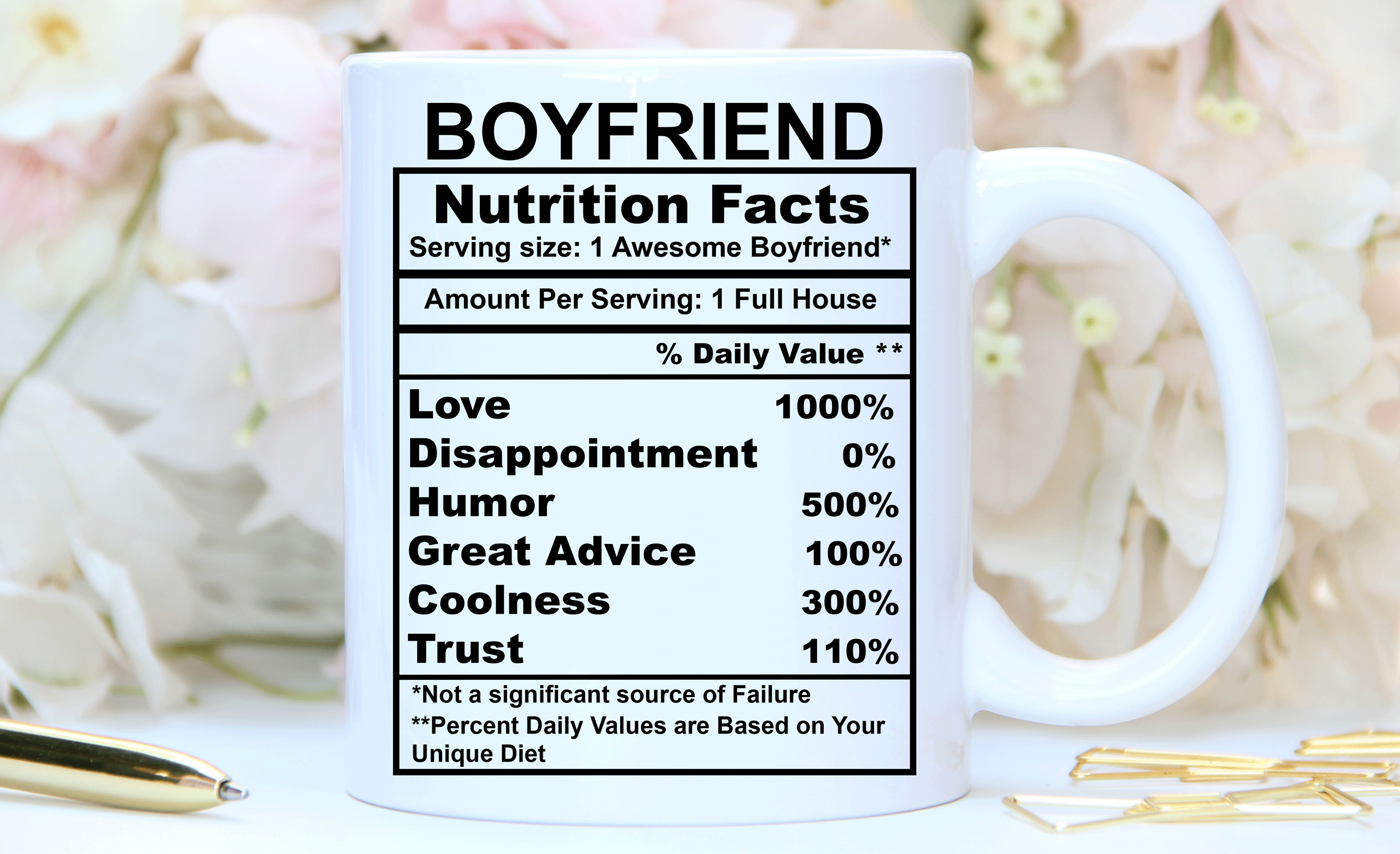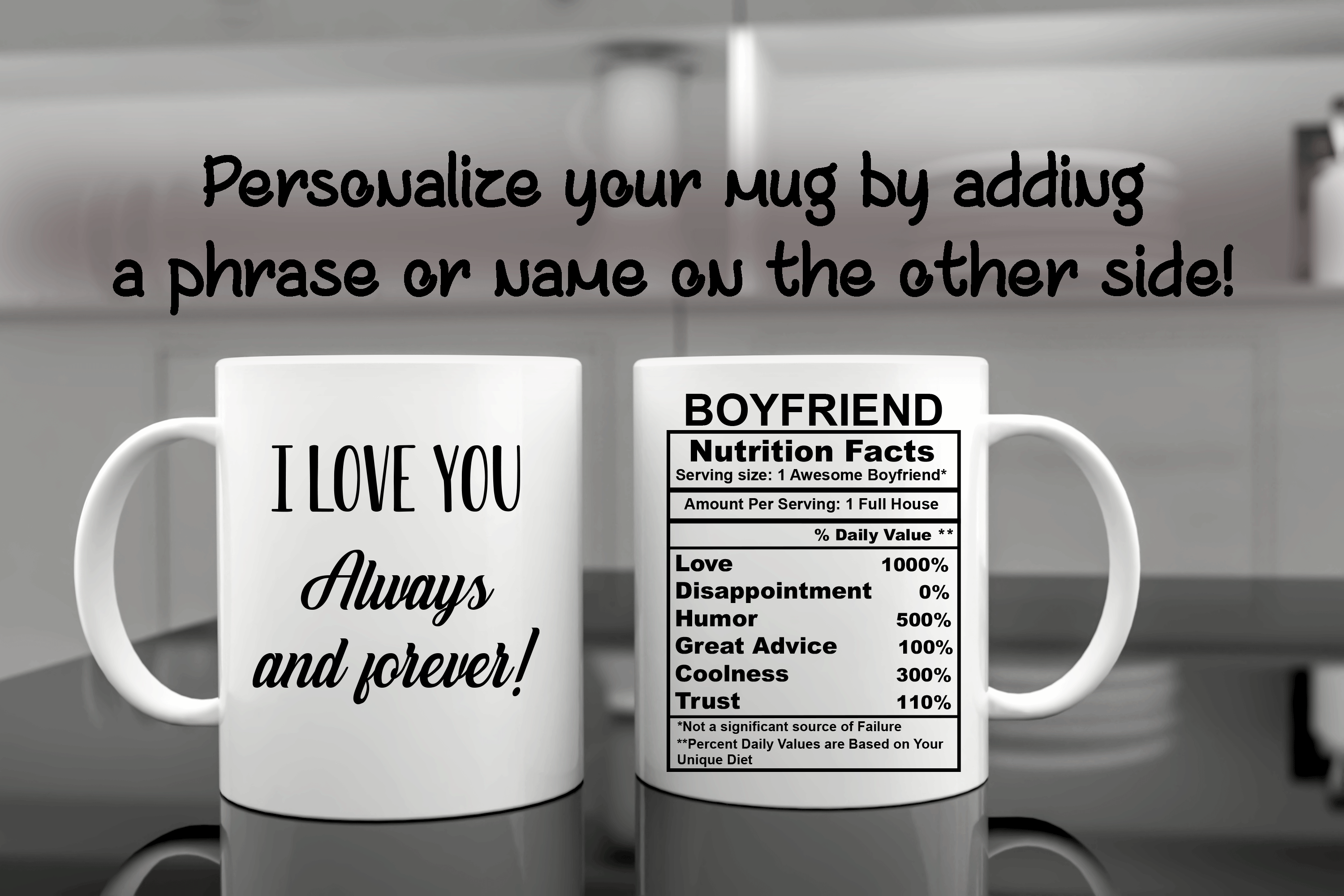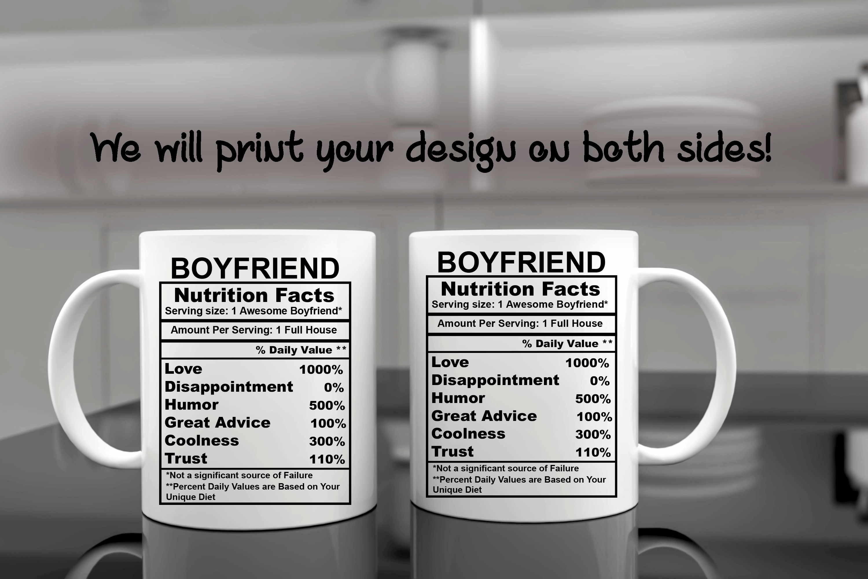 We will print your personalized Valentine’s mug on both sides, and you can choose to put in the back a name, phrase, or both. By default, we will print the mug design on the main picture. If you want to add his name or change the categories and their percentages, please provide us with as much information as possible in the personalized text box. We will take care of the rest! It’s your perfect gift, so you design it as you wish!