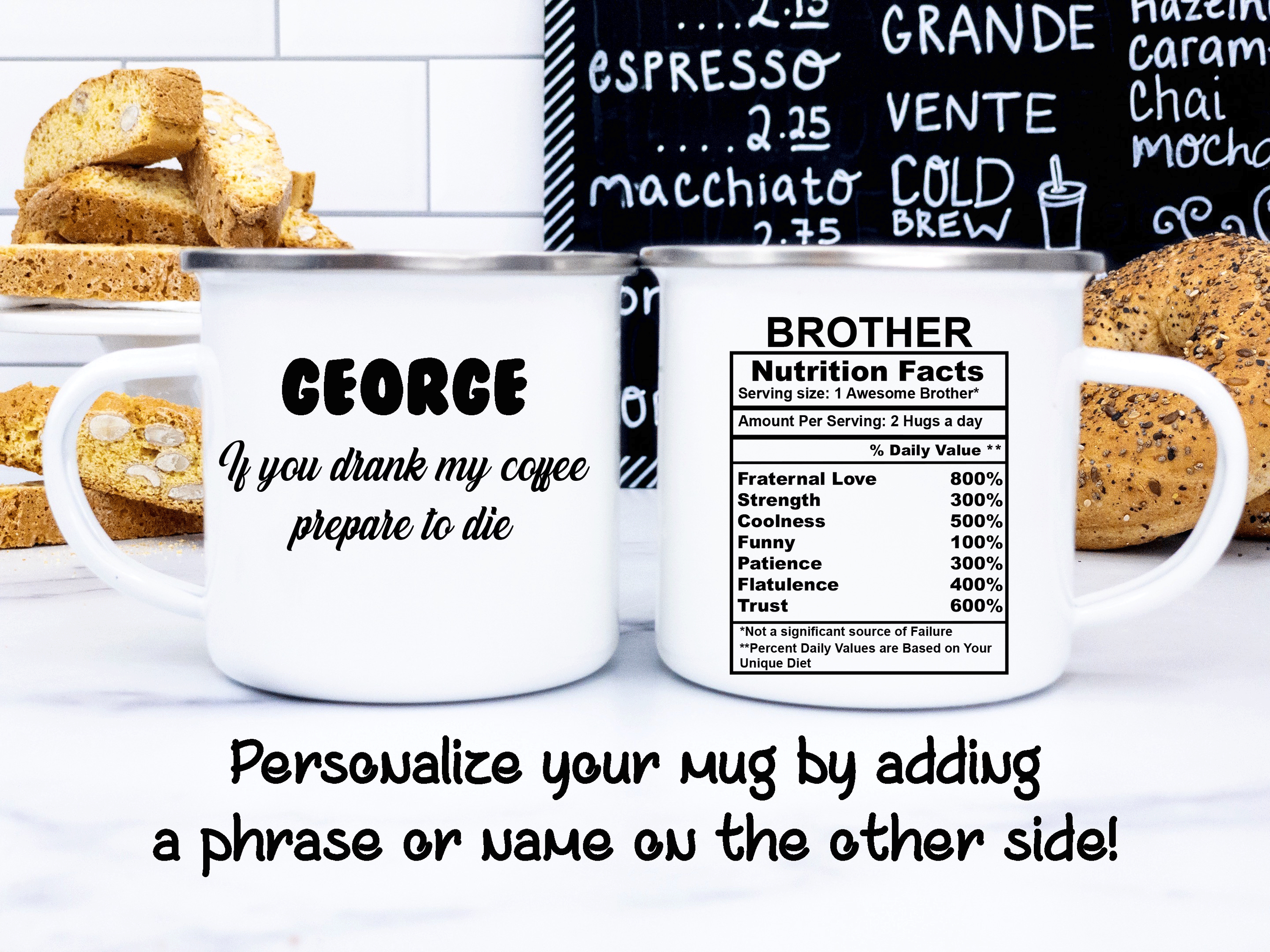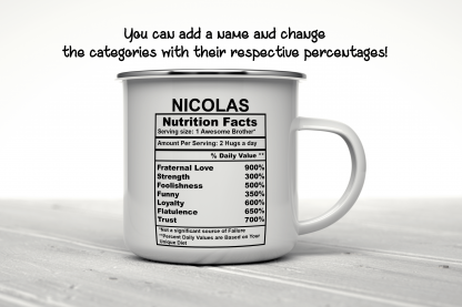 We will print your gift for brother mug on both sides, and you can choose to put in the back a name, phrase, or both. And if you would like to do it, please specify the text and the typography number you want. By default, we will print the mug design on the main picture. If you choose to add a name or change the categories and their percentages, please provide us with as much information as possible in the personalized text box, and we will take care of the rest. It’s your perfect mug gift, so you get to design your gift for him as you wish!