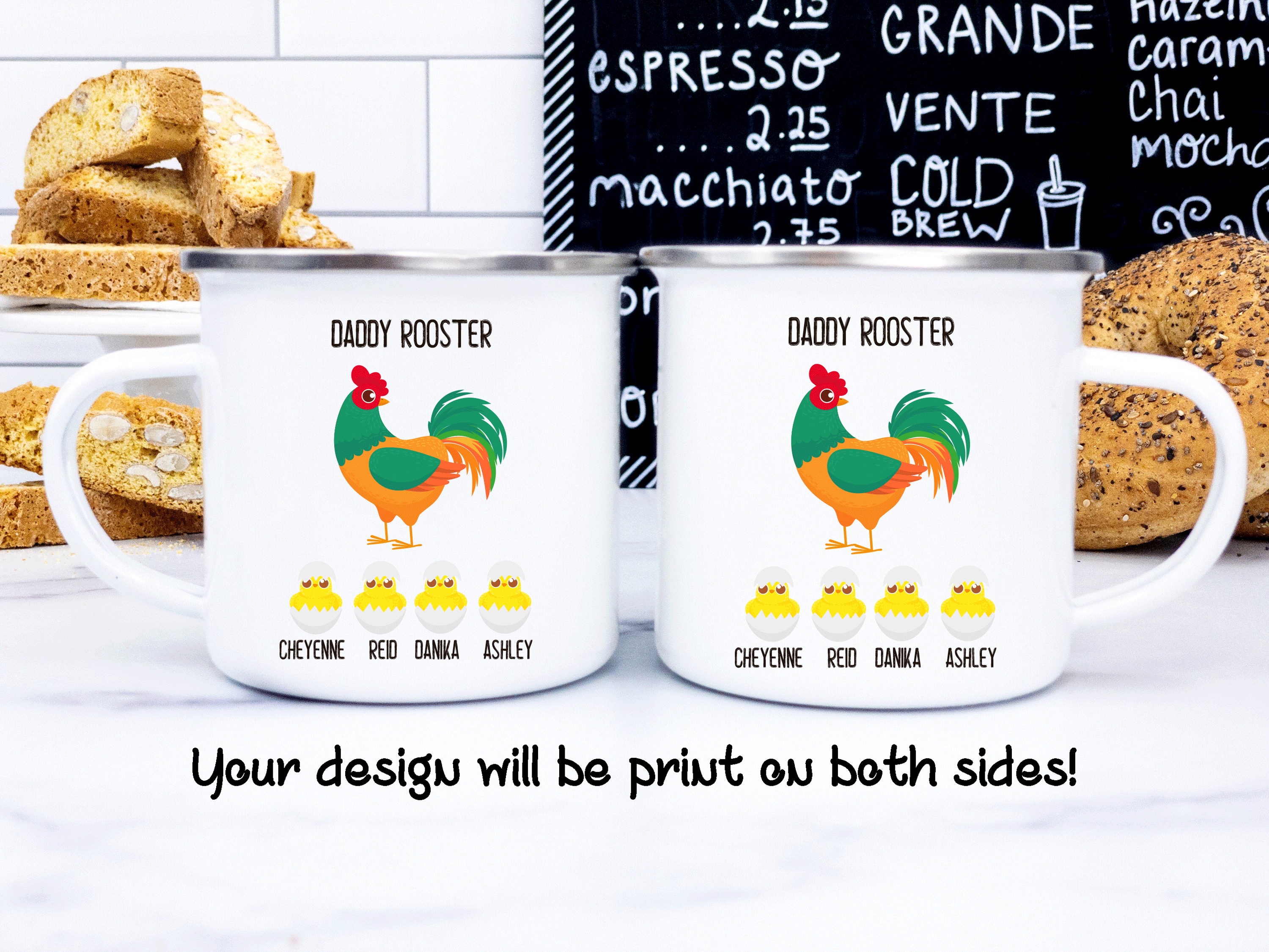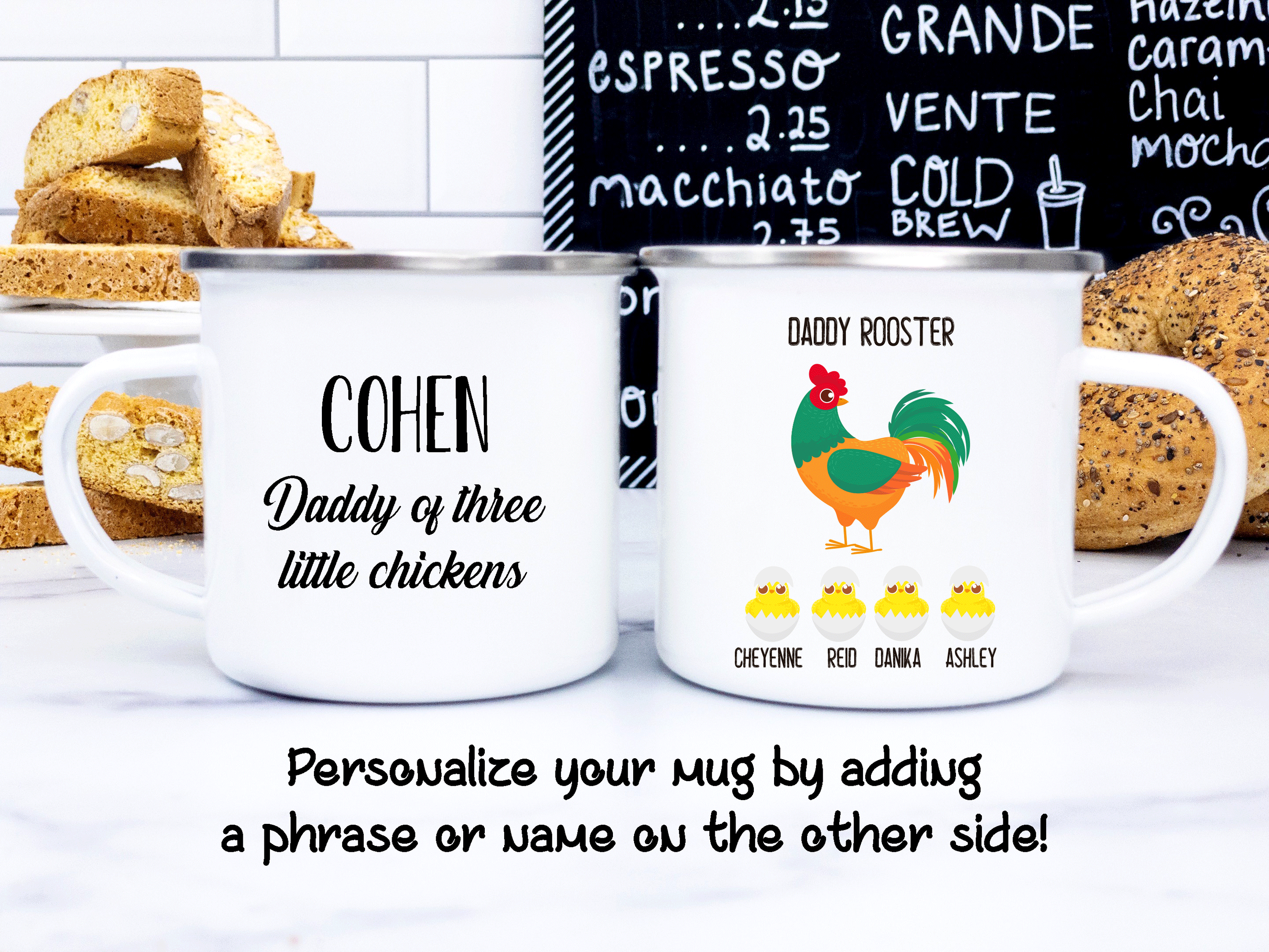 The baby chicken gift is a customized mug with a baby chicken and the name given to each child. Please, type the name(s) for each little chicken in the personalized box. By default, we will print your custom mug on both sides, and you can choose to put in the back a name, phrase, or both as in the pictures. Please help us by providing us with as much information as possible in the personalized text box. We will take care of the rest! This personalized mug is your perfect gift, so you get to design it as you wish!