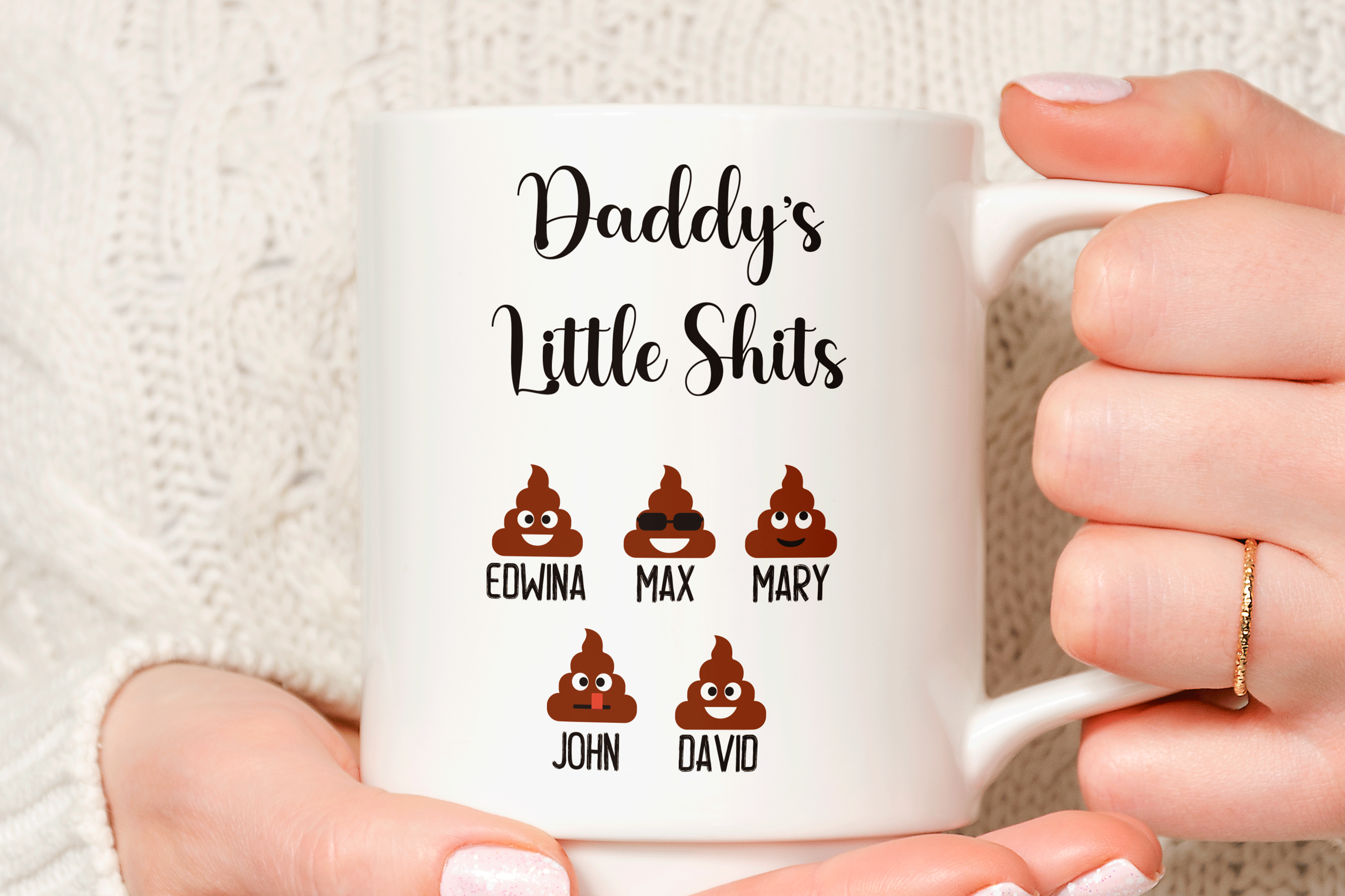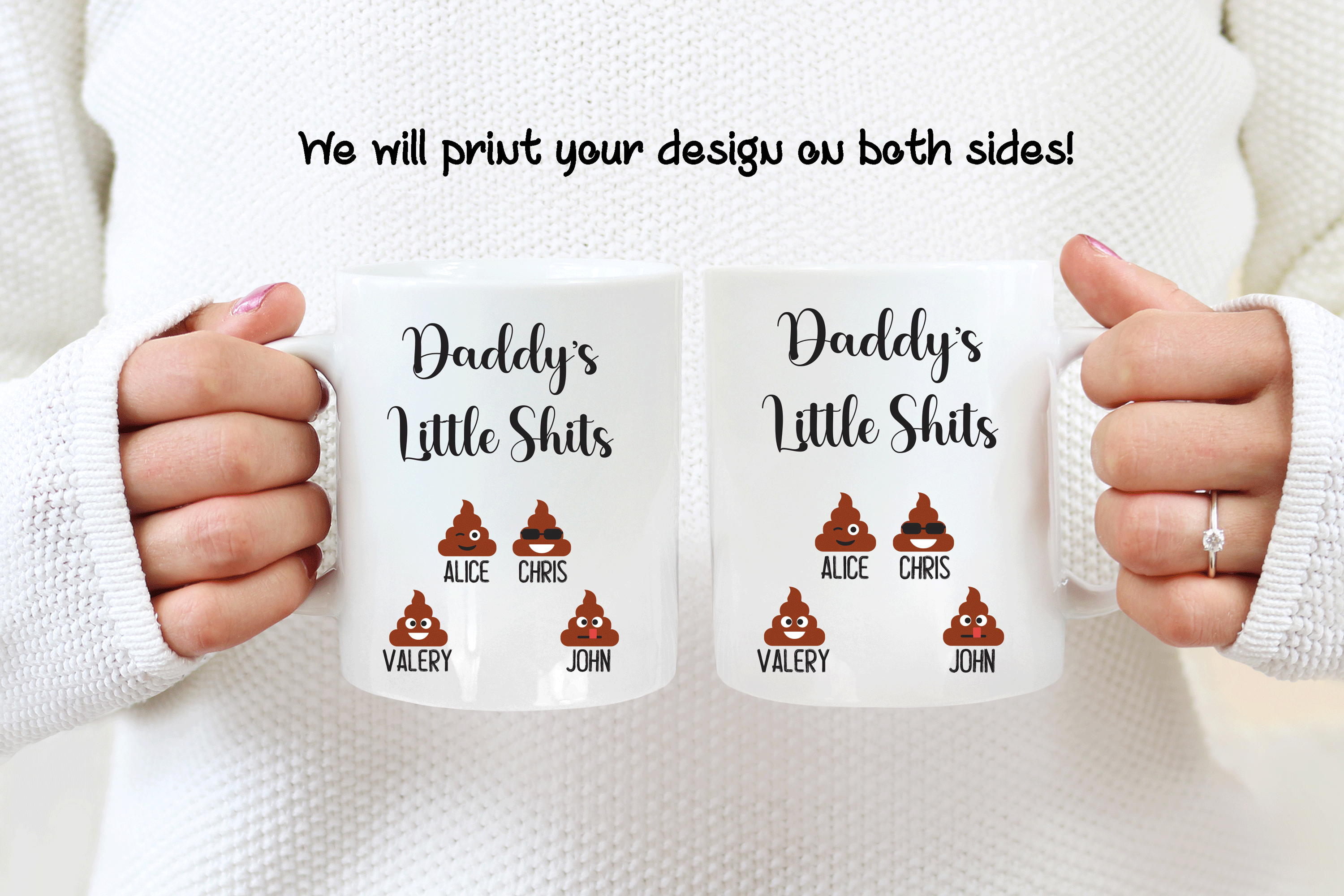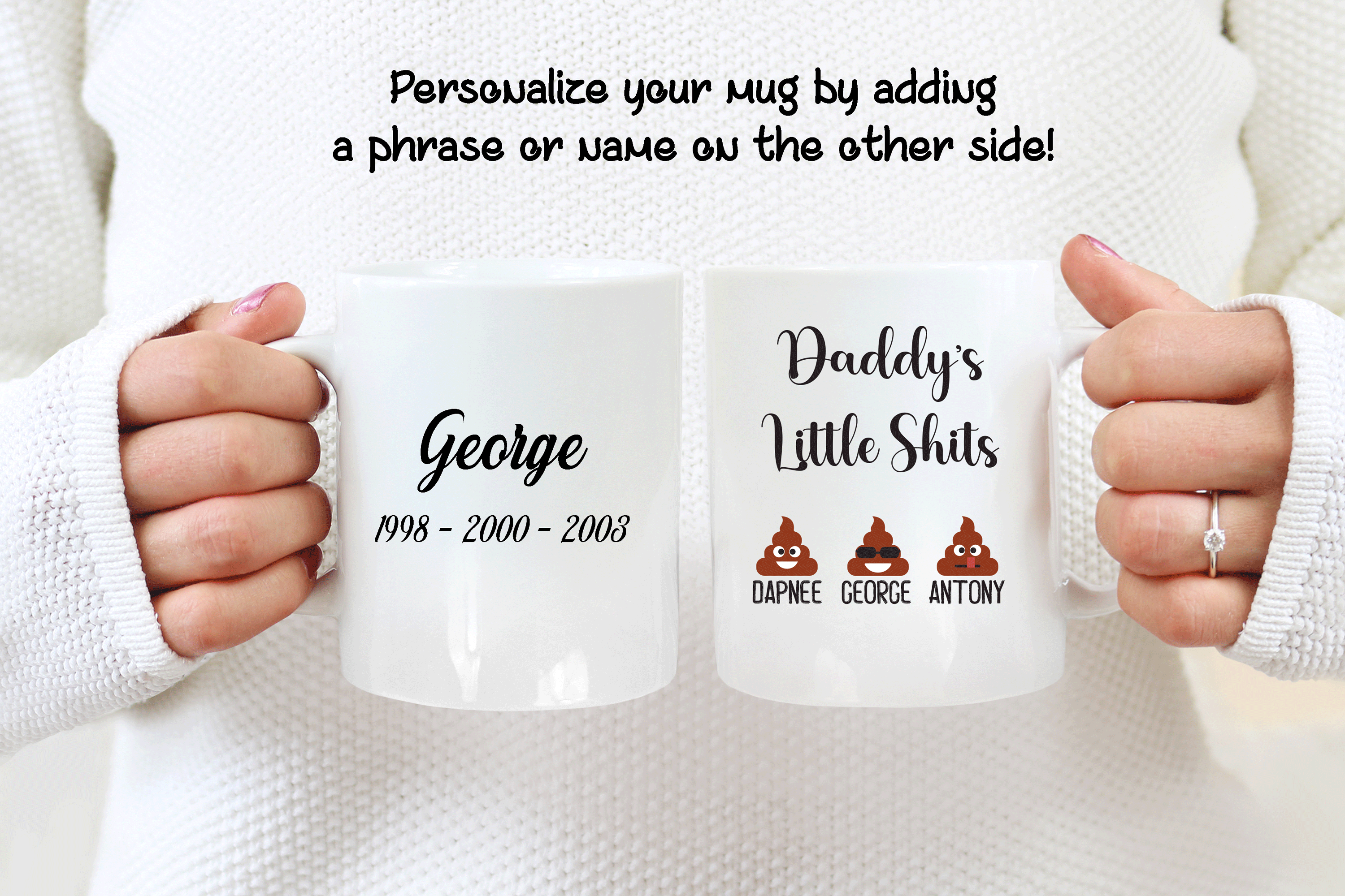By default, we will print your personalized mug on both sides. You can add to your custom gift a name, phrase, or both, on the mug’s back, as in the pictures. If you want to do it that way, please provide us with as much information as possible in the personalized text box. Please, type the name(s) followed by the emoji option in the personalized text box. We will take care of the rest! It’s your customized mug, so you get to design your gift for dad as you wish!