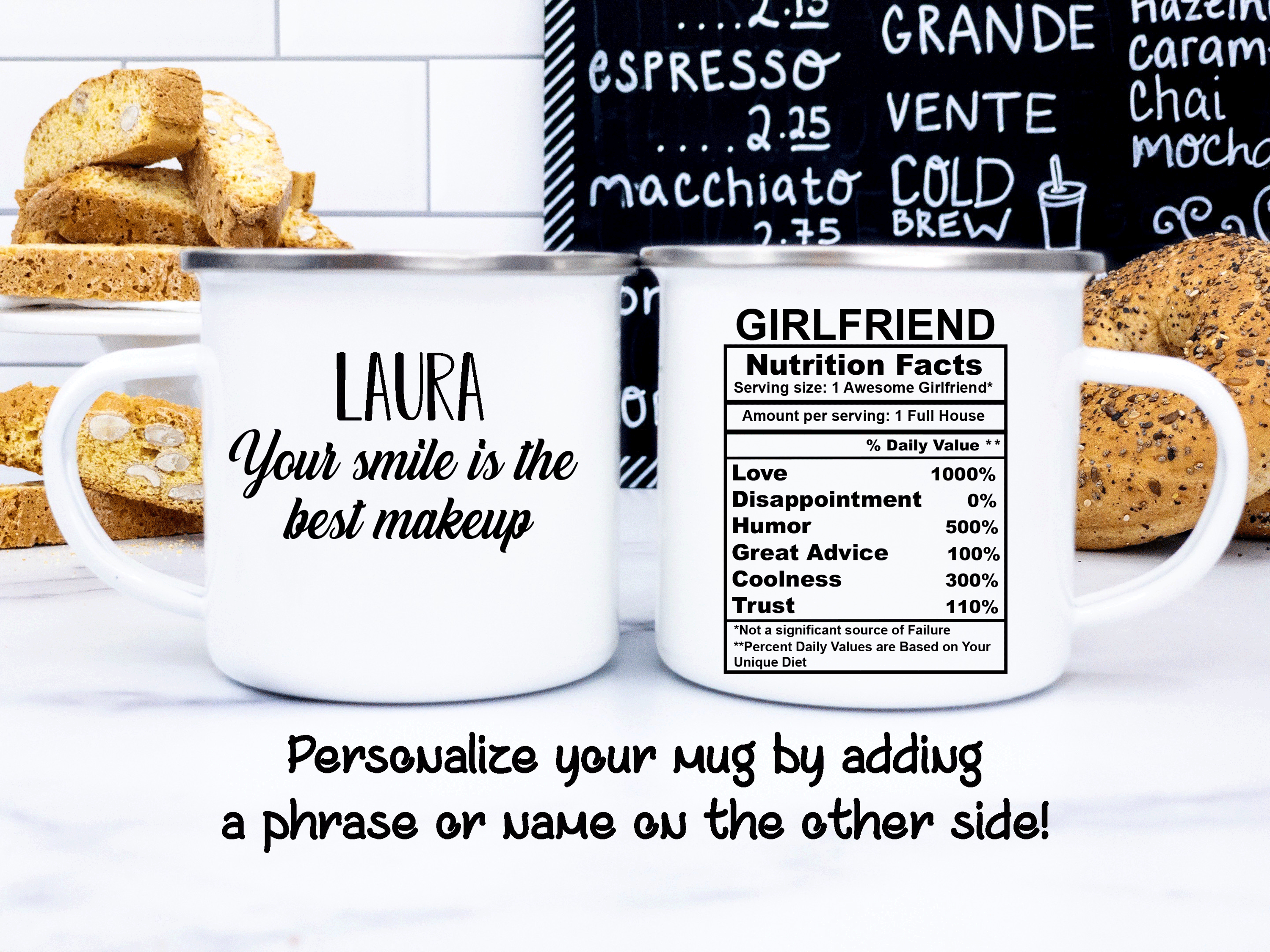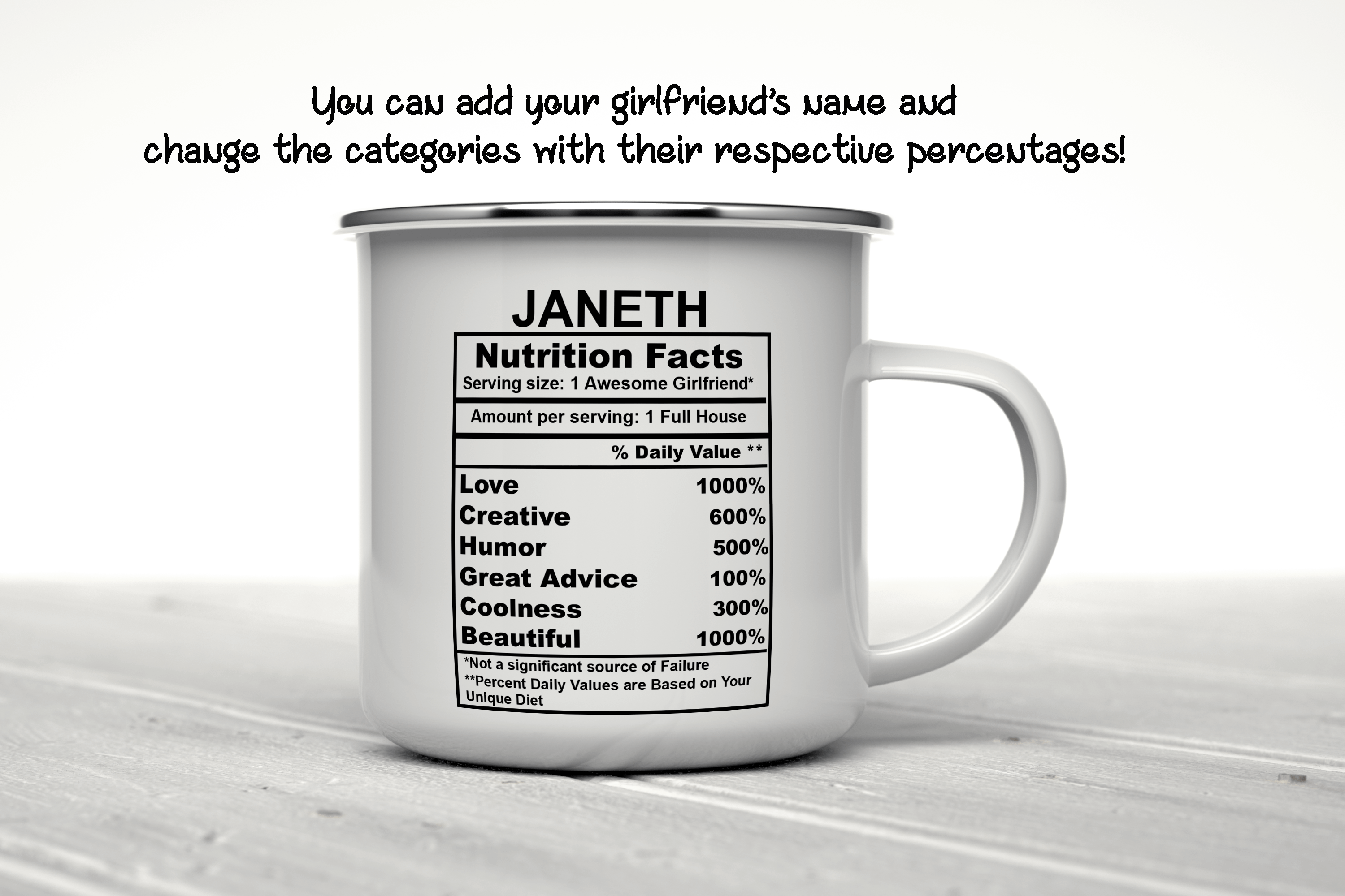 We will print your gift for girlfriend mug on both sides, and you can choose to put in the back a name, phrase, or both. And if you would like to do it, please specify the text and the typography number you want. By default, we will print the mug design on the main picture. If you choose to add a name or change the categories and their percentages, please provide us with as much information as possible in the personalized text box, and we will take care of the rest. It’s your perfect gift, so you get to design your gift for her as you wish!