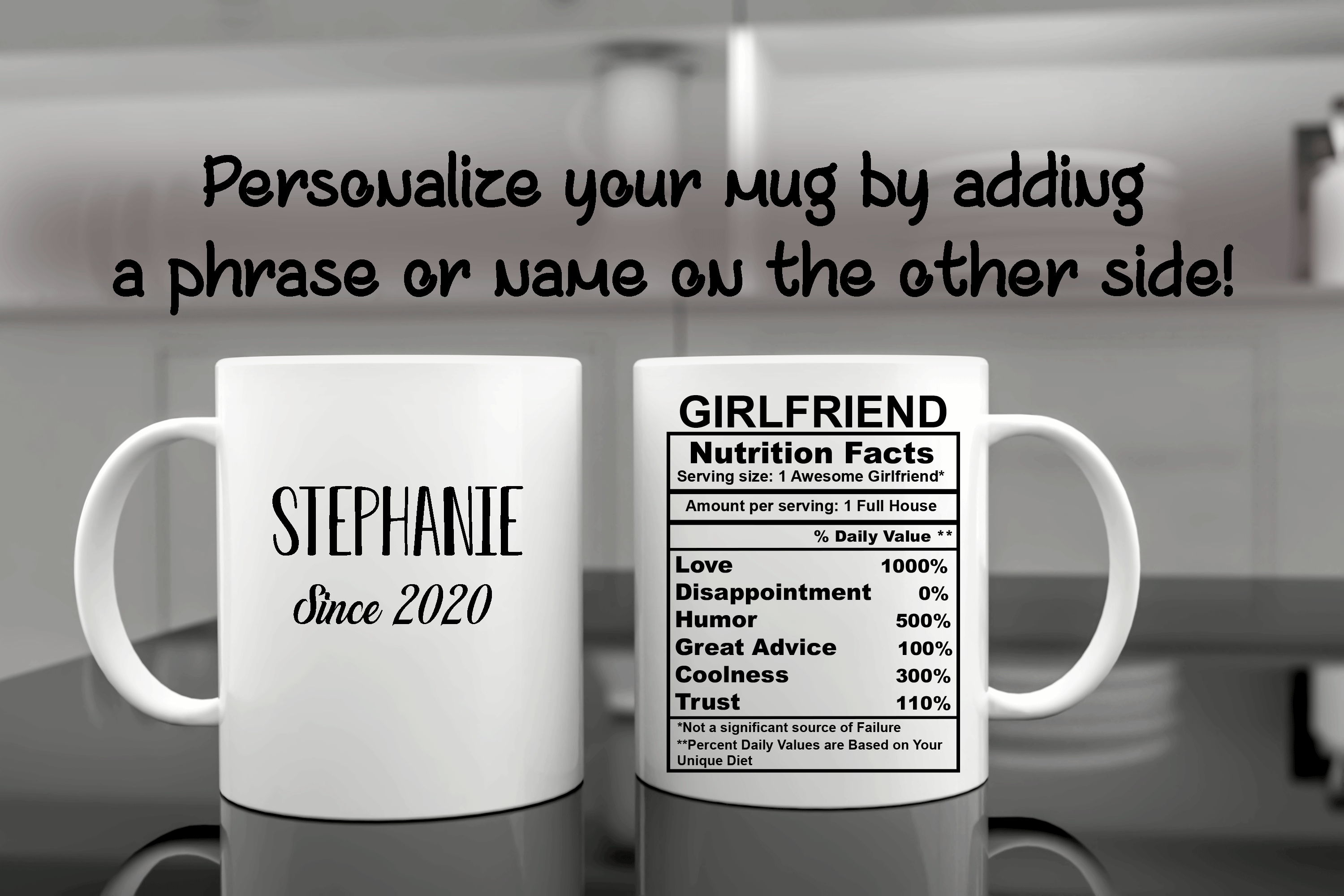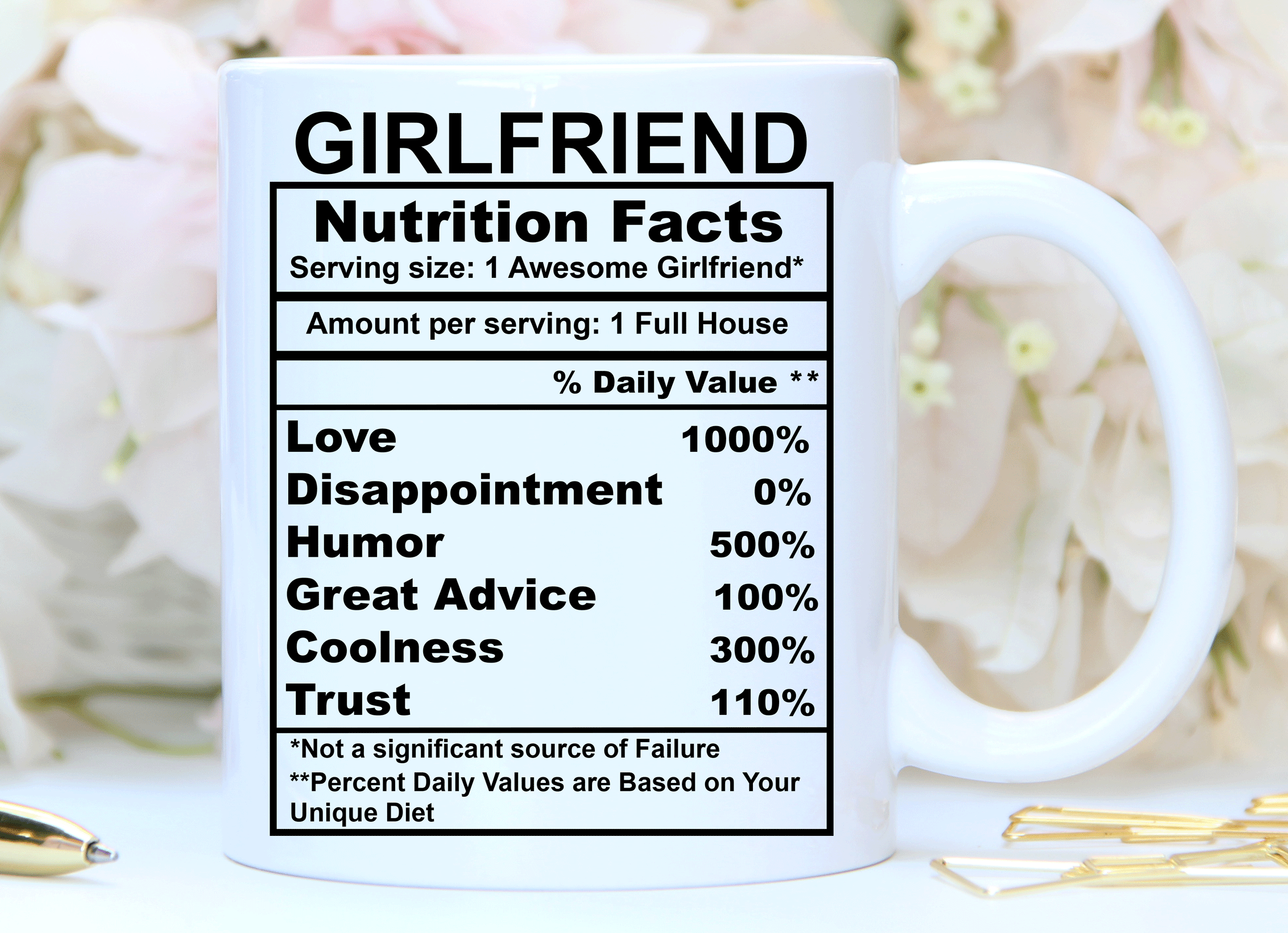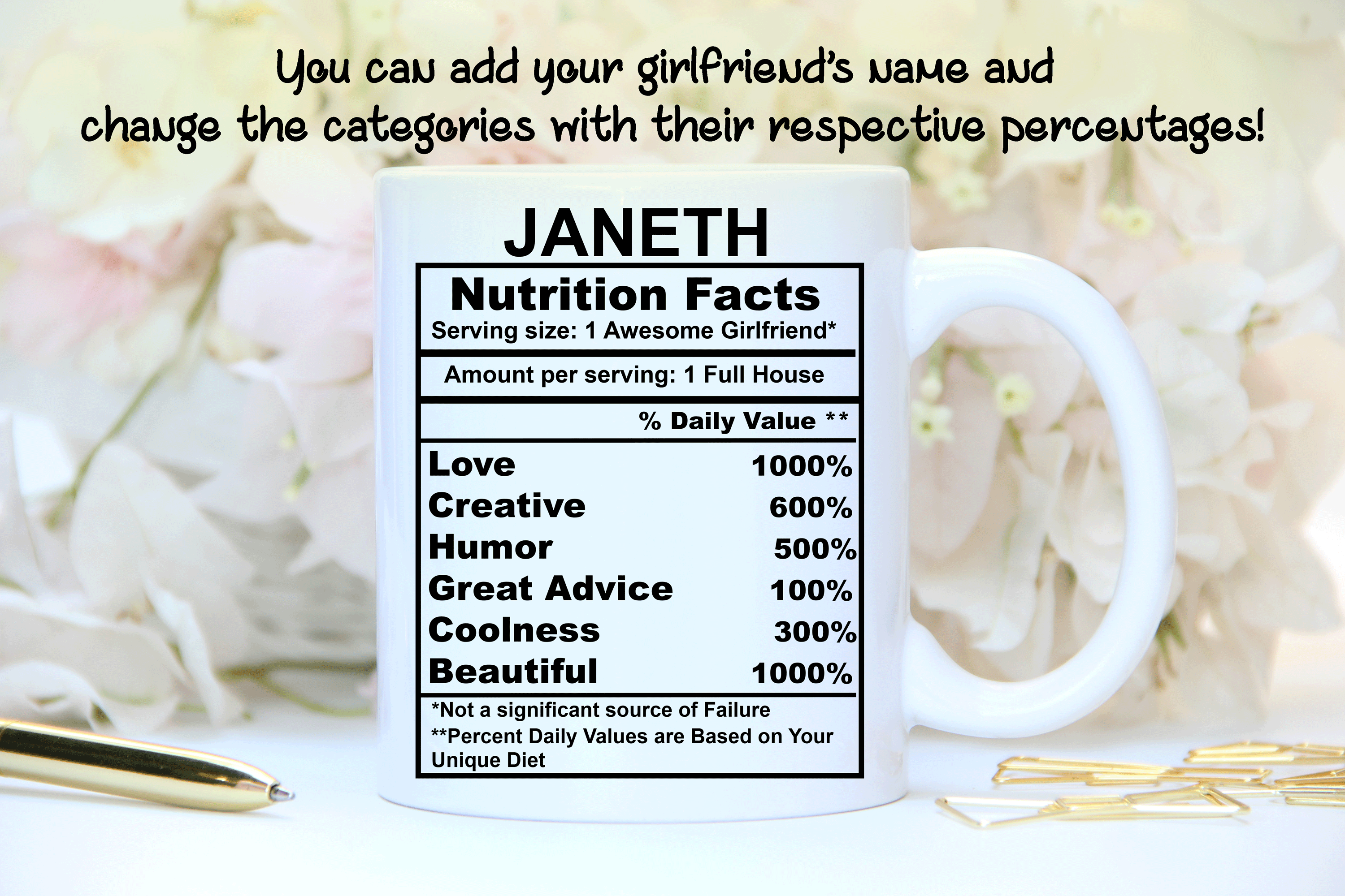 We will print your Valentine’s mug on both sides, and you can choose to put in the back a name, phrase, or both. By default, we will print the mug design on the main picture. If you want to add her name or change the categories and their percentages, please provide us with as much information as possible in the personalized text box. We will take care of the rest! It’s your perfect gift, so you design your girlfriend’s gift as you wish!