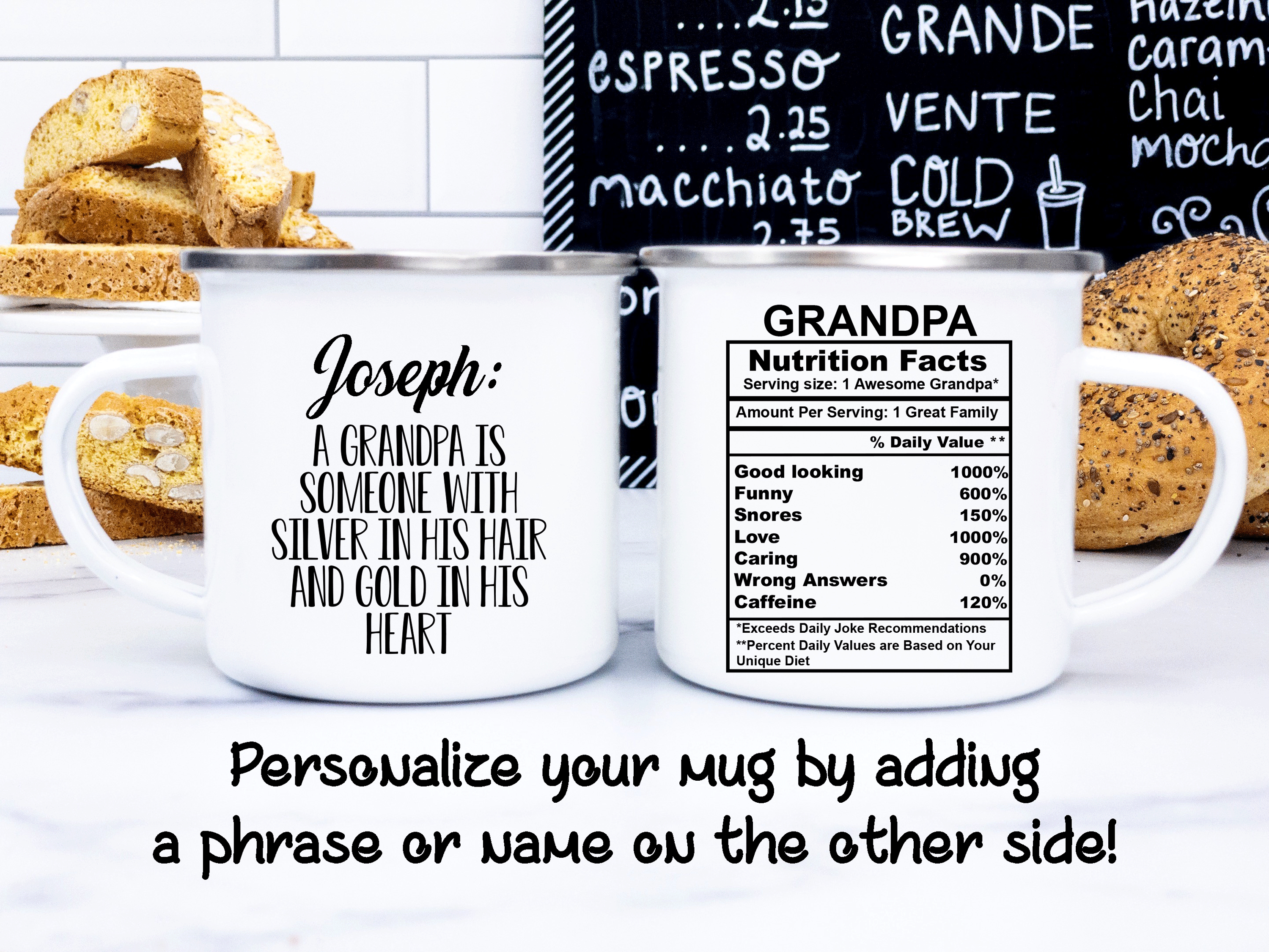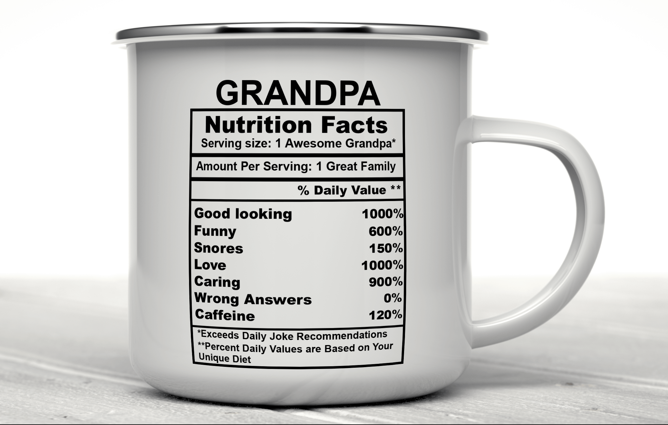 We will print your gift for grandpa mug on both sides, and you can choose to put in the back a name, phrase, or both. And if you would like to do it, please specify the text and the typography number you want. By default, we will print the mug design on the main picture. If you choose to add a name or change the categories and their percentages, please provide us with as much information as possible in the personalized text box, and we will take care of the rest. It’s your perfect gift, so you get to design your mug gift for grandfather as you wish!
