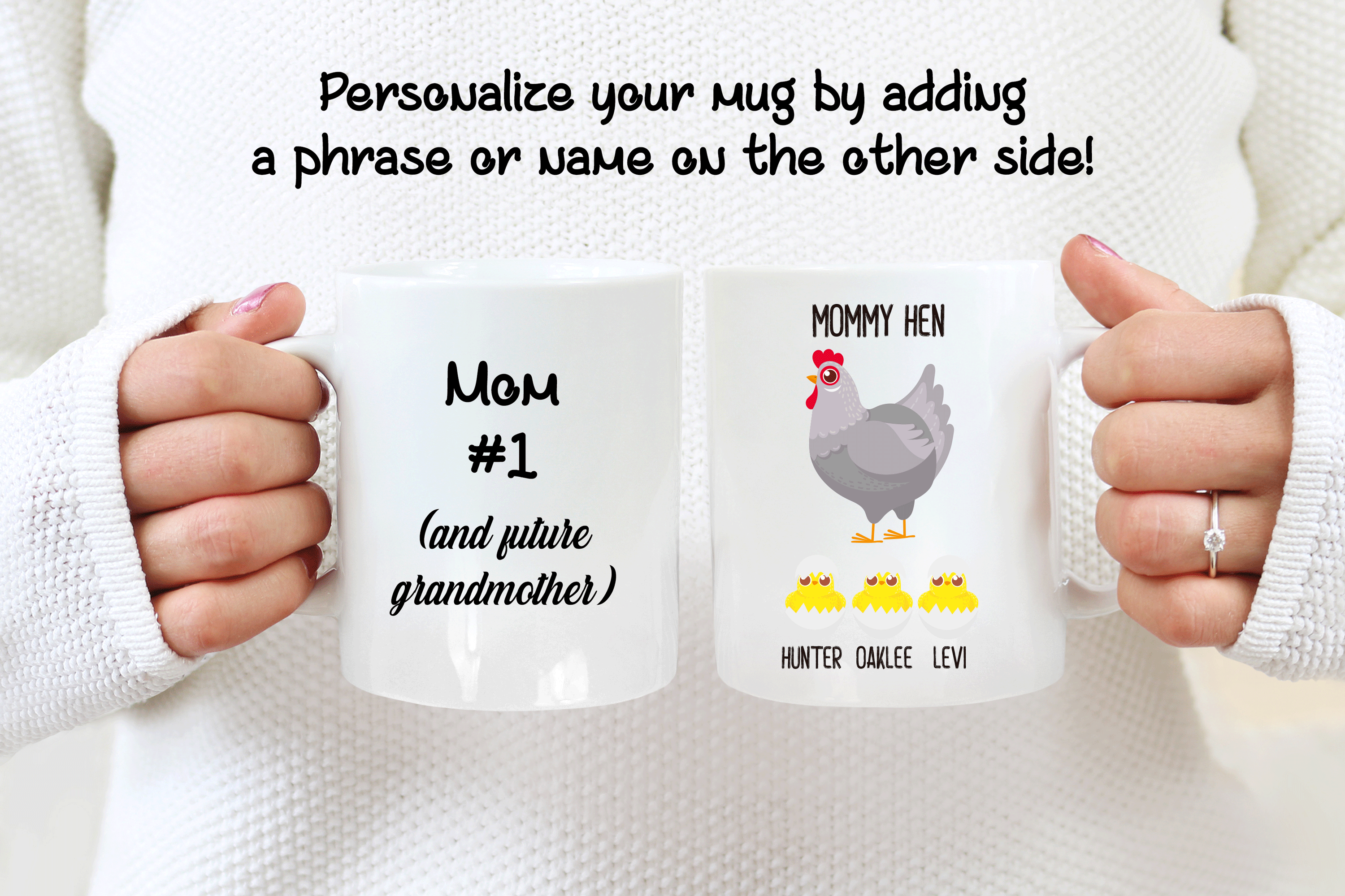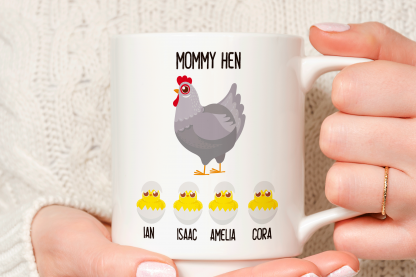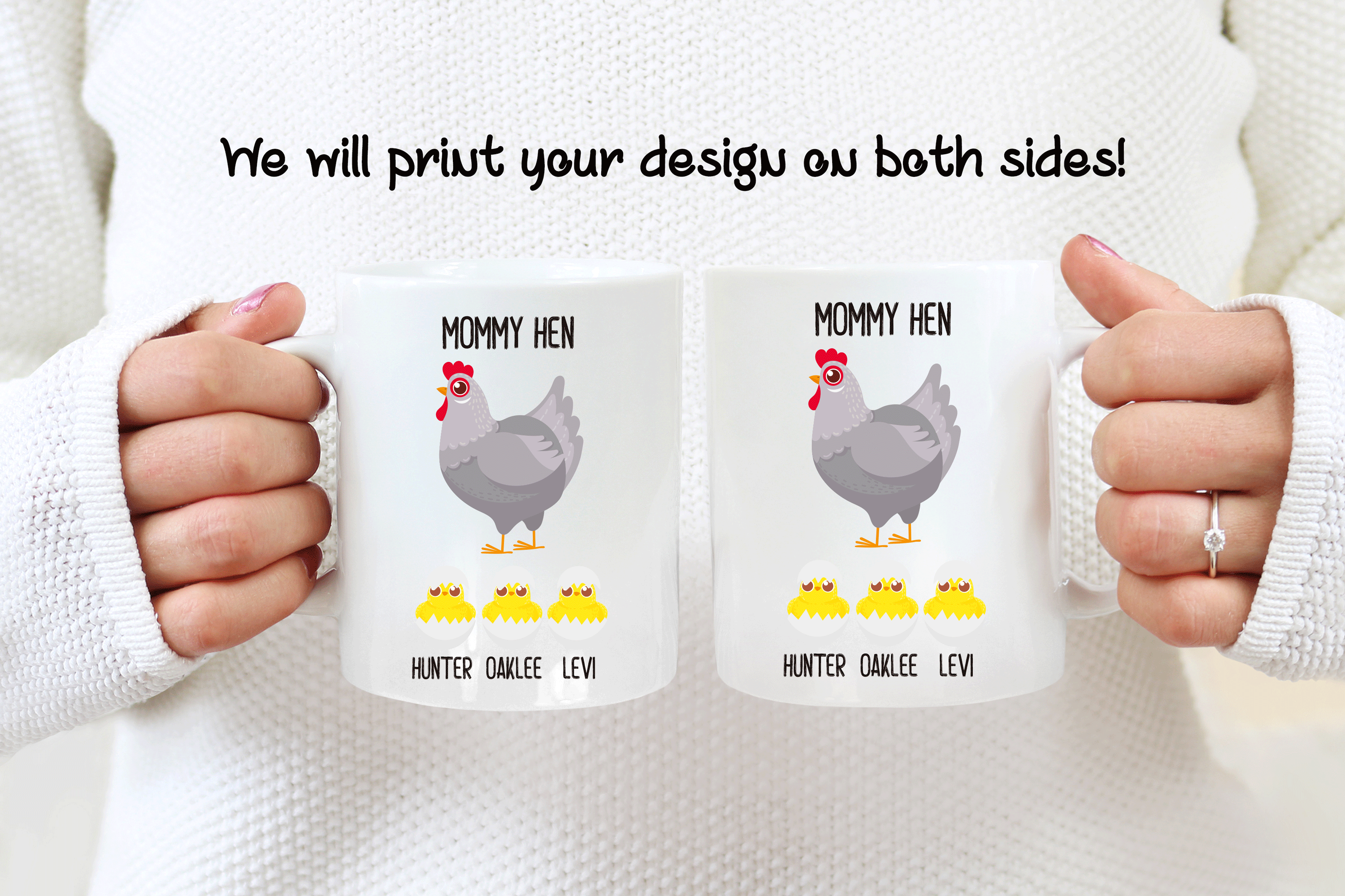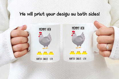 Our mommy chicken gift is a customized mug with a baby chicken and the name given to each child. Please, type the name(s) for each little chicken in the personalized box. By default, we will print your custom mug on both sides, and you can choose to put in the back a name, phrase, or both as in the pictures. Please help us by providing us with as much information as possible in the personalized text box. We will take care of the rest! This personalized mug is your funny gift, so you get to design it as you wish!