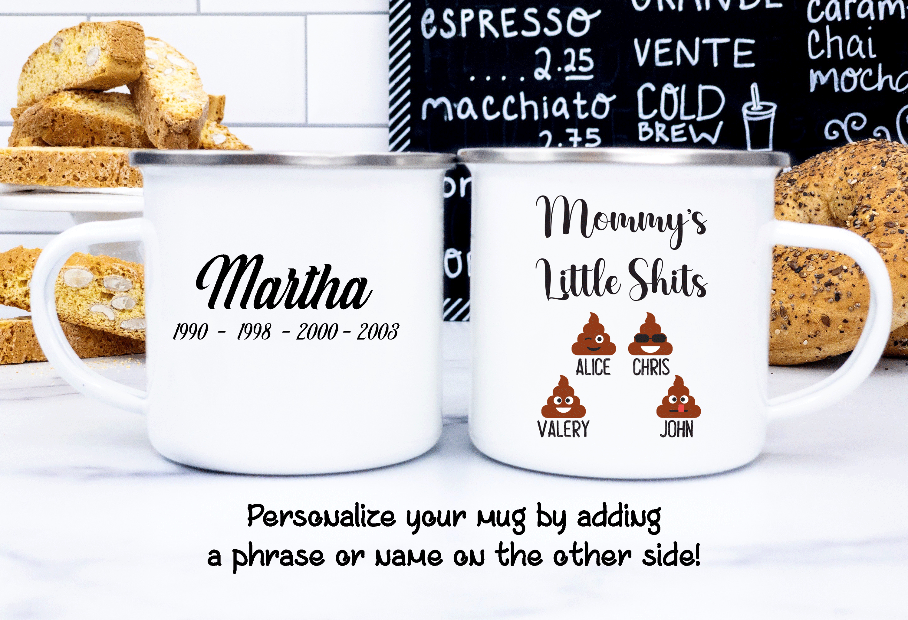 By default, we will print your personalized mug on both sides. You can add to your custom gift a name, phrase, or both, on the mug’s back, as in the pictures. If you want to do it that way, please provide us with as much information as possible in the personalized text box. Please, type the name(s) followed by the emoji option in the personalized text box. We will take care of the rest! It’s your customized mug, so you get to design your gift for mom as you wish!
