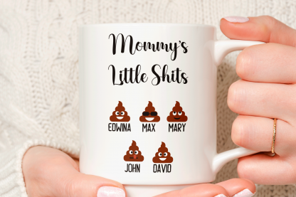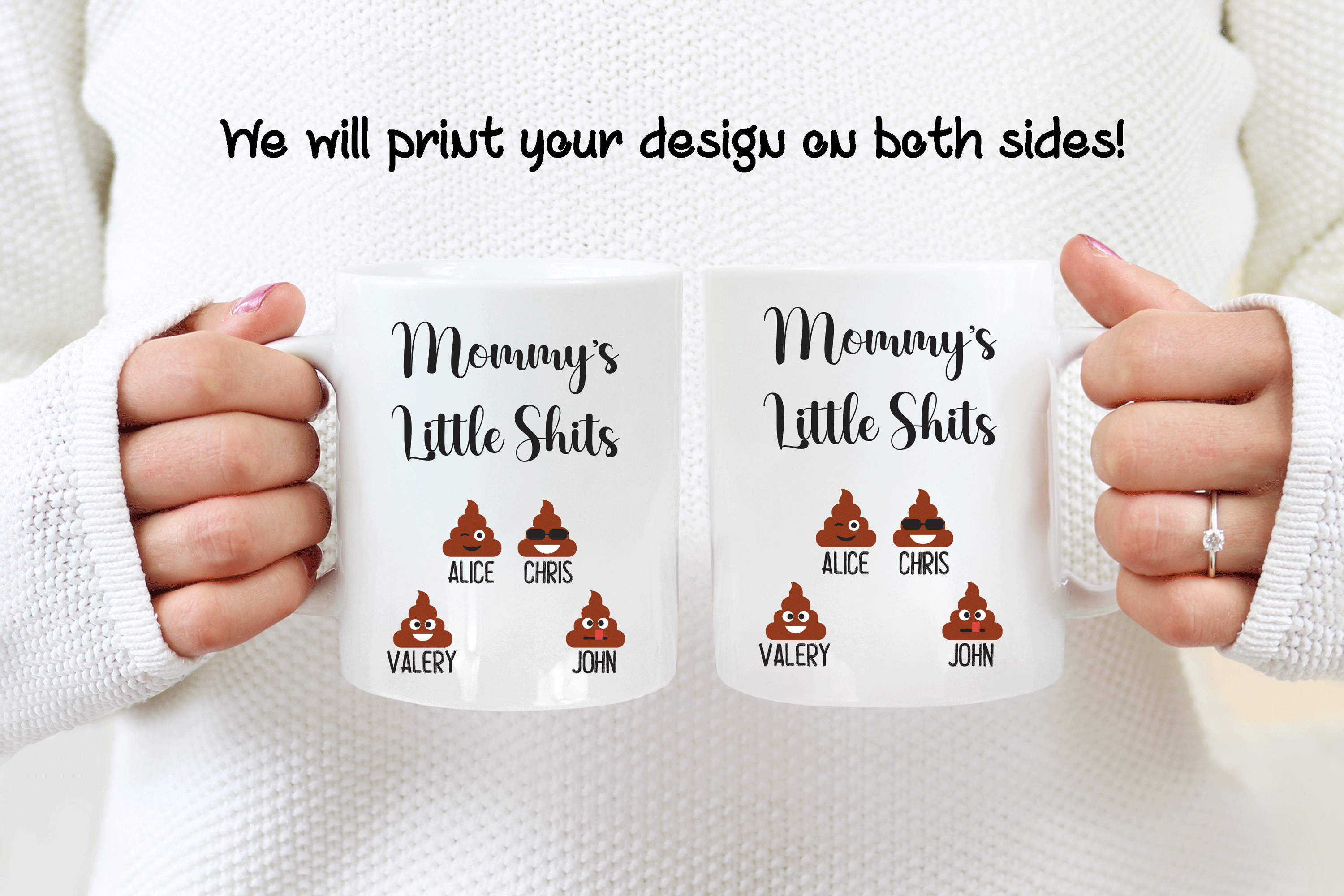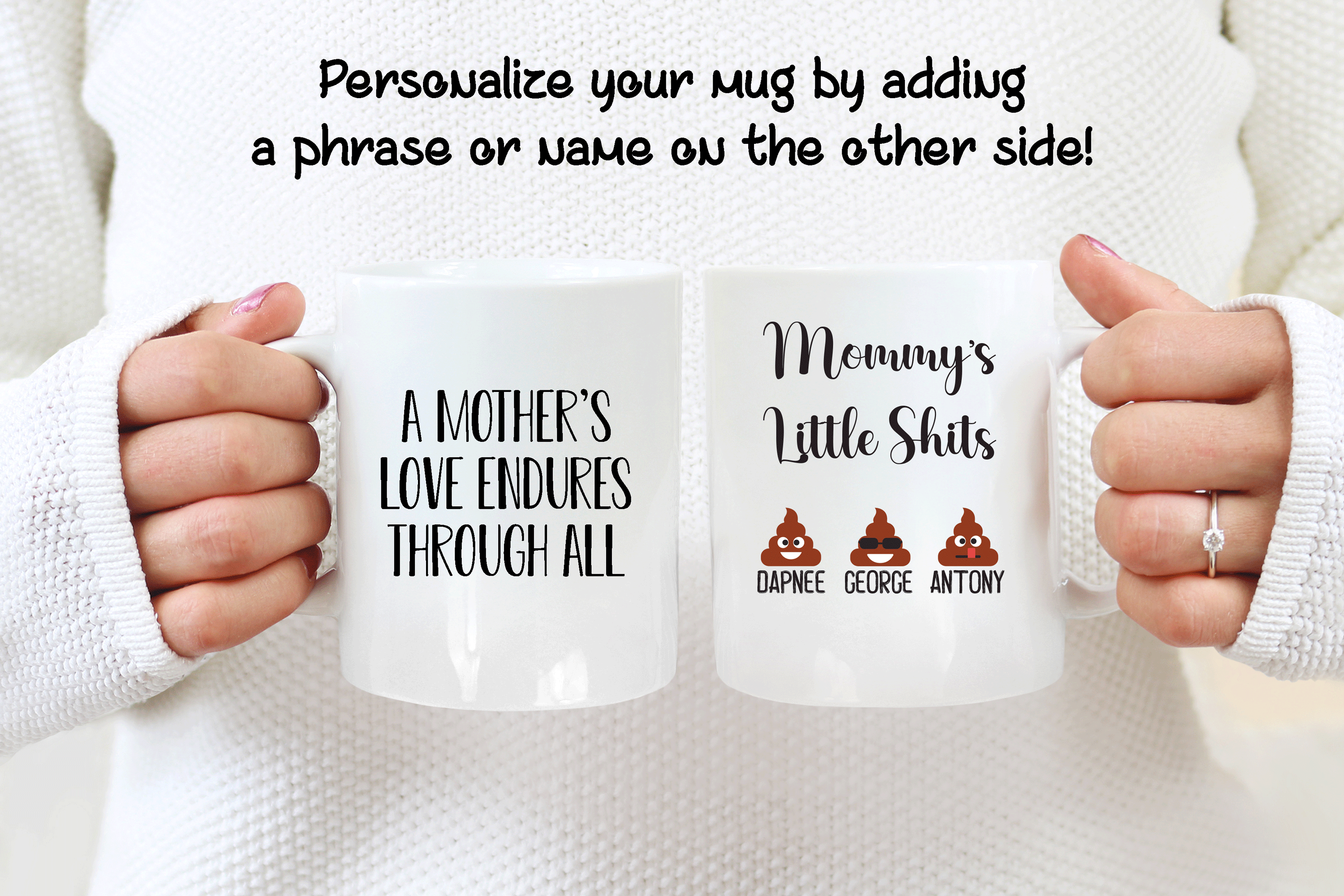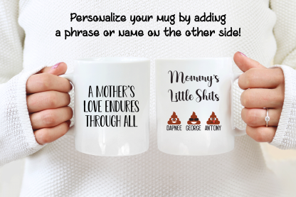 By default, we will print your personalized mug on both sides. You can add to your custom gift a name, phrase, or both, on the mug’s back, as in the pictures. If you want to do it that way, please provide us with as much information as possible in the personalized text box. Please, type the name(s) followed by the emoji option in the personalized text box. We will take care of the rest! It’s your customized mug, so you get to design your gift for mom as you wish!