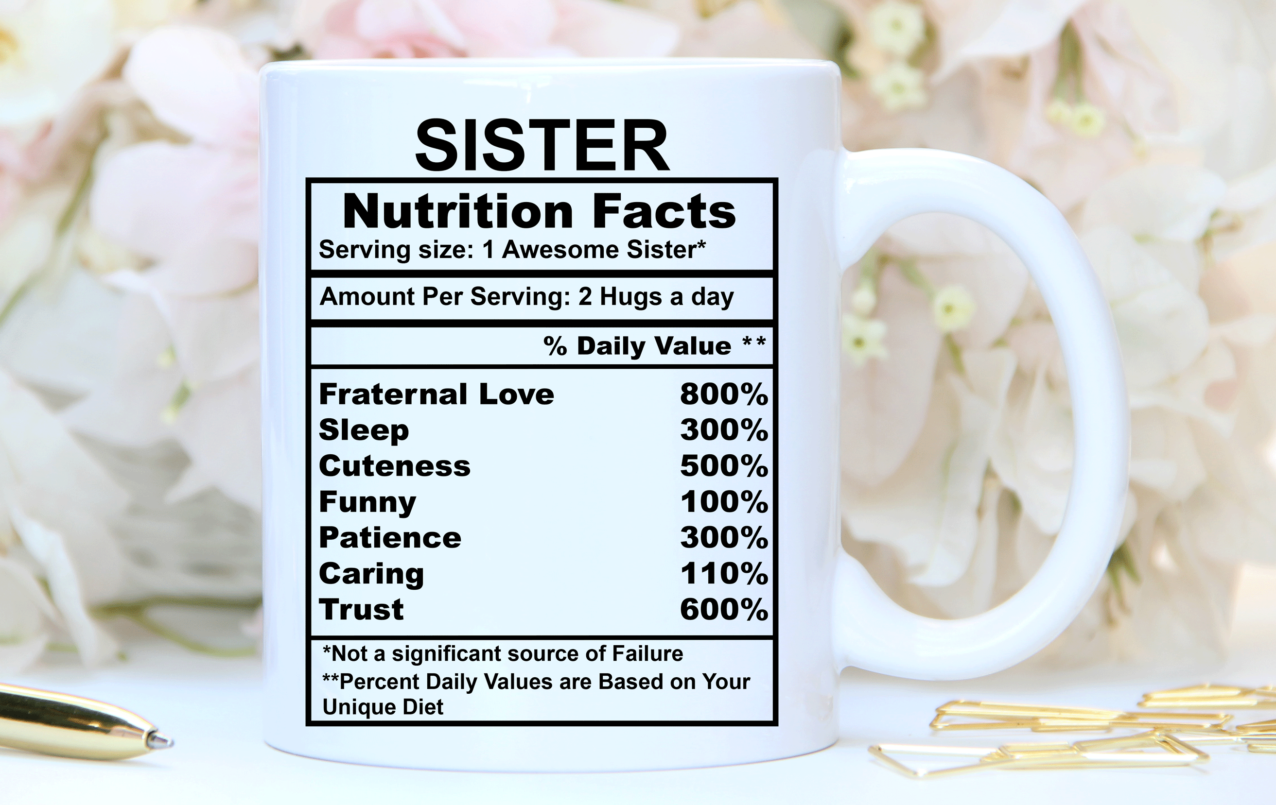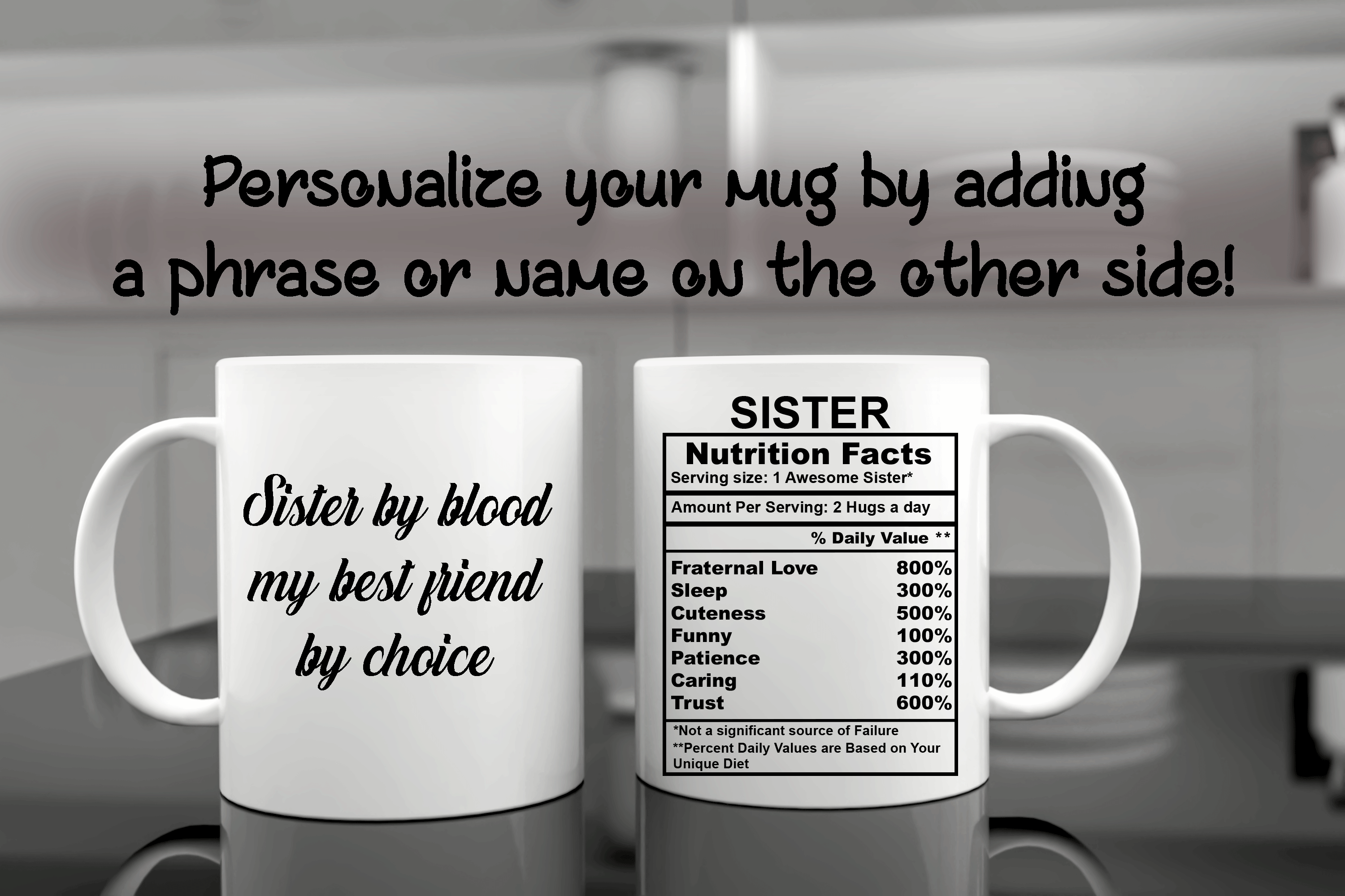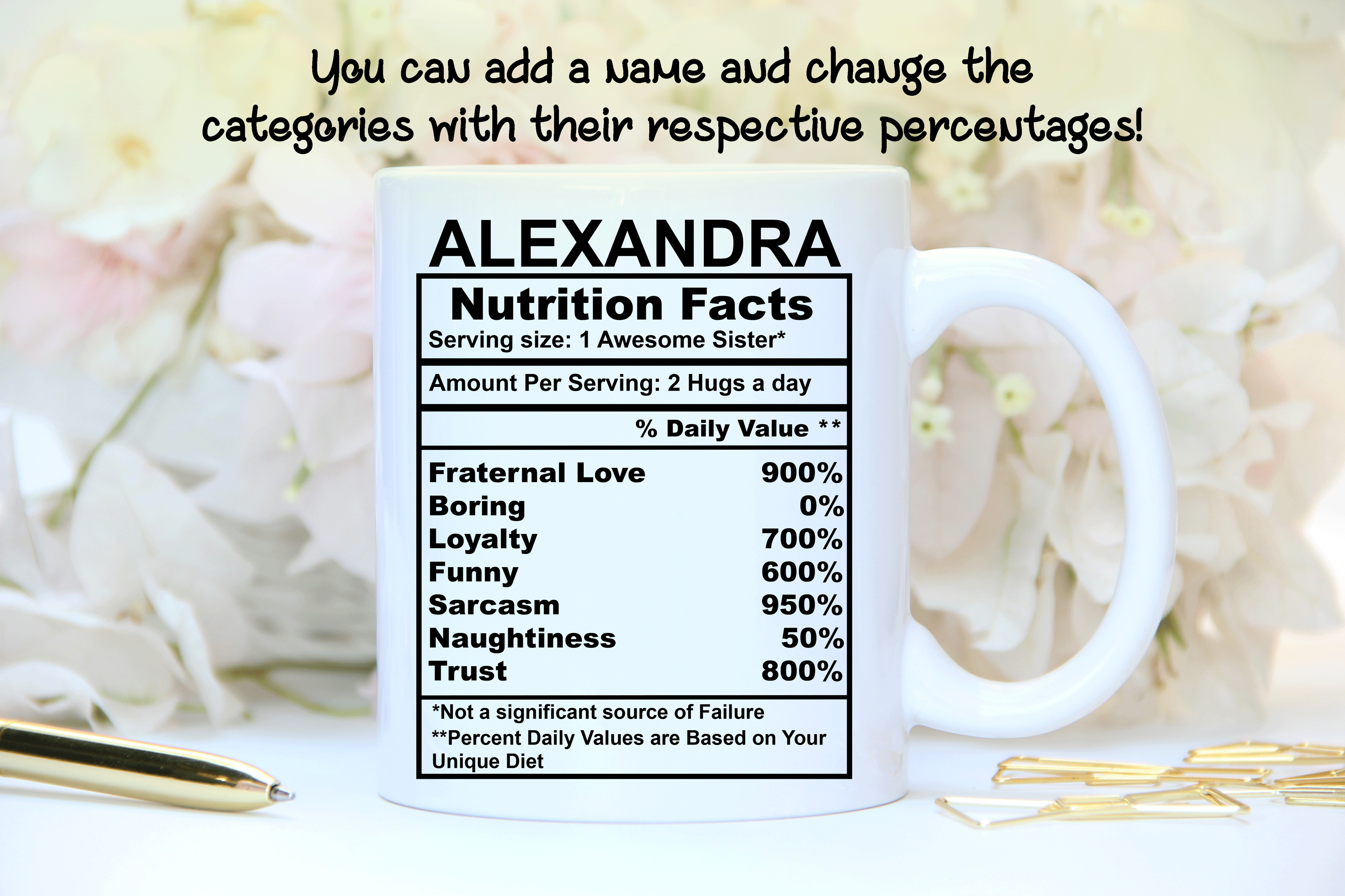 We will print your gift for sister mug on both sides, and you can choose to put in the back a name, phrase, or both. And if you would like to do it, please specify the text and the typography number you want. By default, we will print the mug design on the main picture. If you choose to add a name or change the categories and their percentages, please provide us with as much information as possible in the personalized text box. We will take care of the rest! It’s your custom gift, so you design your sister’s gift as you wish!