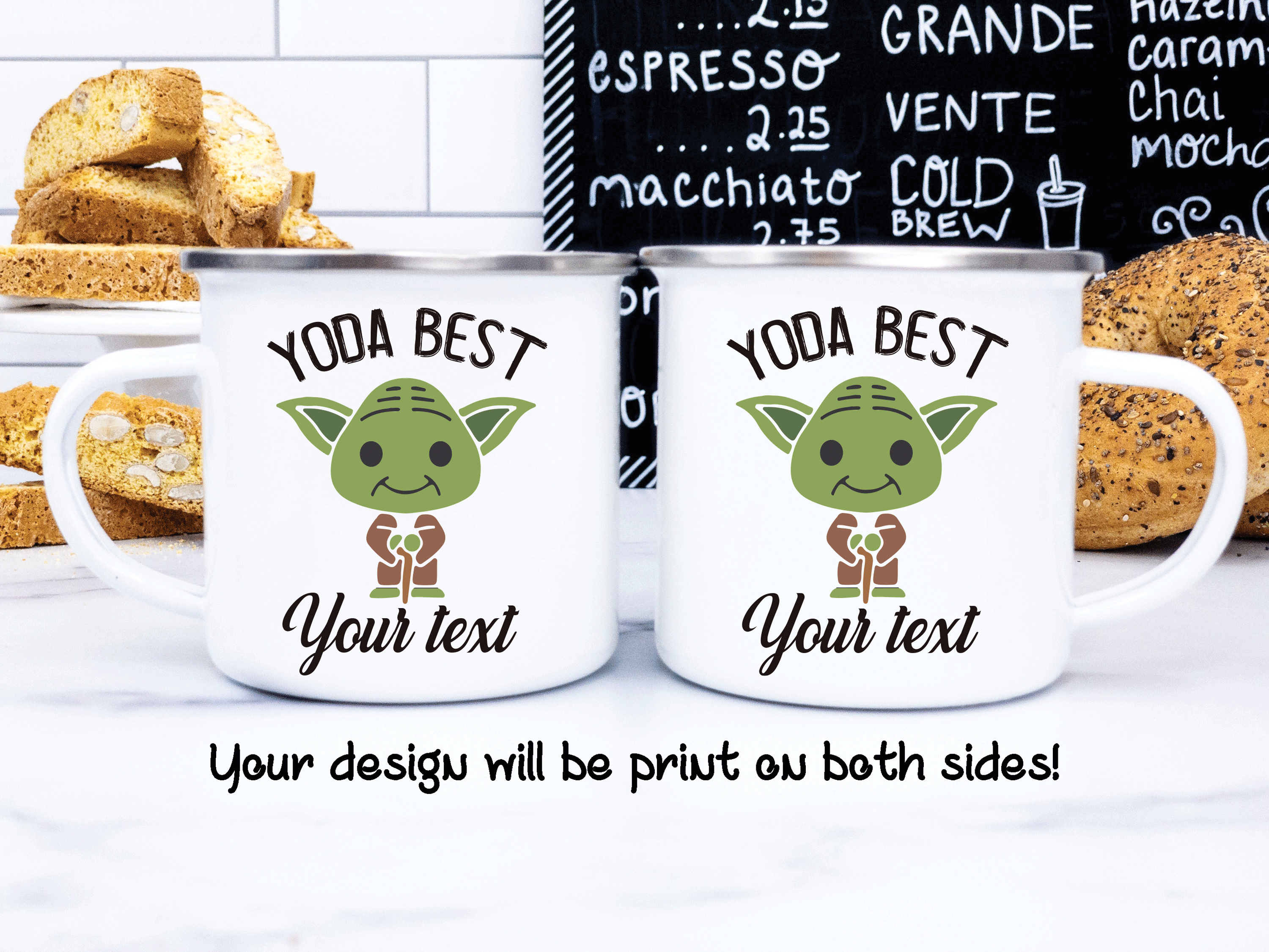 By default, we will be printing your custom Yoda mug on both sides, and you can choose to put in the back a name, phrase, or both as in the pictures. Please help us by providing us with as much information as possible in the personalized text box, and we will take care of the rest. This baby Yoda gift is your personalized mug, so you get to design your Star Wars mug as you wish!