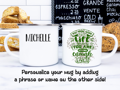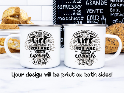 "You were given this life...", inspirational mug, personalized enamel mug quantity